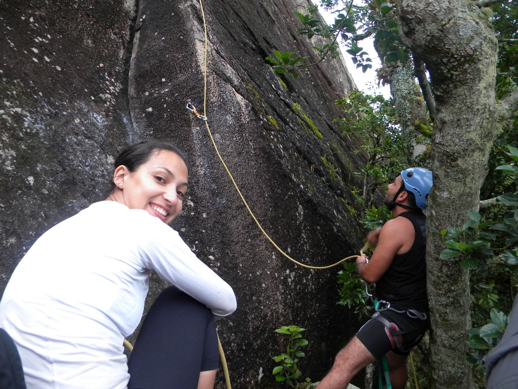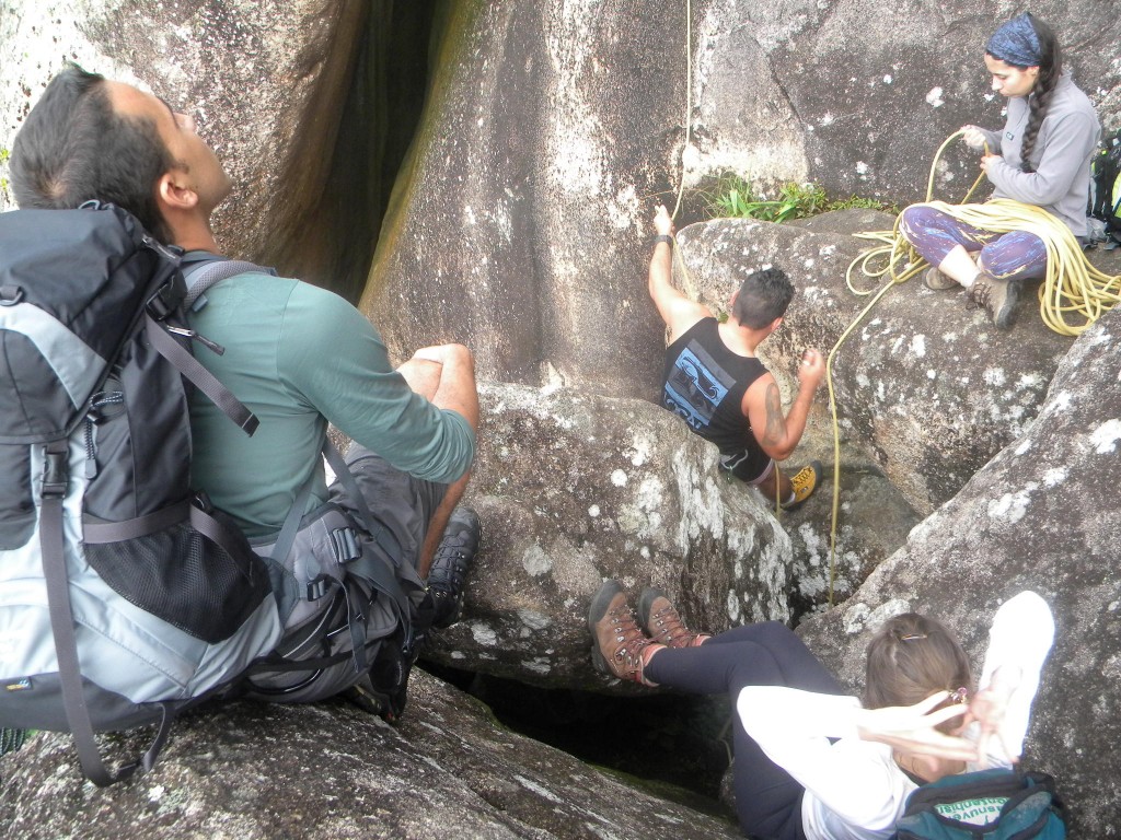 Meu primo Vinicius que não escalava a mais de dez anos nos acompanhou neste dia, também a Greissy, nossa amiga de caminhada e seu namorado Lucas que estava indo a primeira vez para montanha. O Anhangava também é um lugar que sempre se encontra colegas e amigos, por lá também encontramos Pedro Hauk, Camila, Caroline e também meu parceiro de várias roubadas, Otaviano.