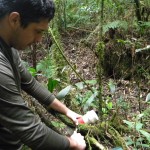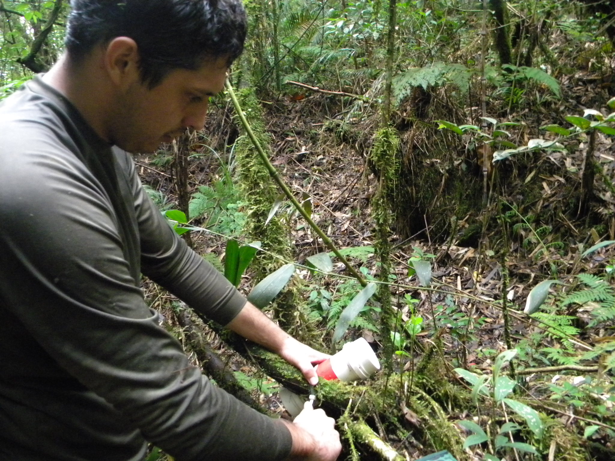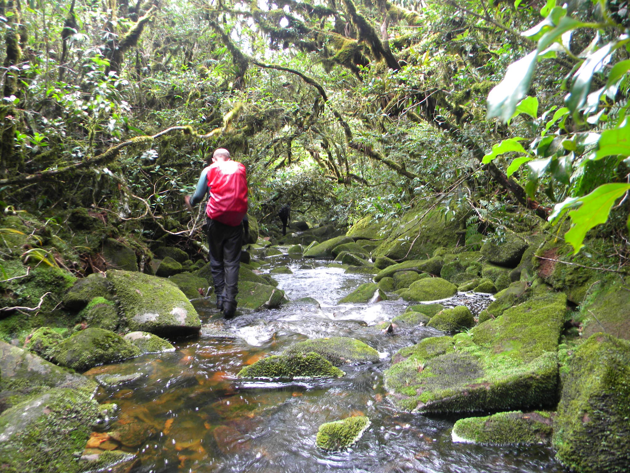 nosso próximo objetivo que era a Garganta do Arapongas. A partir desse trecho até a garganta, a caminhada é apenas pelos rios, entra-se em um vale pequeno, depois em outro um pouco maior e prossegue assim até chegarmos em frente da garganta, nesse ponto precisamos sair do rio e seguir pela mata. Encontramos algumas fitas nossas que tínhamos colocado há algum tempo que nos ajudou bastante, pois o rastro da trilha já havia desaparecido.
