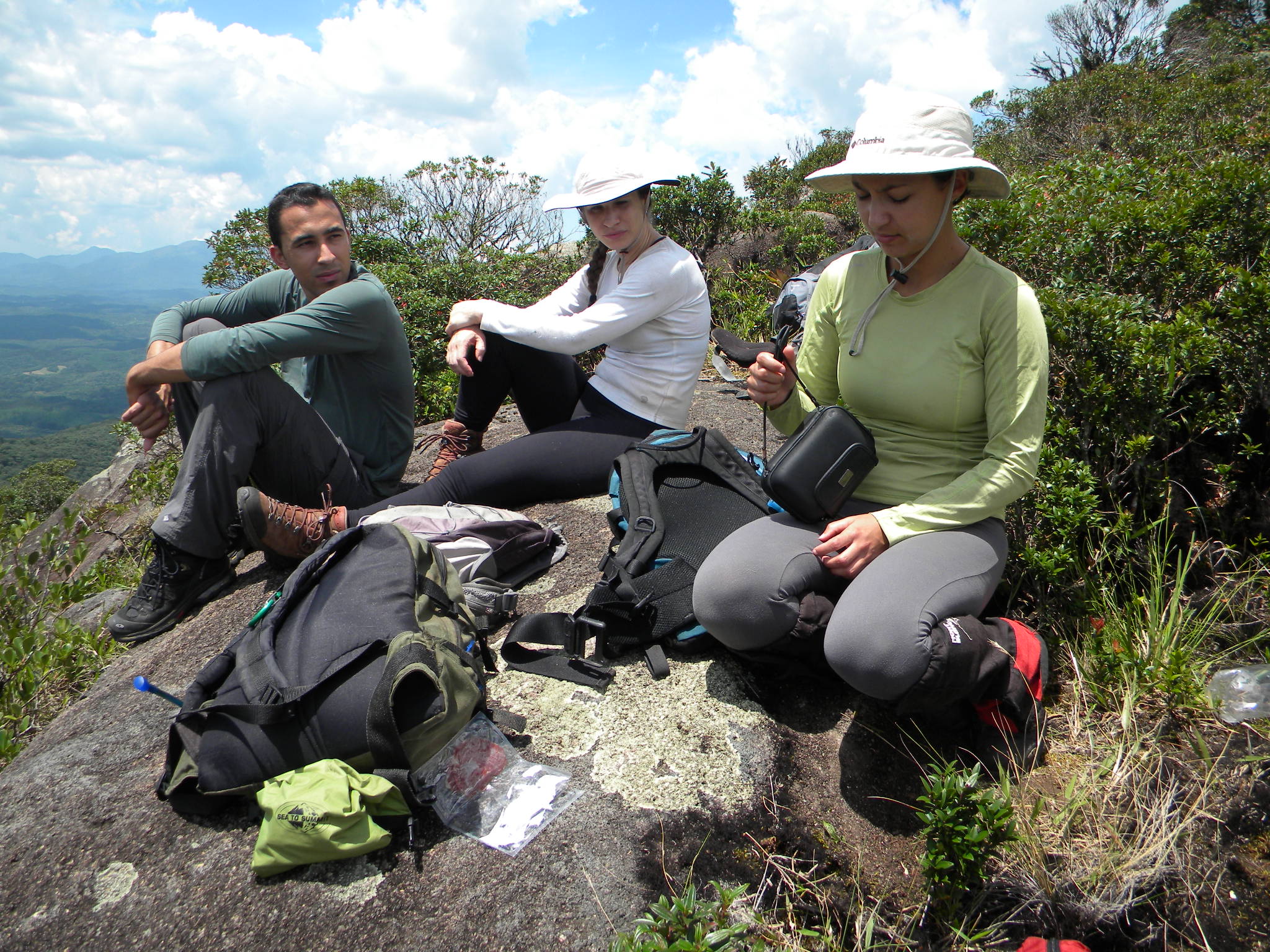 Calor, muito calor, foi por isso que sofremos para chegar no cume do Corvo. Eu, Michelle, Greissy, Lucas e Vinicius fomos dar uma caminhada para o lado de traz do Anhangava. A subida até o cume do Anhangava é bem tranqüila, de lá é preciso conhecer a entrada da trilha que leva ao Corvo. No inicio da trilha tínhamos colocado uma fita para se orientar nas próximas vezes que quiséssemos andar por aquela região ou alguém que quisesse conhecer um lugar diferente e tão perto, o problema é que algum Ecochato tirou quase toda a sinalização que tínhamos feito a um ano atrás… O engraçado é que no fundo do vale onde tem um banbuzal bem fechado, ninguém mais passou, e a partir desse ponto as marcações continuavam intactas…