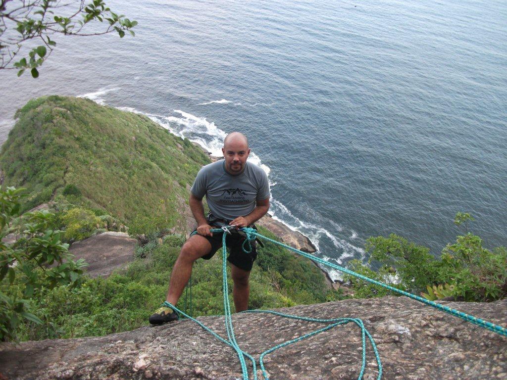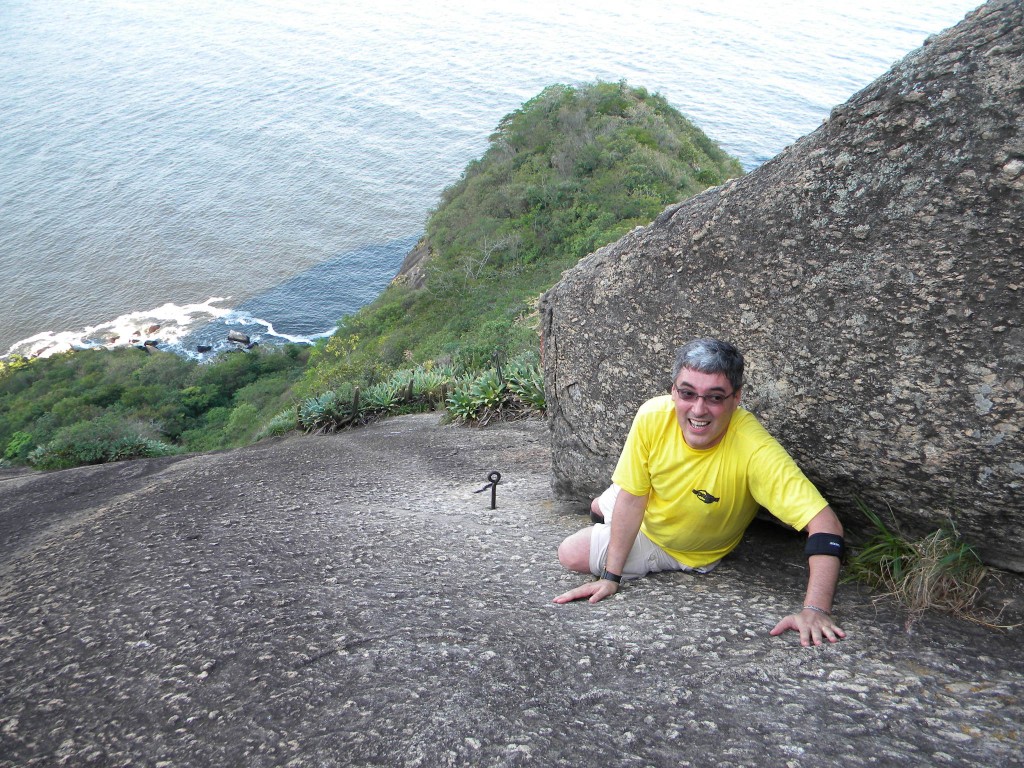 A reunião com o Inmetro durou um pouco depois do almoço, corremos para o hotel pegar os equipamentos e ir para o Pão de Açúcar. Como estávamos em Copacabana, o deslocamento foi rápido. Começamos a caminhar próximo das 3 horas da tarde, eu estava levando o Jair para fazer o Costão na face leste da montanha. Para quem não conhece o Costão, é uma escalaminhada, a maior parte da via sobe caminhando, passa por algumas aderências e tem um trecho curto de escalada técnica, mesmo não apresentando um nível técnico muito alto para fazer o Pão de Açúcar por essa via, o risco de morte não é completamente descartado, pois já se teve acidentes fatais nesse caminho.