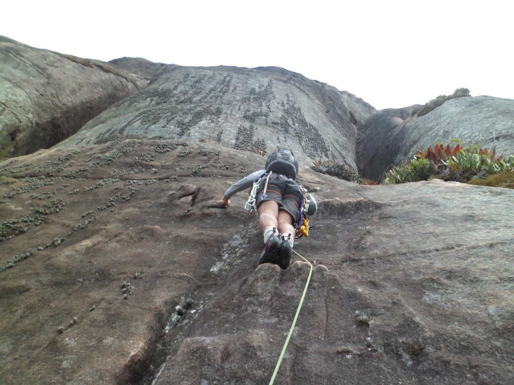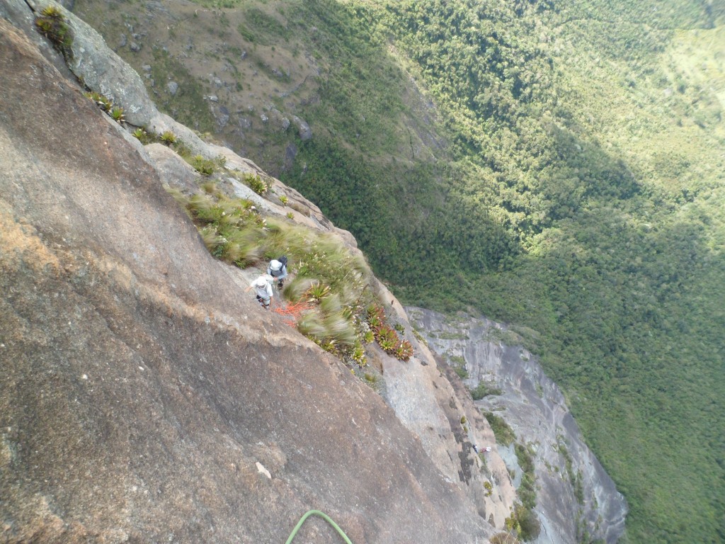 Até a primeira chaminé não tivemos nenhuma cordada exigente, apenas cordadas expostas, pouca proteção fixa e a grande dificuldade que muitos reclamam: a orientação da via. Só eu me perdi umas 3 vezes em quanto guiava.