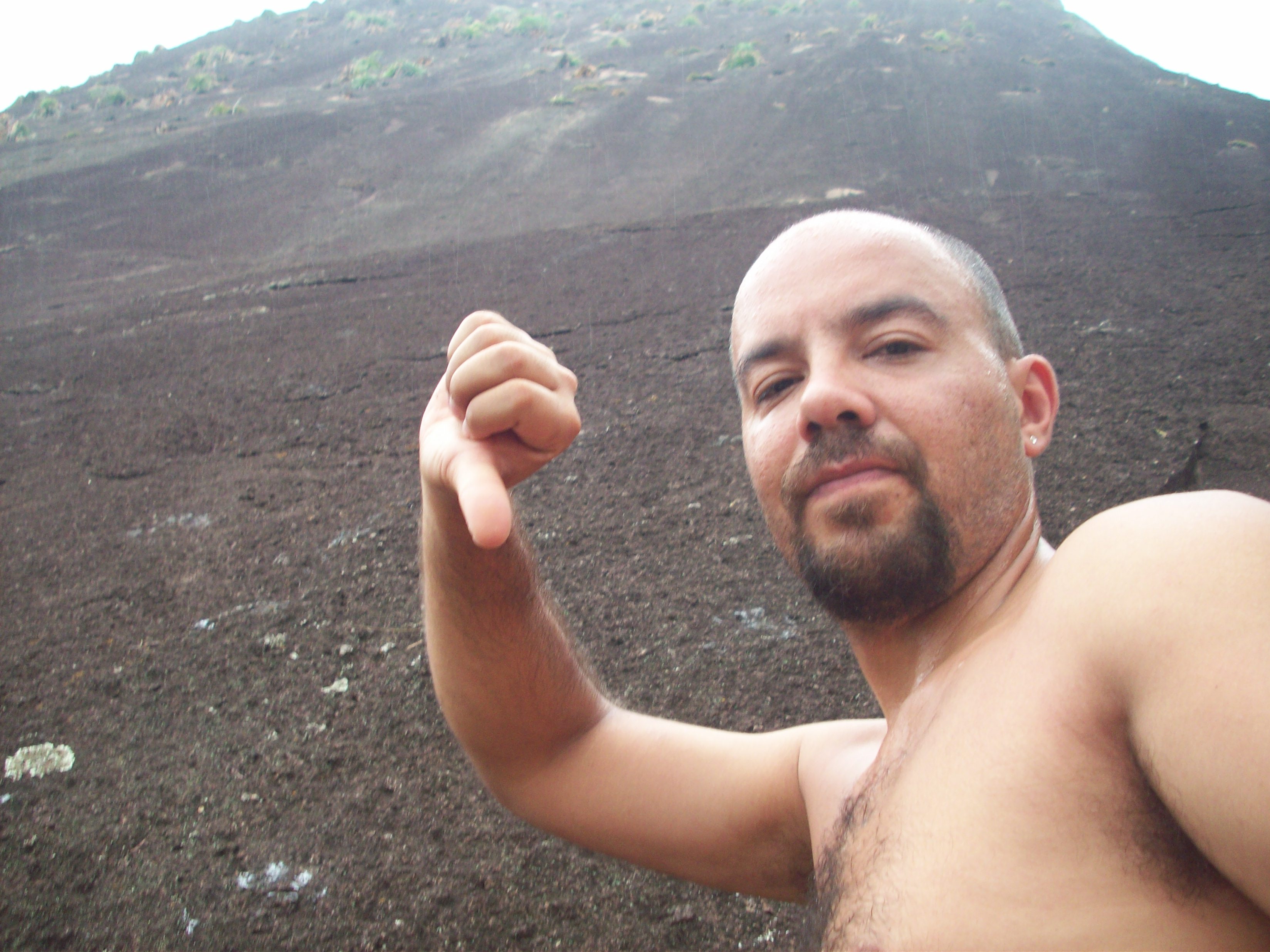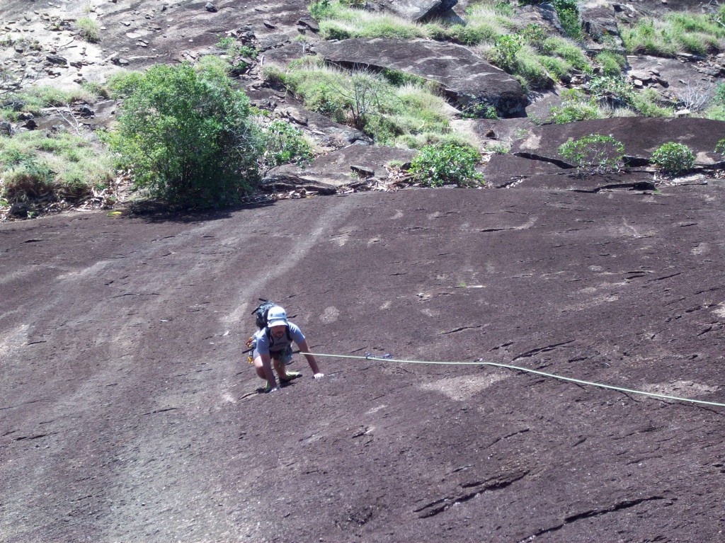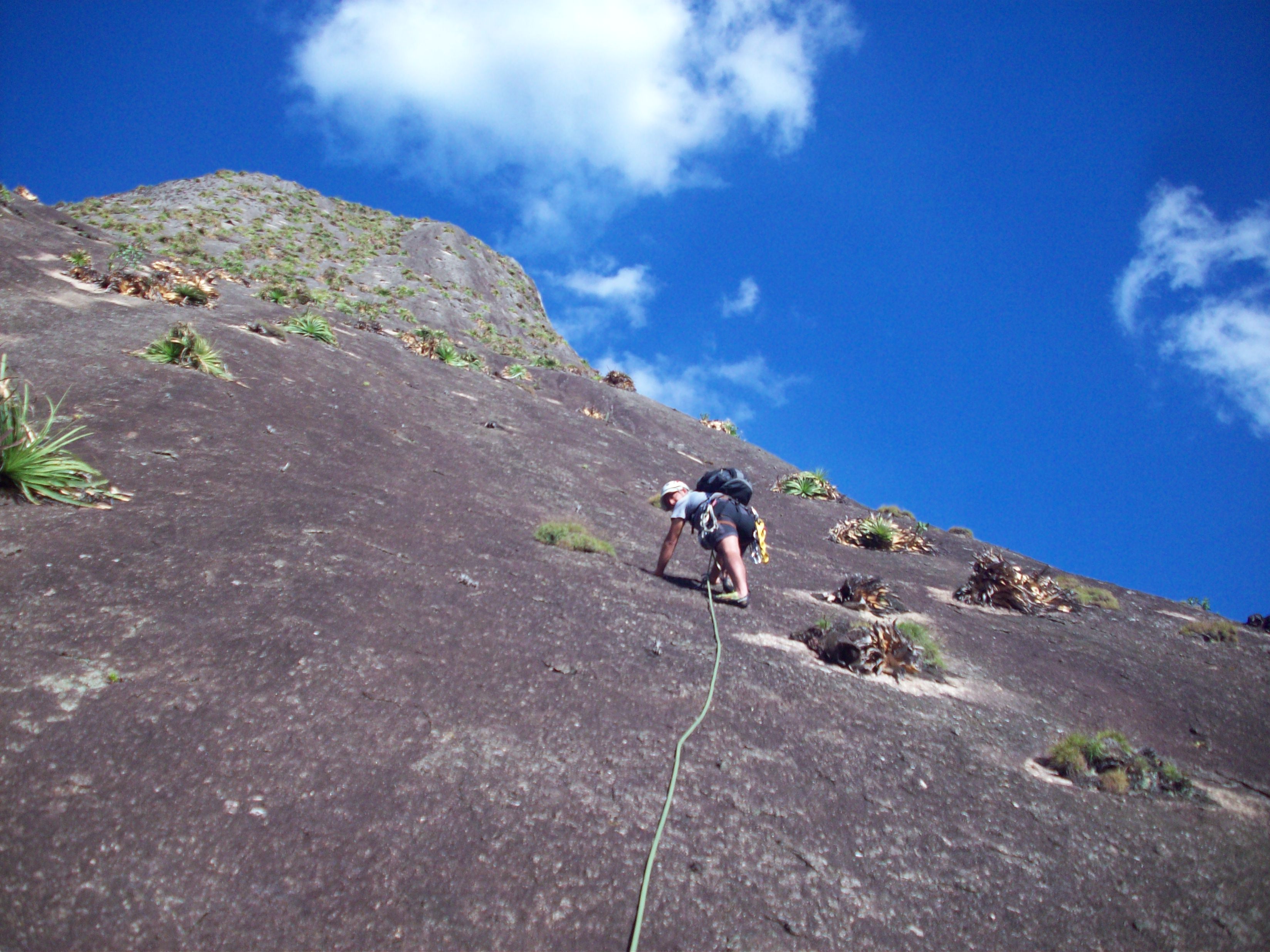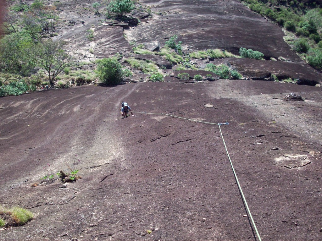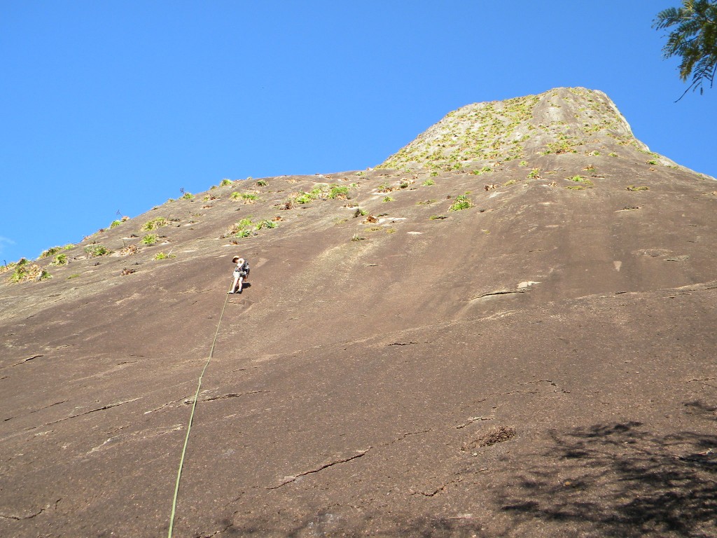Derrepente a garoa parou, caminhamos até a base da via com aquela esperança de estar tudo seco e aparecer o sol, mas dois minutos depois de chegar à parede voltou a garoar, mais forte ainda, não tinha jeito, tínhamos que voltar.