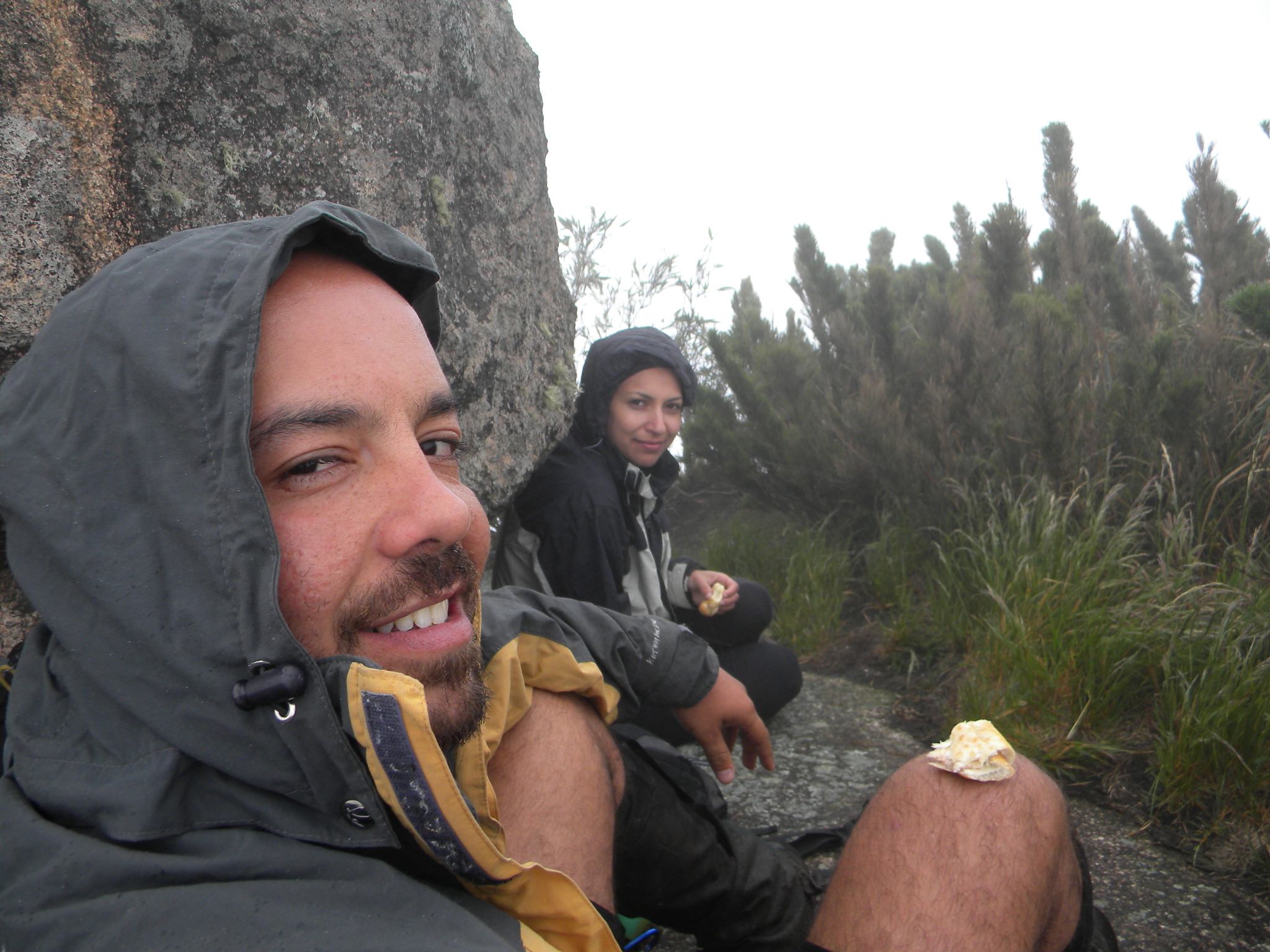 Chegamos ao cume com o tempo já esperado, garoa forte, tudo fechado e frio.