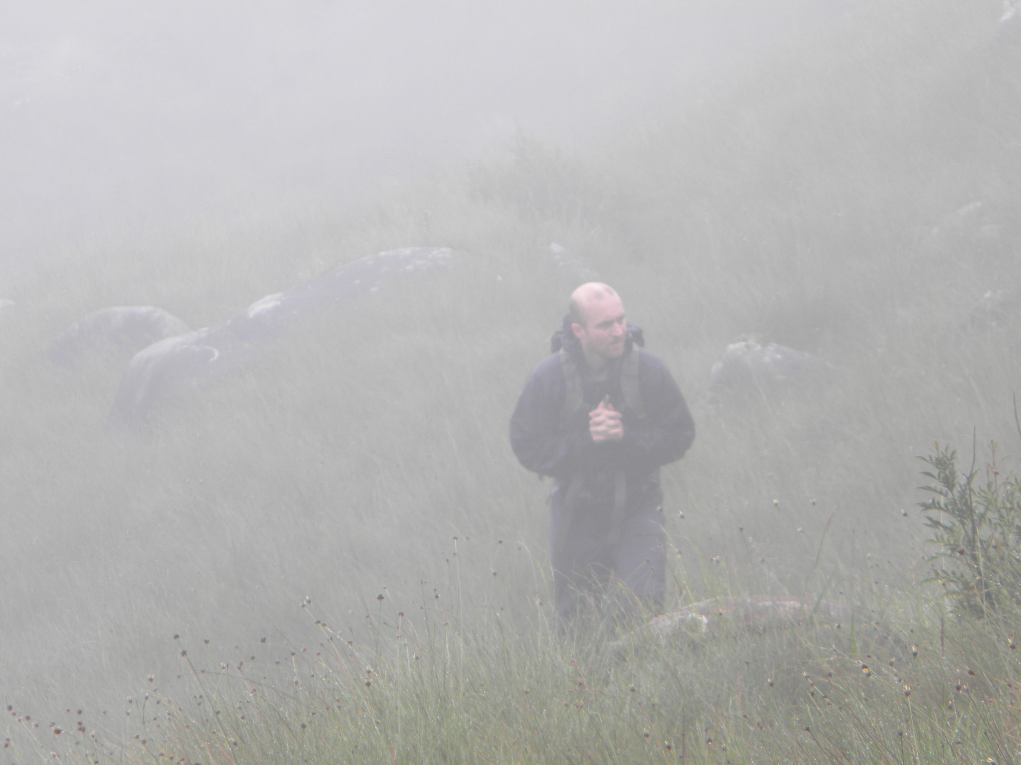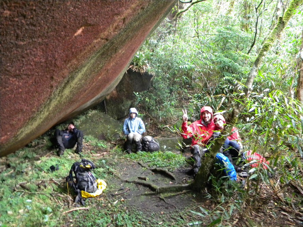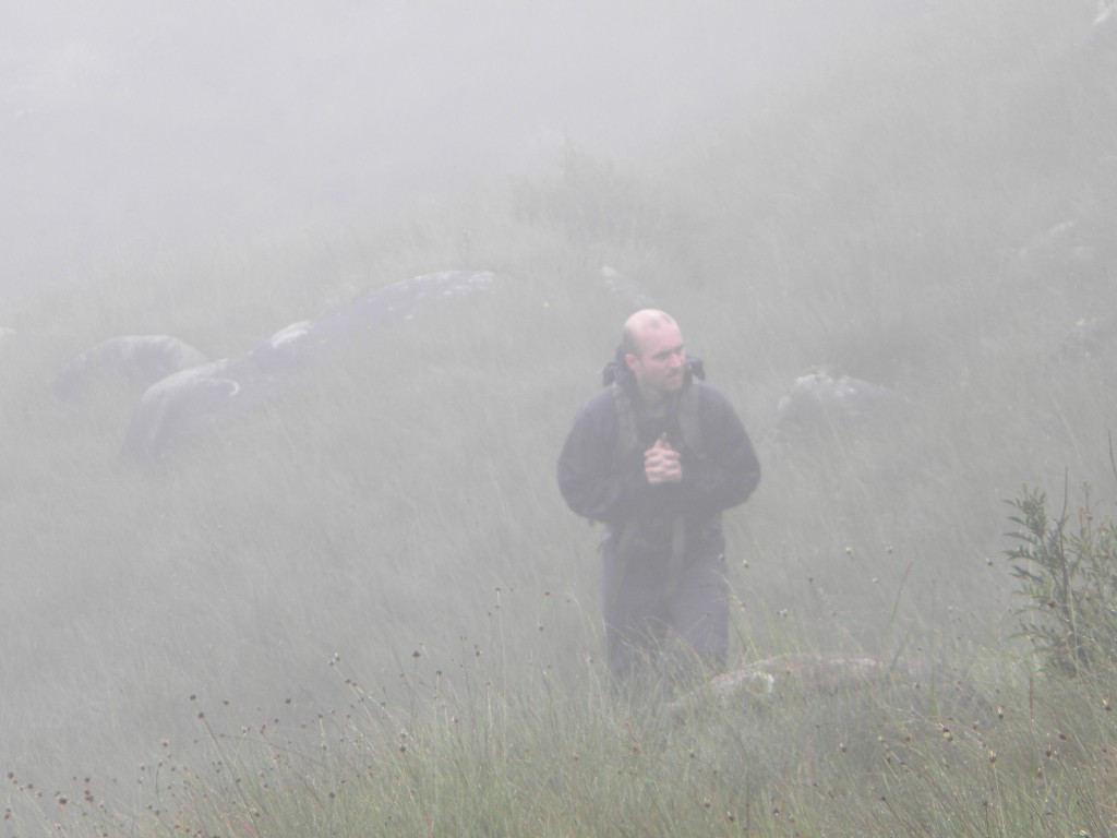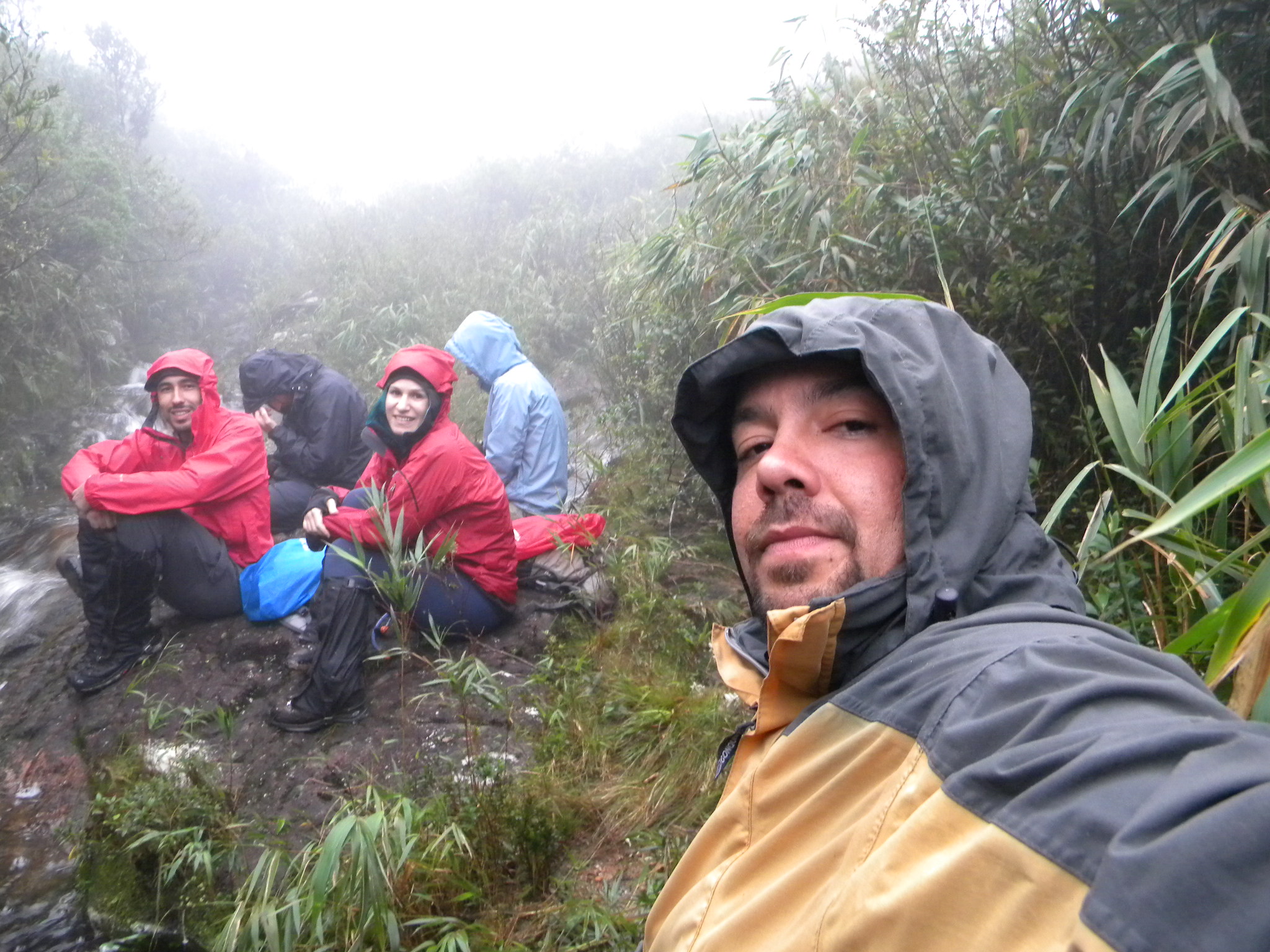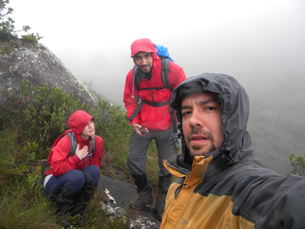 Quando chegamos ao cume do Tartaruga era aproximadamente meio dia, o tempo não colaborava, chuva, uma neblina que não deixava a gente ver mais que 10metros à frente e frio que nos obrigou a usar os anoraques.