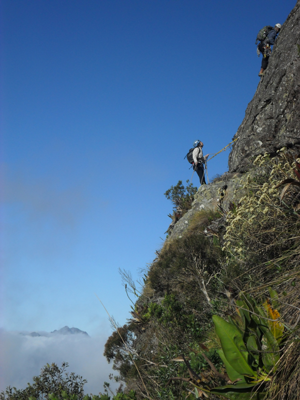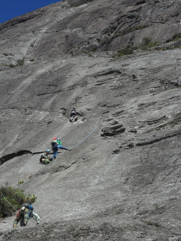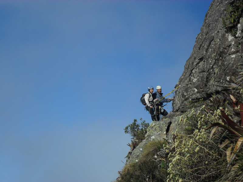 Pela manhã bem cedo saímos à procura do rapel que seria por outra via, em três rapeis de 50 metros todos estavam no chão em segurança, nessa hora até o sol apareceu para esquentar.