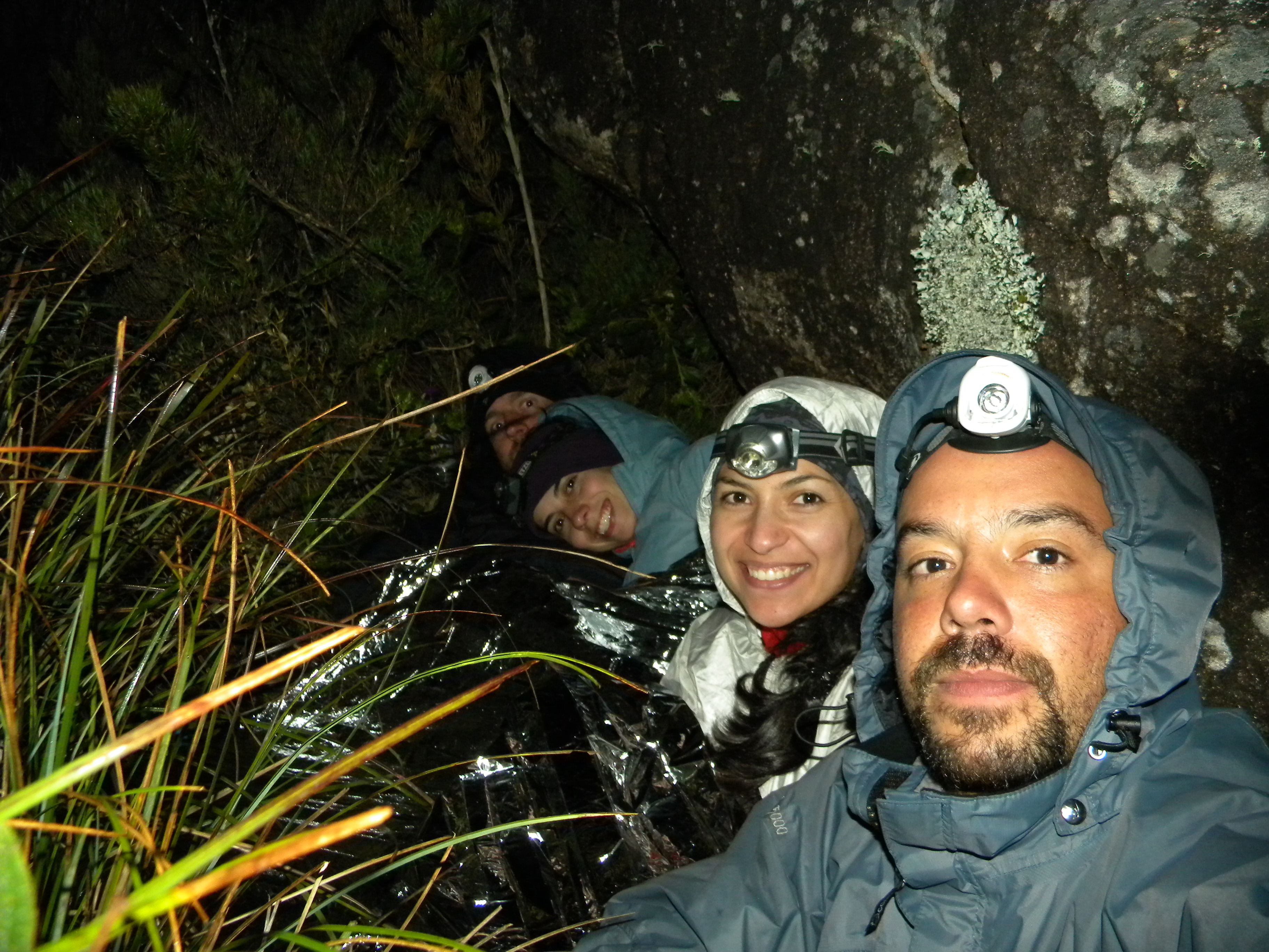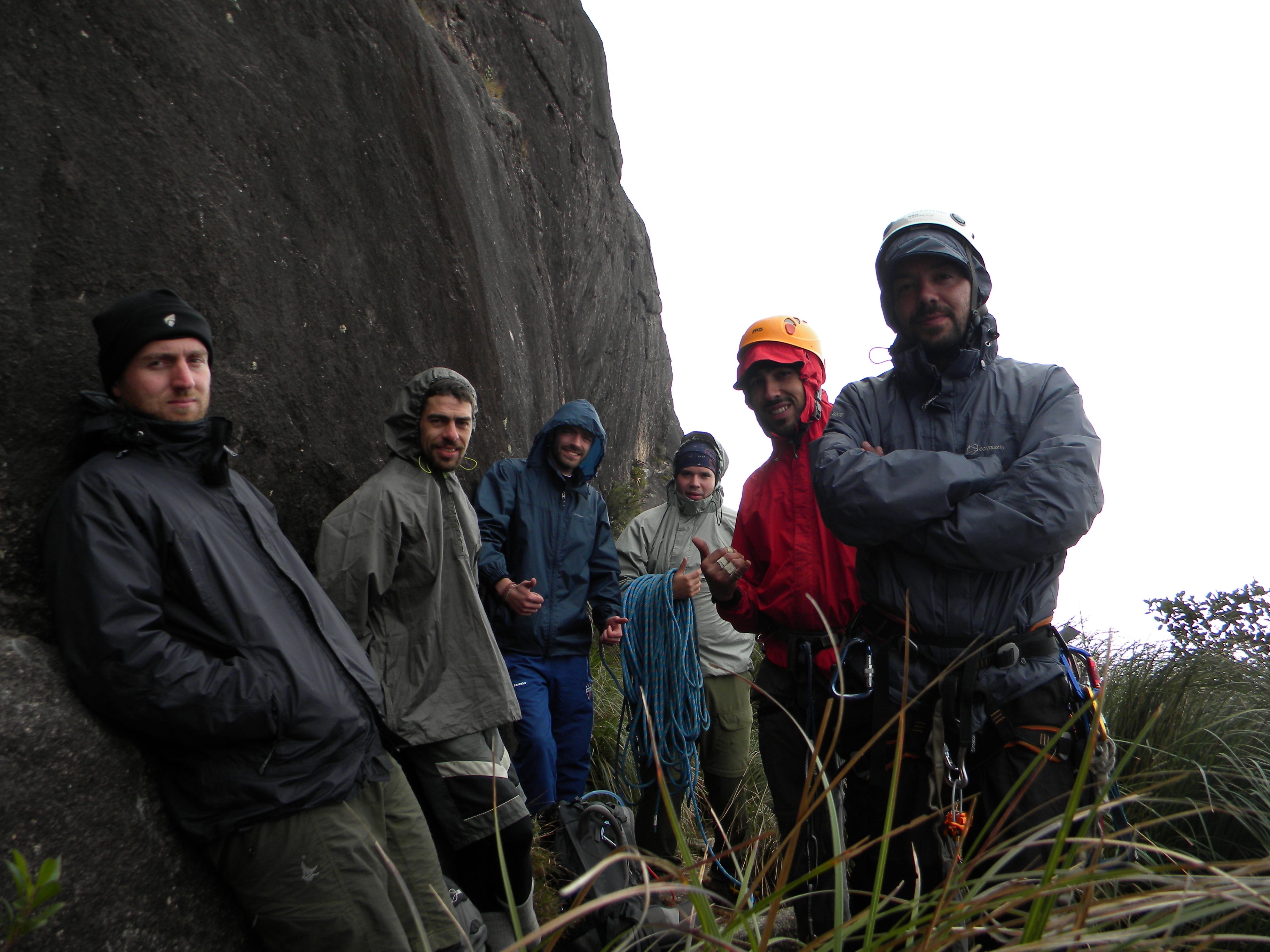 A turma que estava na via Roberta Groba teve um probleminha e demoraram um pouco mais para finalizar a escalada, enquanto isso ficamos abrigado atrás de uma pedra para se proteger do vento enquanto esperávamos, o tempo estava muito ruim, não conseguíamos ver mais que três metros a frente, então achamos melhor esperar amanhecer para rapelar.