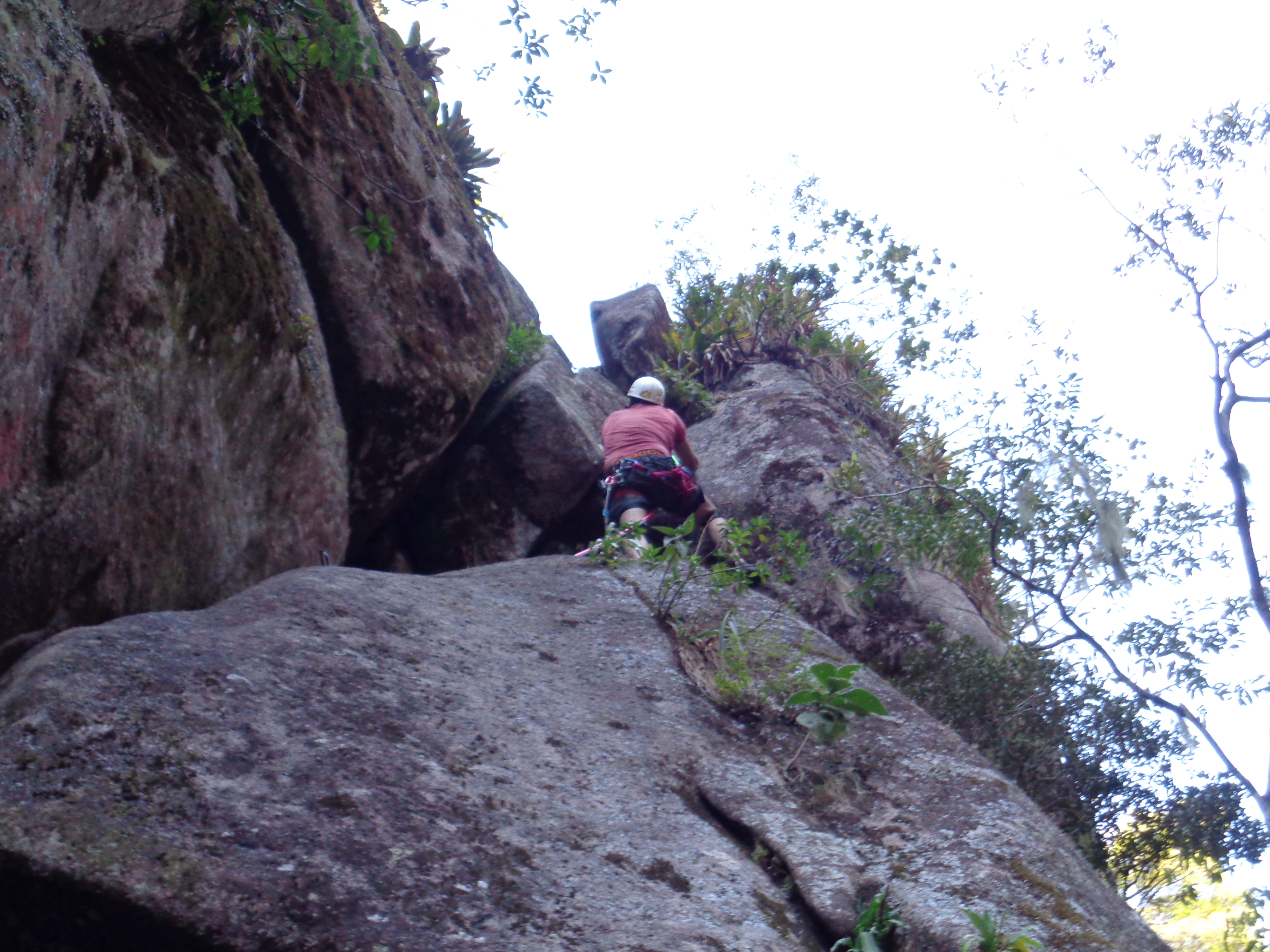 Nunca entendi esta tara que todo conquistador tem em iniciar uma via com um lance meio cabuloso que parece fácil, mas sempre te faz dançar. E o Juliano começa a escalada alternando trepa pedra, trepa mato, grutas, travessias e escalaminhadas desprotegidas com lances longos, laçando troncos e grampos muito espaçados até uma chaminé bloqueada por pedras roladas que dificultam a progressão. E vem o sofrimento.