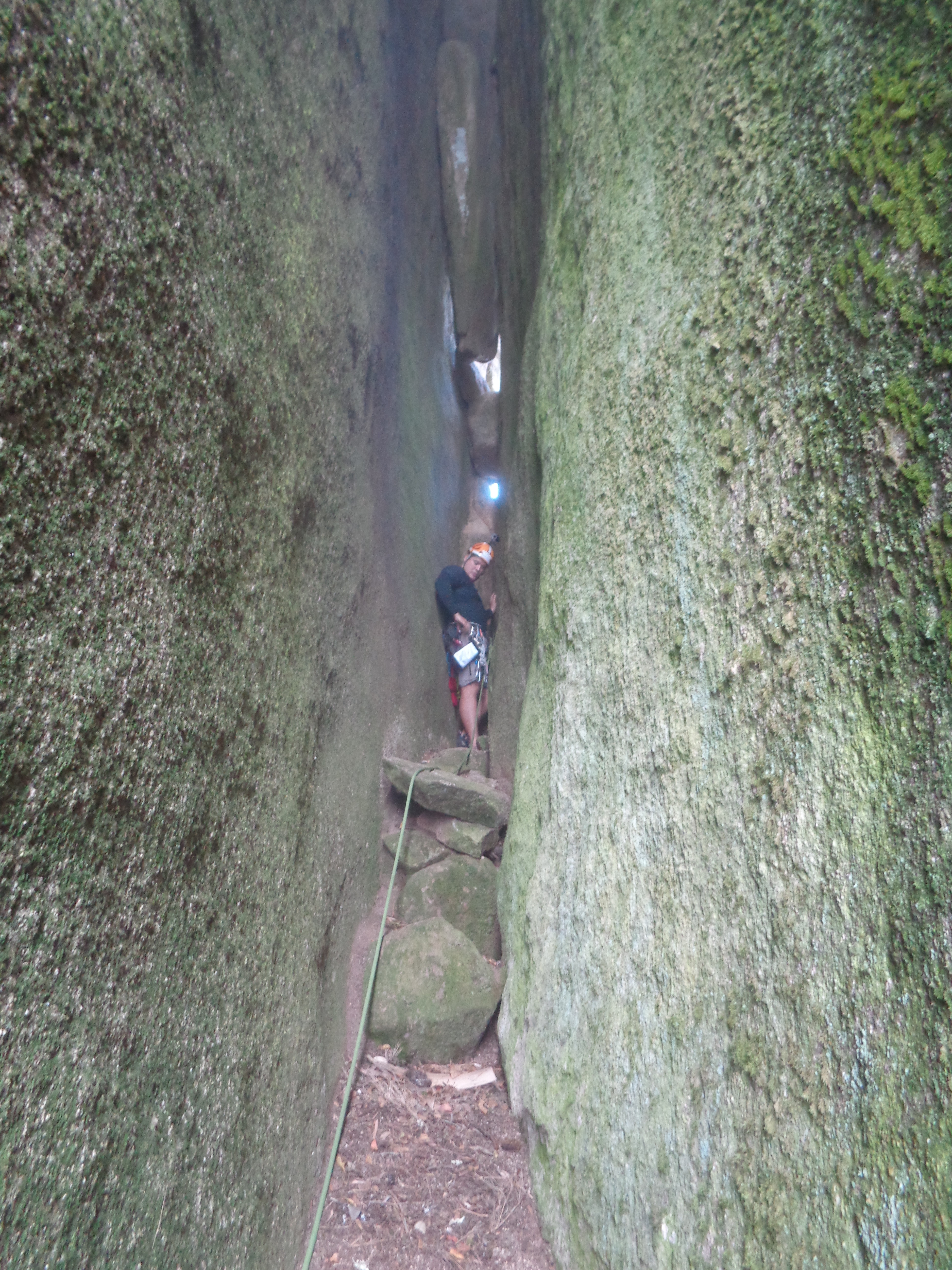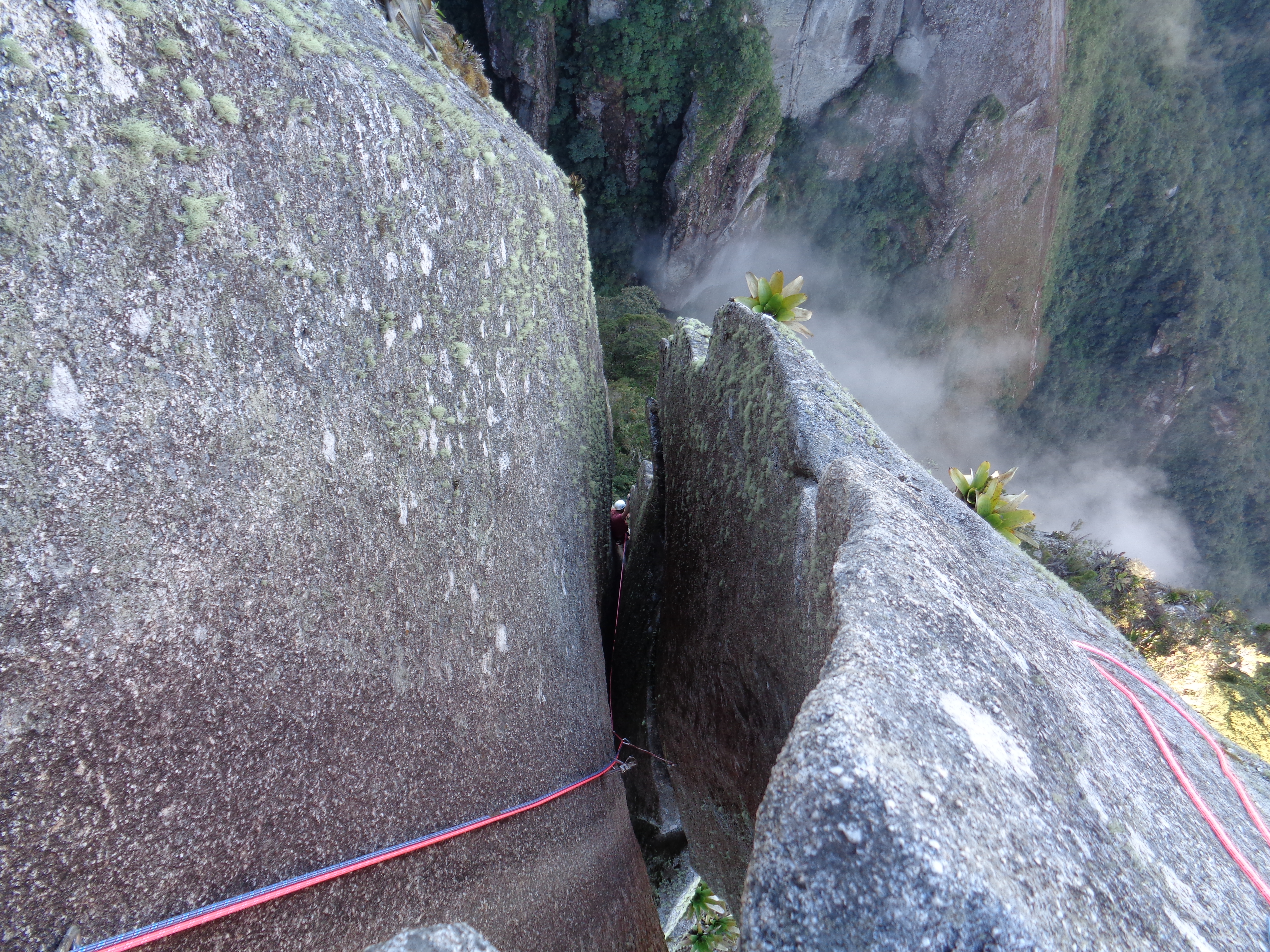 Duzentos metros de queda livre e só consegui entalar o pé e metade do joelho. Pelas fotos na internet parecia nivelado, largo e profundo, mas pessoalmente era inclinado para cima, estreito e afiado. Corpão inteiro no vazio e só parei para olhar pra baixo na entrada da Chaminé da Unha.