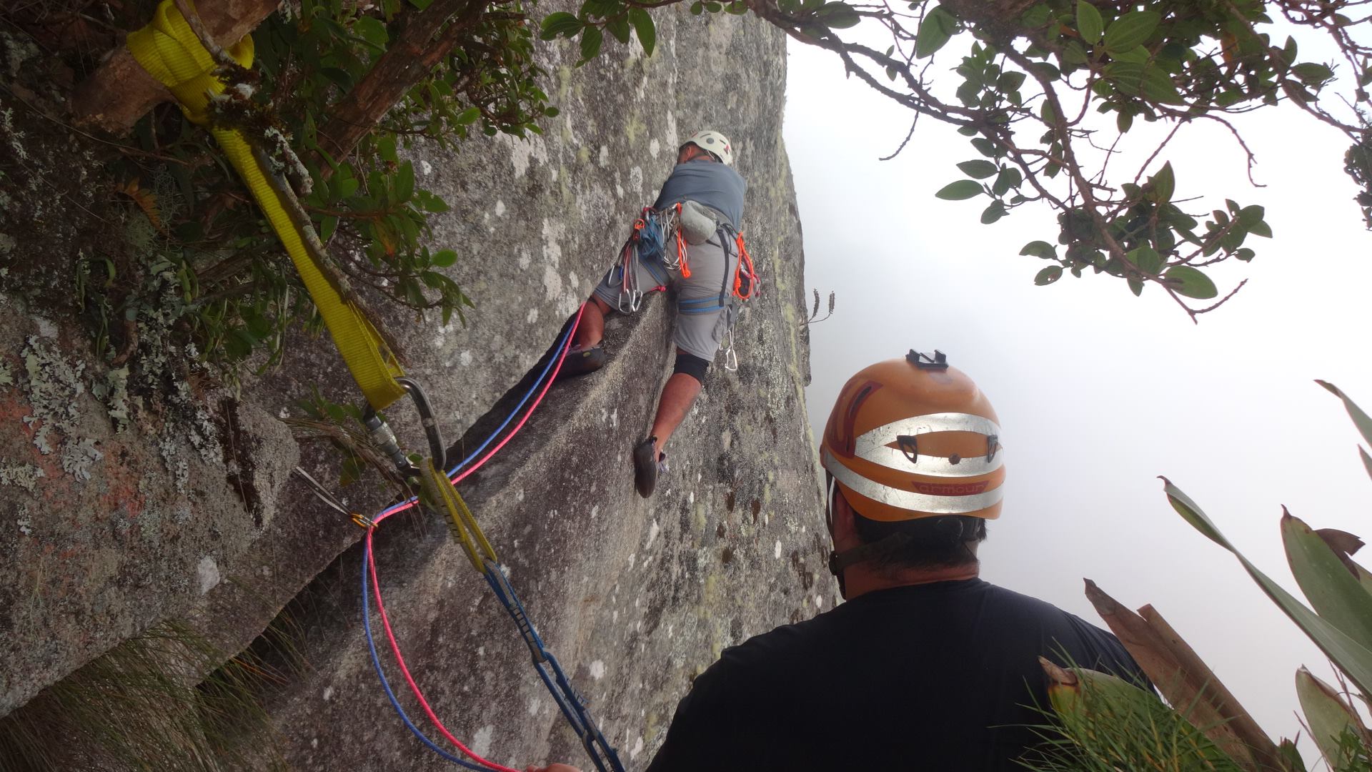 A chaminé seguinte tem uma saída bem esquisita e fincamos o pé no Platô da Unha. Enfim uma boa alongada enquanto o Juliano, ancorado numa árvore, dá segue para o Natan passar pela fenda do Cavalinho. Uma neblina densa nos envolve e o vento forte começa a congelar. Três numa cordada é sempre aquela lesma lerda. Levou uma eternidade para o Natan chegar à Unha e liberar a via.