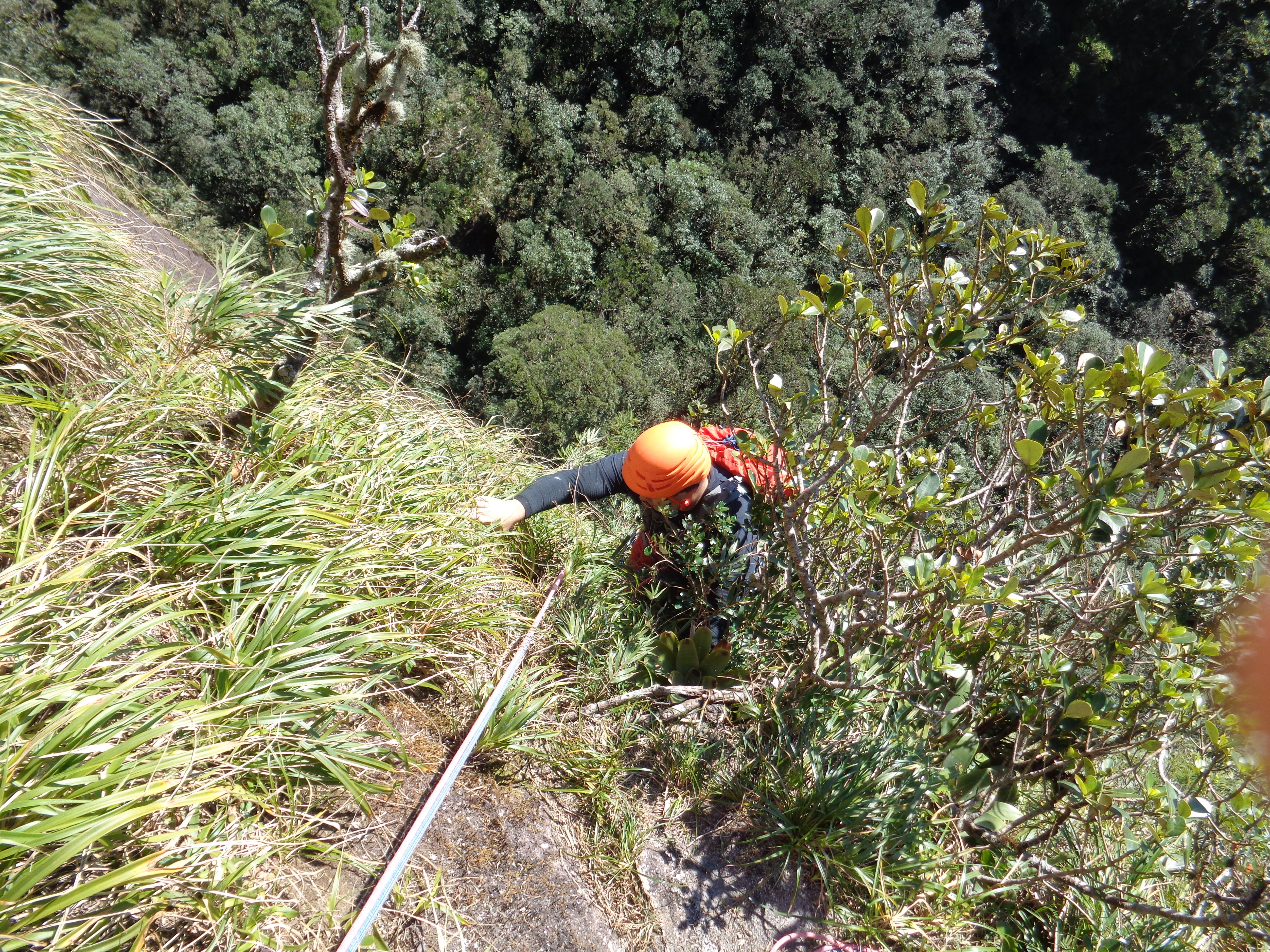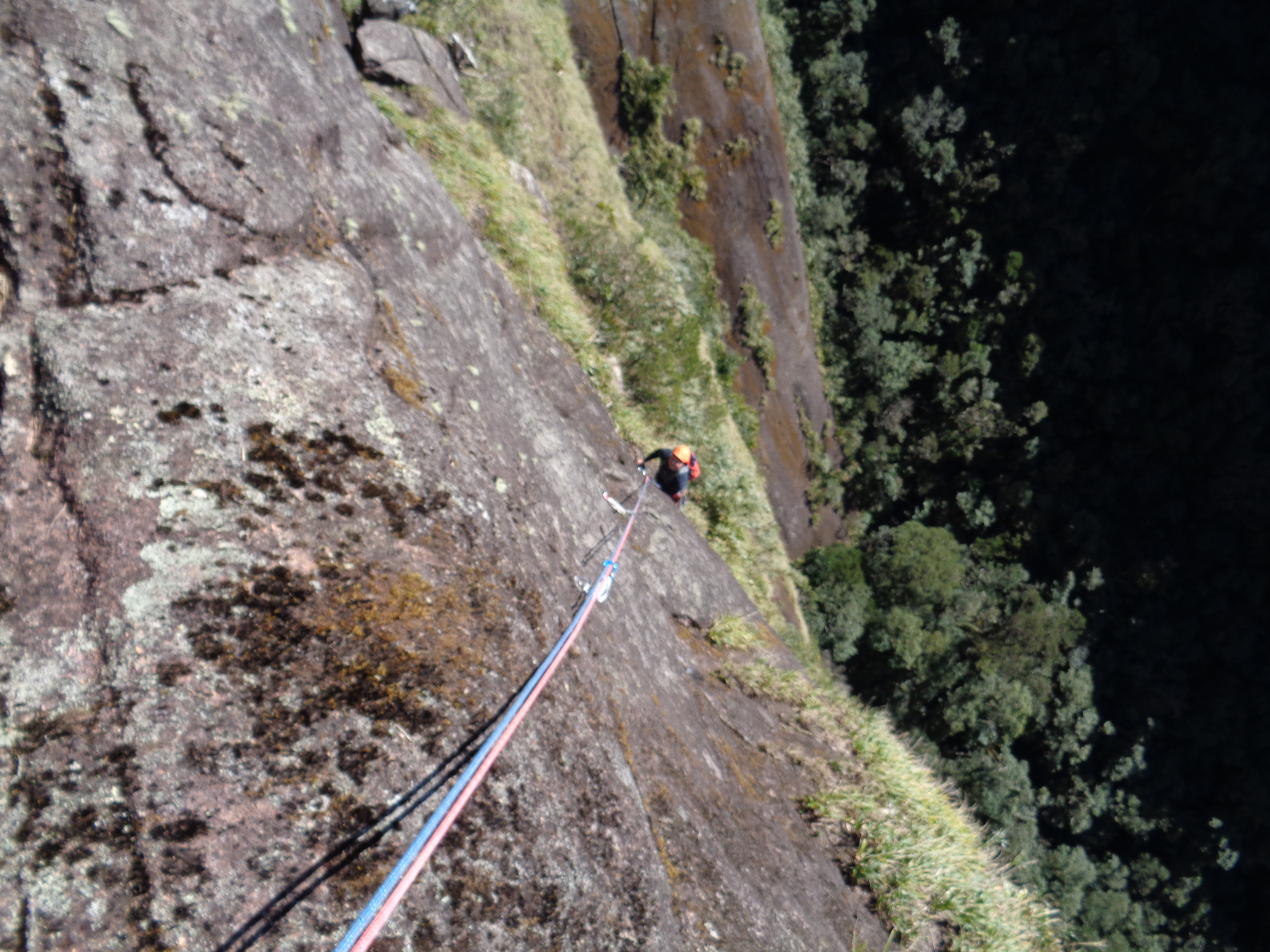 Quando eu e o Juliano estávamos na segunda parada resolvemos baixar dali mesmo, já tínhamos suado bastante e demorado mais do que esperávamos naquelas duas enfiadas, achamos melhor tentar fazer as 5 enfiadas em uma outra oportunidade entrando mais cedo na via e um pouco mais relaxados também, a primeira parte de via acabou sugando um pouco a mais do que esperávamos.