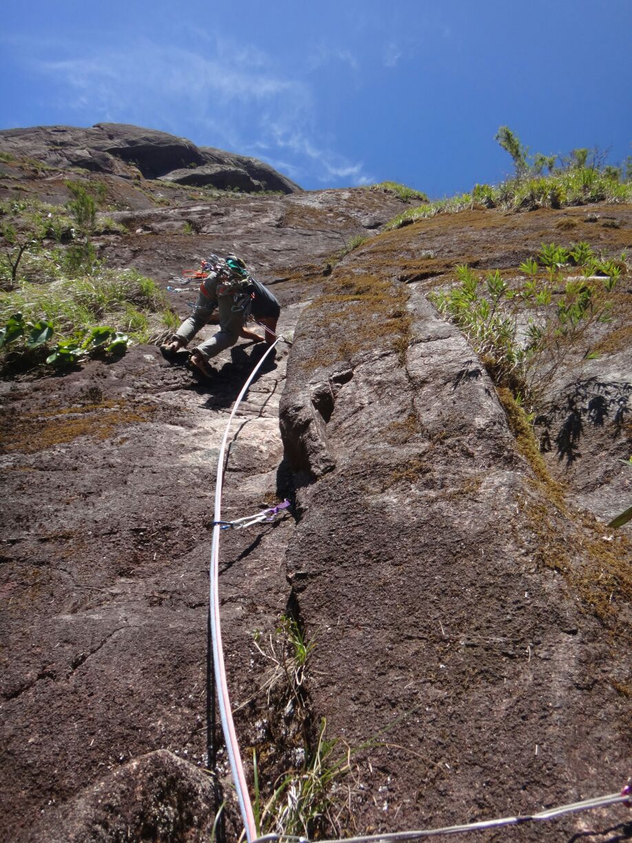 A primeira enfiada é um 7a delicado e constante, suei para chegar na primeira parada, com o Juliano também não foi diferente, chegando no final da enfiada todo suado e com as bochechas coradas rsrs.