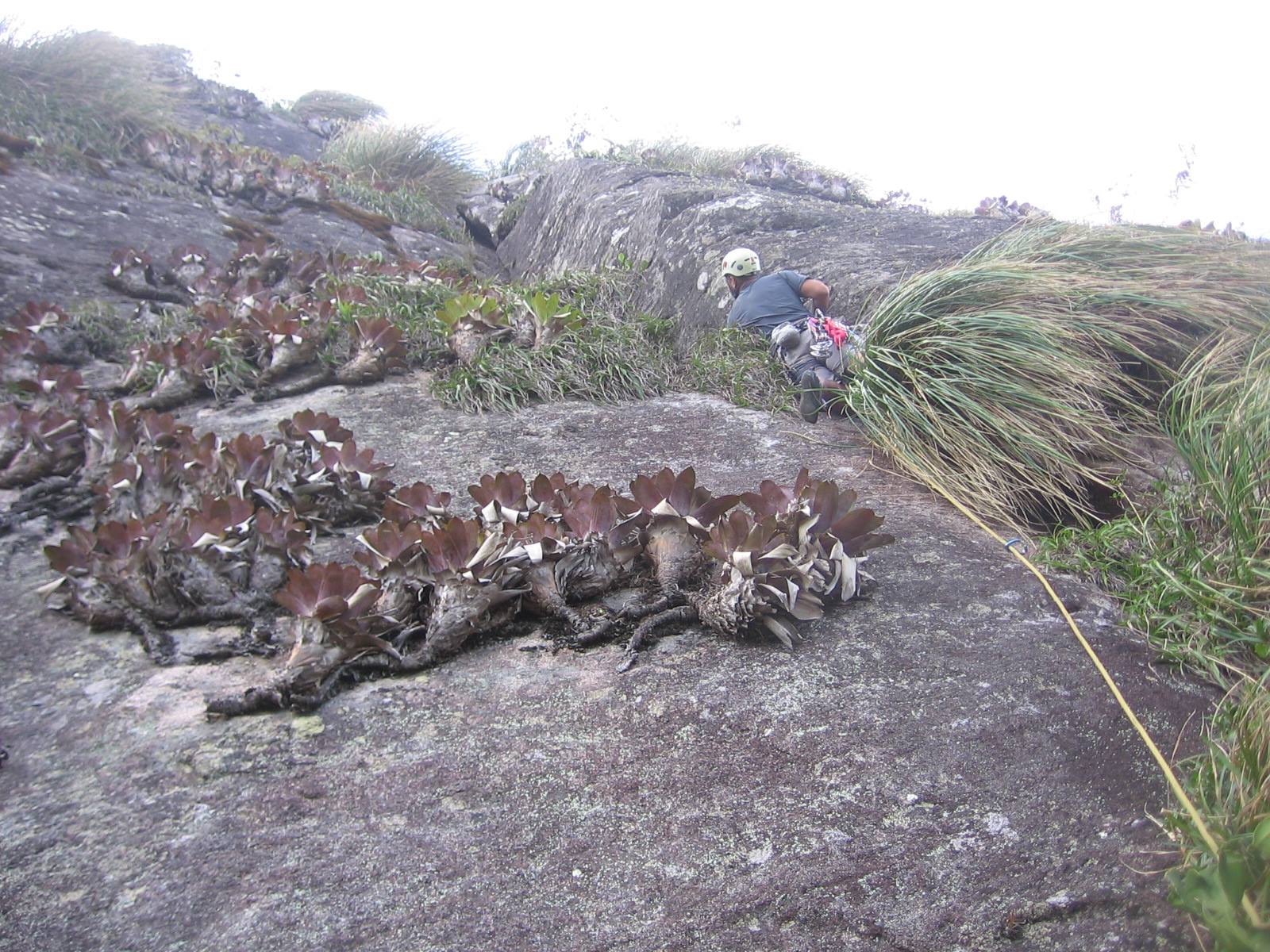 Segui na cola numa diagonal à direita em aderência até a base do diedro com alguma dificuldade para contornar uma solitária moita de capim que depois se mostrou bem confortável para apoiar o joelho esquerdo, e alcançar uma trinca contínua na junção da parede com o diedro que permite subir com esforço em oposição até alcançar o ponto de se lançar a direita cavalgando o ângulo exposto do diedro em direção ao platô de mato. Inicialmente avaliei o crux como 3º grau bem exposto, mas vale a percepção de quem guiou classificando-a como 4º Sup. A corda vindo de cima deixa tudo mais fácil.