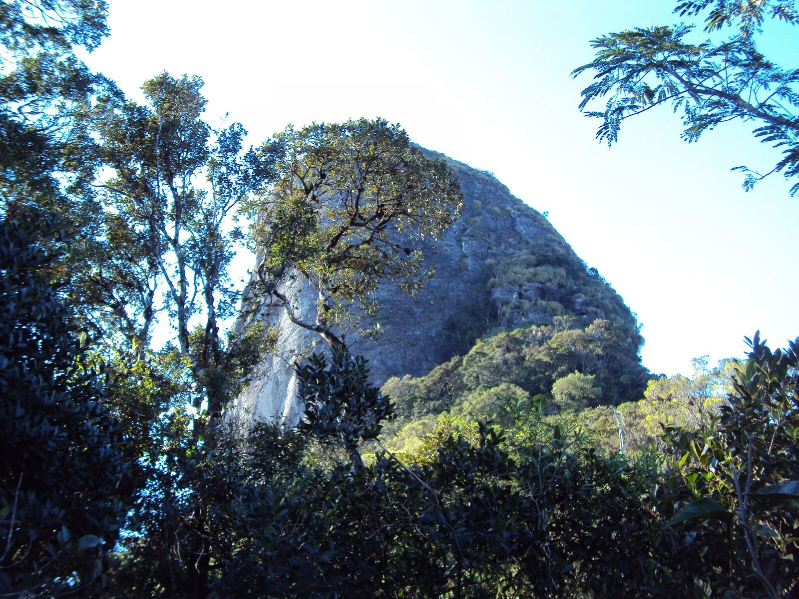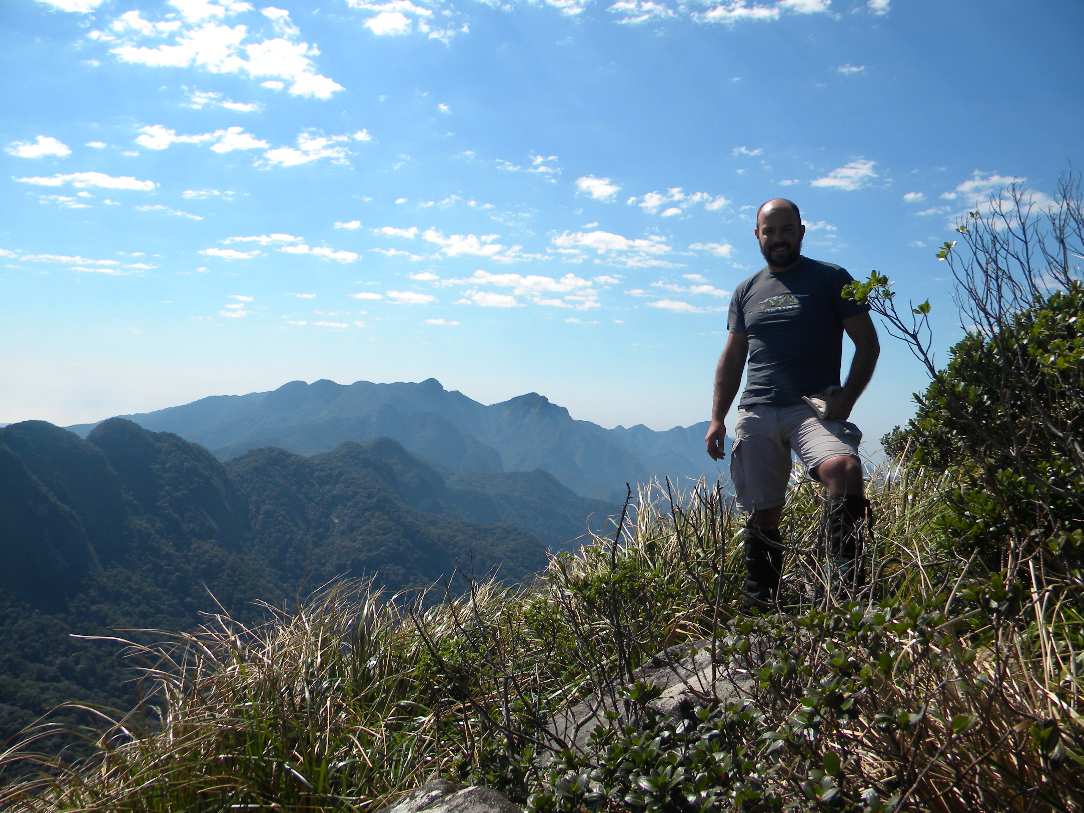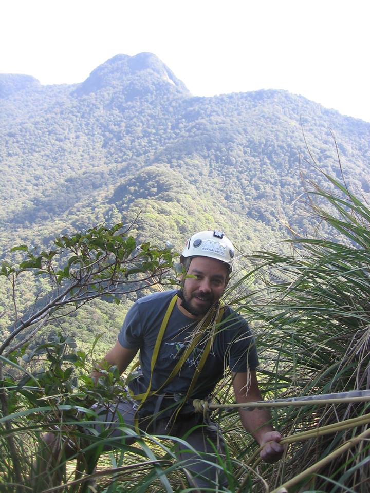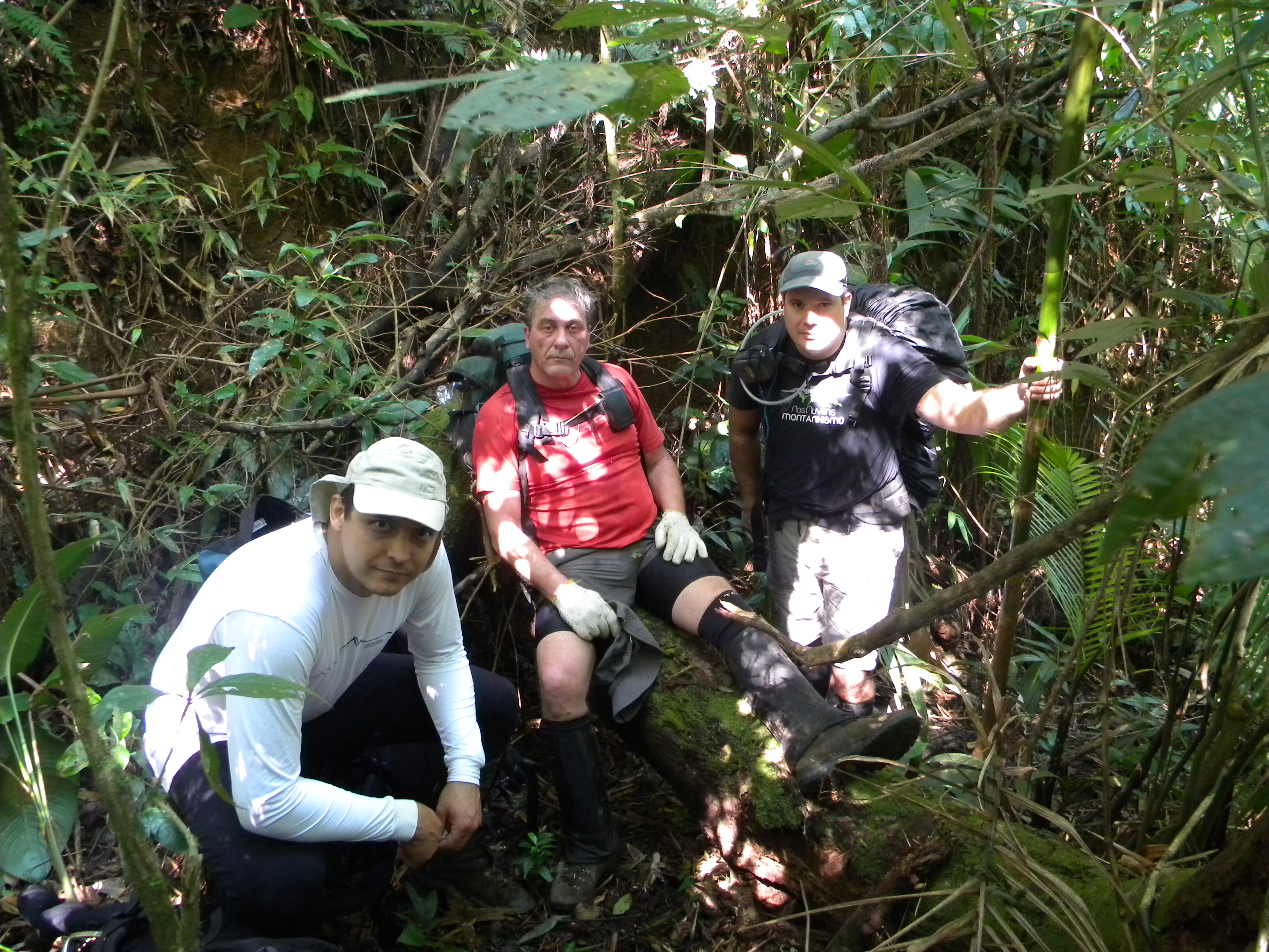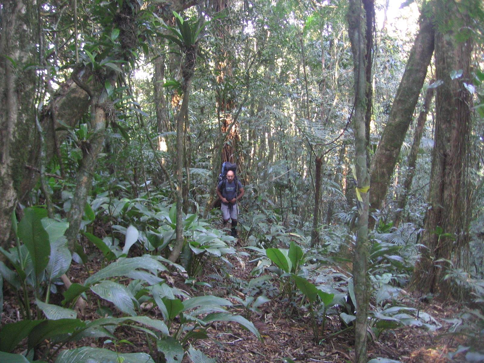 Muito abaixo de nossos pés se iniciava uma crista bem demarcada na direção sudeste até outra montanha mais baixa, continuando até a base da “Pedra” e seguindo além. Tudo coberto pela floresta exuberante com exceção da montanha proibida que se projeta altiva para o céu contra a vastidão da planície litorânea. É o objetivo pessoal, e descemos pela face sul fresca e gotejante, atolados na prazerosa umidade do terreno, desviando precipícios, dependurados em cipós, deslizando pela encosta até o início da crista. Bosque alto com árvores frondosas e forrado com vegetação rasteira, cipós unha-de-gato, taquarinhas e criciúmas que colam como velkron, arrancando a pele na passagem. Seguíamos por trilhas de animais e sobre montes de estrume das antas na crista extremamente seca e sufocante. Se não bastasse o ardor do suor salgado escorrendo sobre os cortes e escoriações, não demoramos a sentir o corpo coçar pela andança dos minúsculos e inevitáveis micuins.