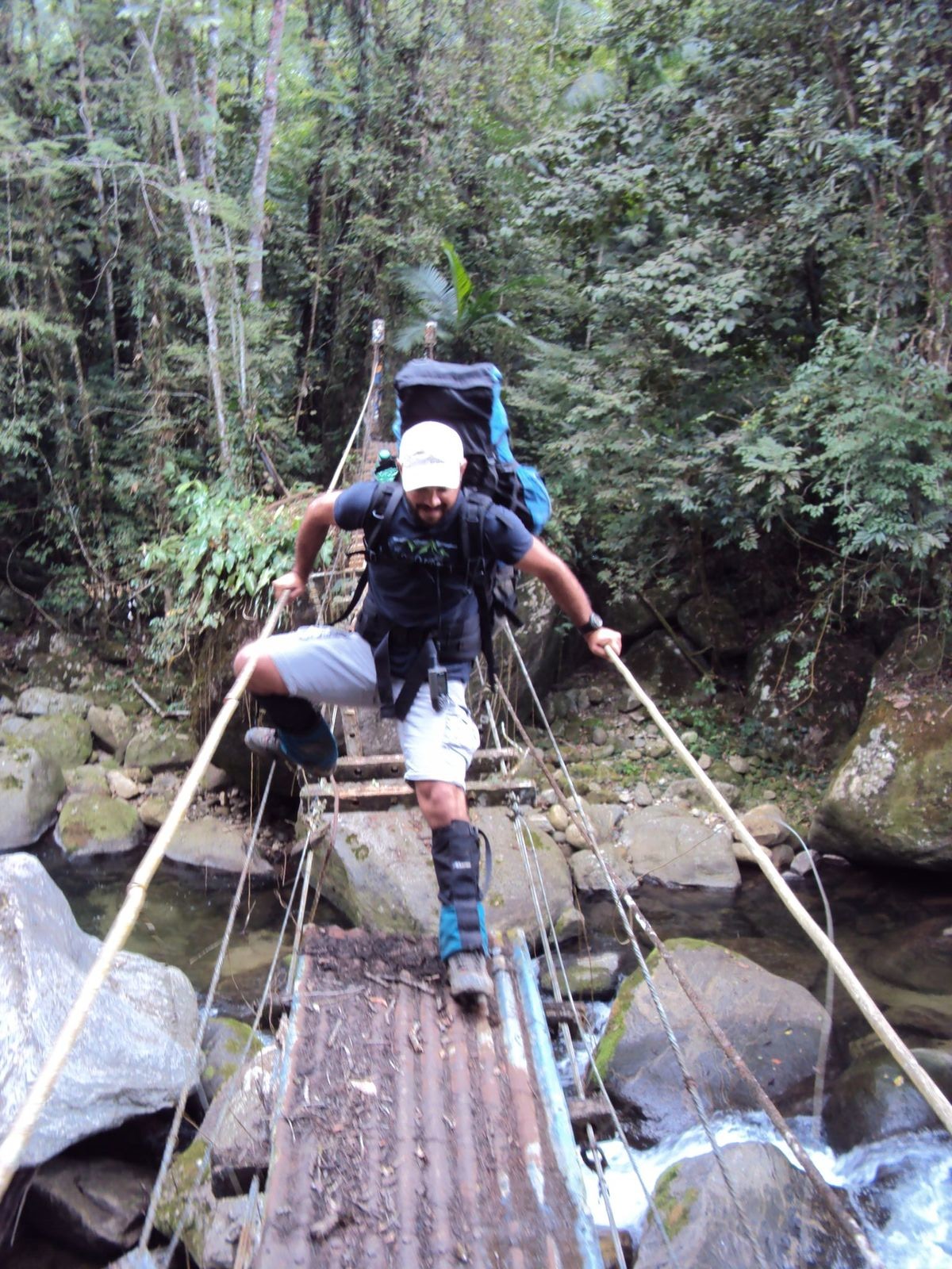 Com este salvo conduto tratamos de zarpar a pé por mais um quilômetro e meio pelo descidão até encostar no Rio do Espraiado e cruzar pela decrépita ponte pênsil. Todo cuidado é pouco nestas horas e lá se foi um terço dela para dentro do rio com enorme estardalhaço. Só o Natan, que ficou pendurado nos cabos de aço, não achou graça na situação. Neguinho pulou feito cabrito assustado!