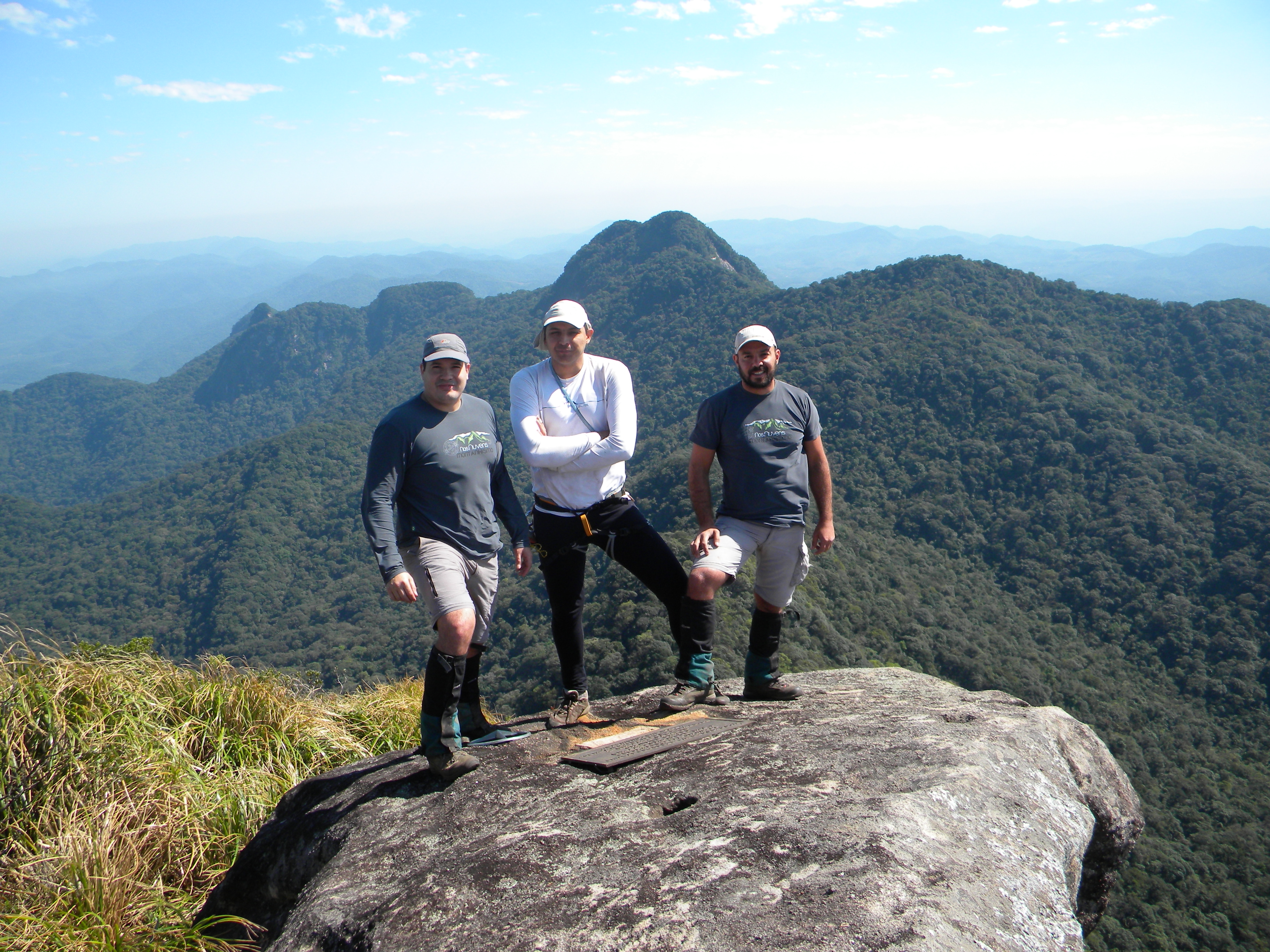 O platô começou a ficar pequeno demais com a chegada do Juliano e resolvi explorar um pouco a frente para estabelecer a rota até o cume. Alguns passos a direita submergi num mar de capim navalha até a altura do pescoço. Voltei rapidinho pedindo que trouxessem as botas e as polainas nas mochilas se não quisessem sair fatiados do outro lado, mas então percebi um lance de parede limpa acima da cabeça do Natan que seguia por mais uns 5 ou 6 metros verticais antes de encontrar o capim. Muito exposto, mas dotado de excelentes agarras e dei sorte ao encontrar moitas de capim bem menores e “não tão afiadas” fazendo a bordadura de uma matinha com arbustos duros e retorcidos. Nadando de braçada sobre a quiçaça avancei para cima e para o norte até uma pedreira na borda do abismo e a velha placa de bronze. Cume!