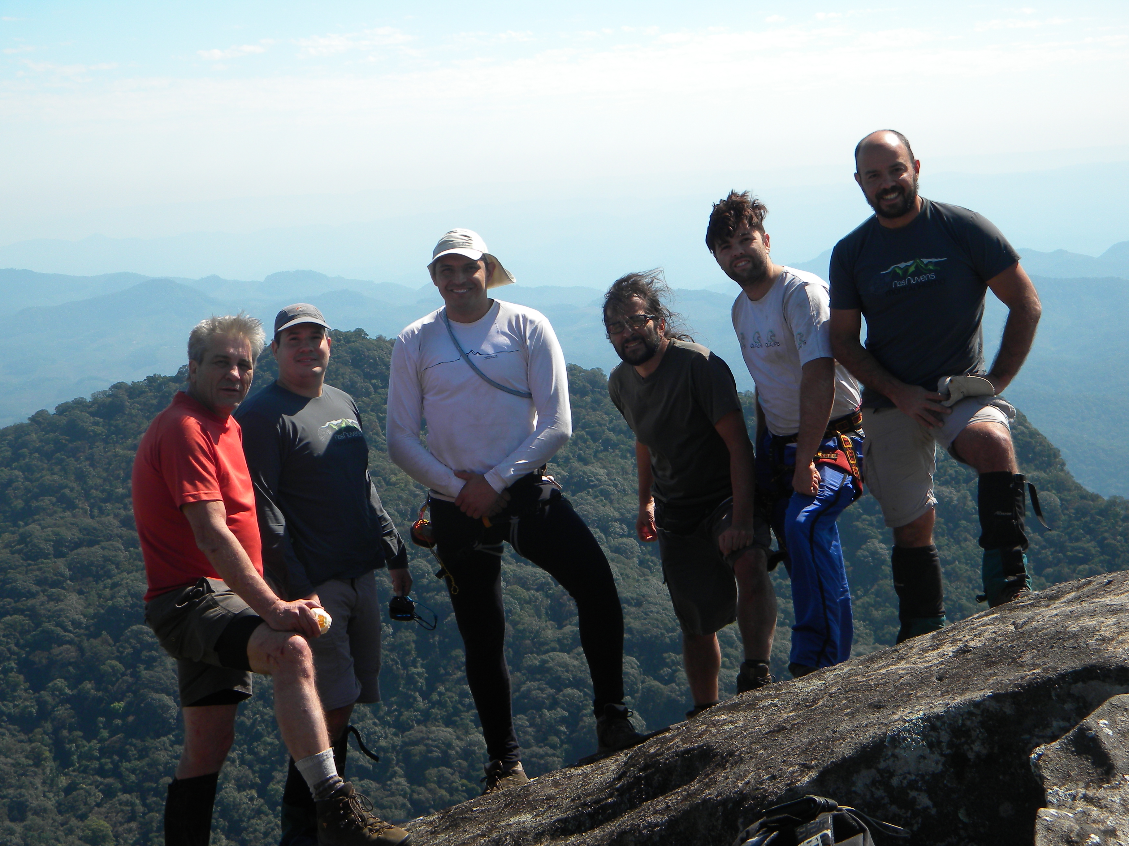 Lá embaixo o Jean já havia subido e agora lutavam pra convencer o Jorge Soto a calçar as sapatilhas. Ao som das corneteadas do Natan subiu o agonizante Jorge equipado com os sapatos do palhaço Bozo. Nem bateu o meio dia e todos se confraternizavam no cume com vista desimpedida para a serraria ao redor. Mar e céu se fundiam num horizonte acinzentado e só a linha sinuosa das brancas ondas quebrando na praia marcavam as fronteiras entre o líquido e o sólido.
