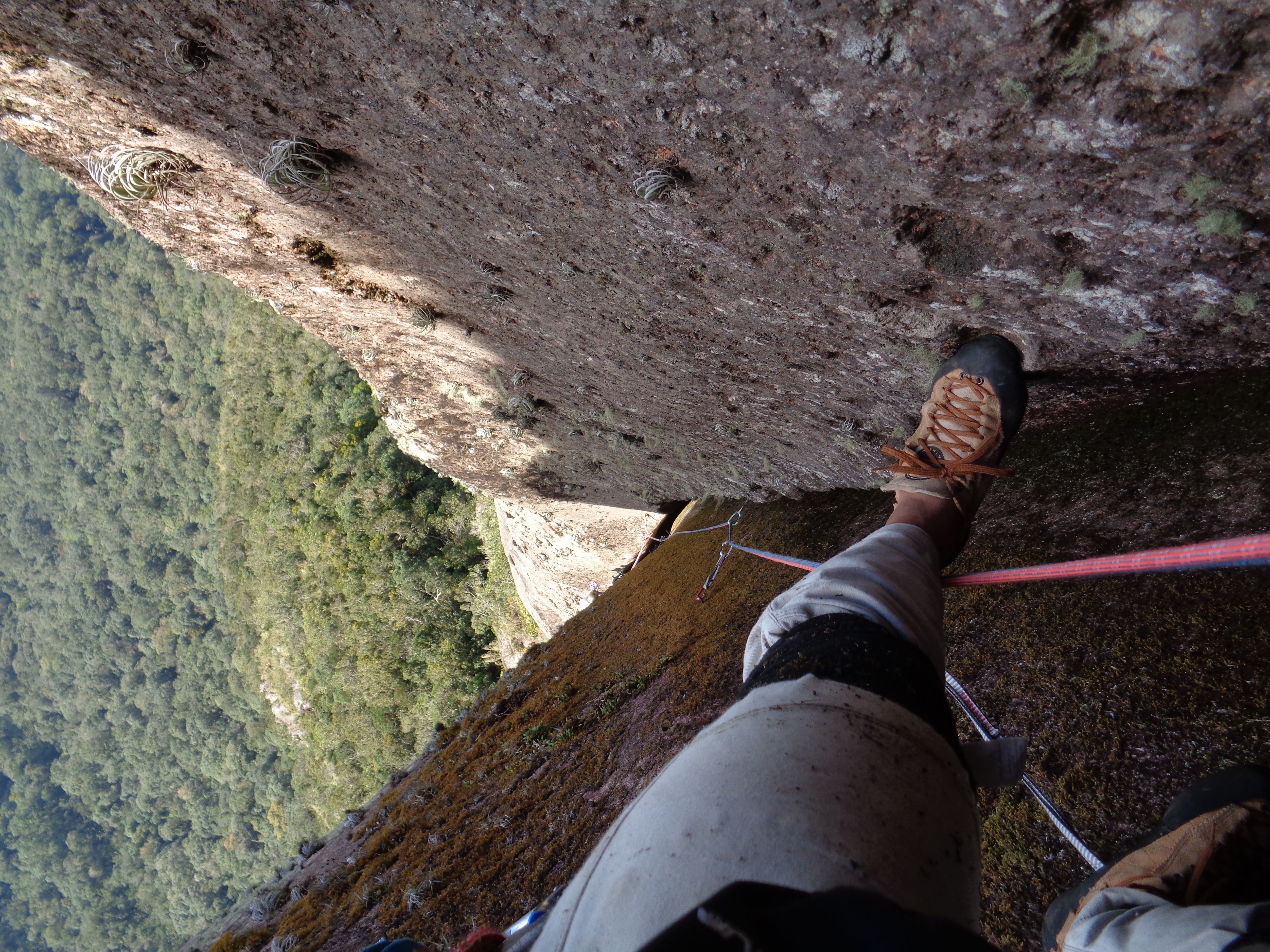 Já no início da via o Alisson avisou que os grampos de proteção estavam bem feios, praticamente podres. Ele escalou até o único grampo bom que tinha na via para fazer a minha segurança. A parada ainda estava meio longe, mas esse era o único ponto seguro para ficar dois marmanjos pendurados.