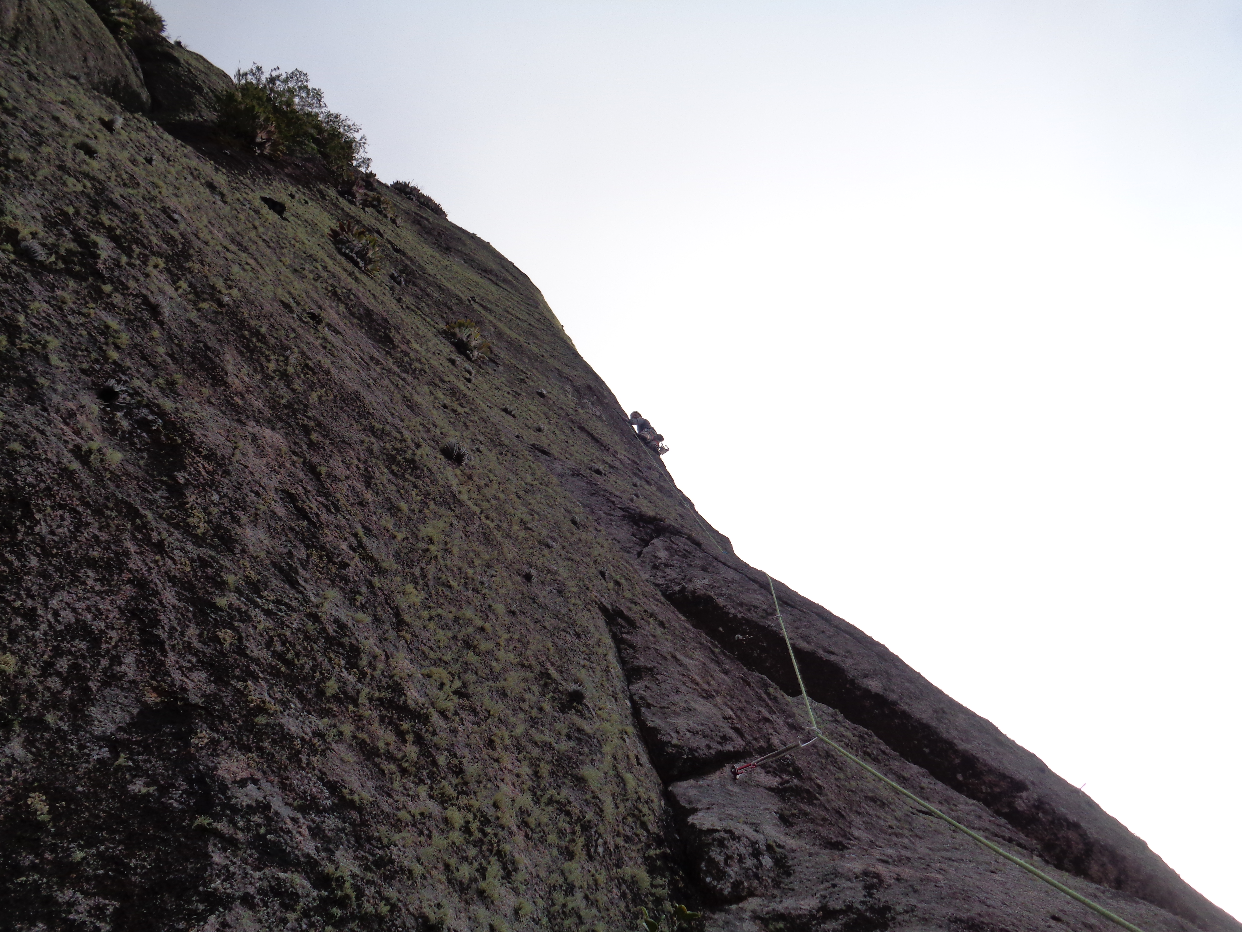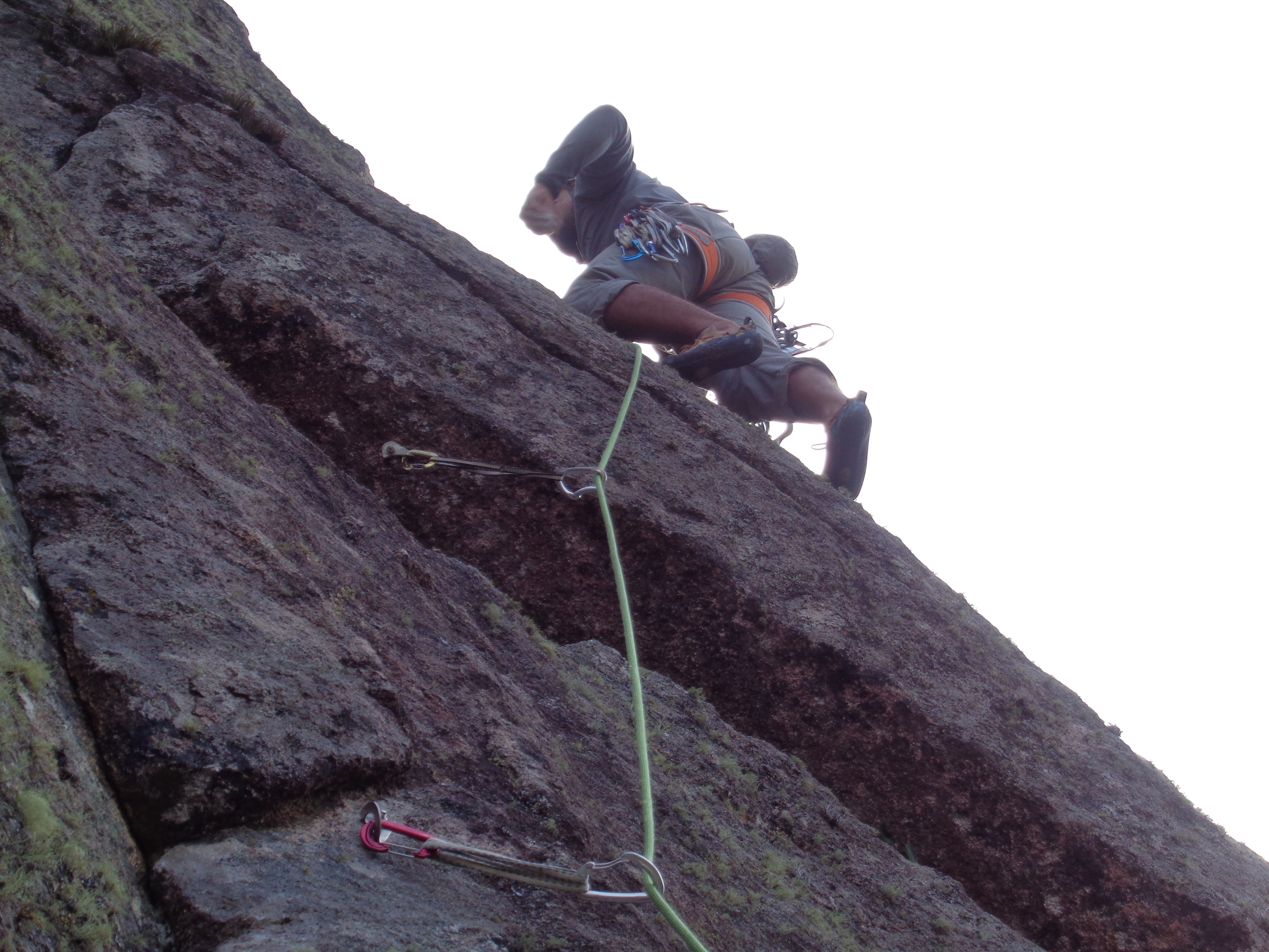 Minha vez de fazer um pouco de força, consegui chegar no crux daquela enfiada que fica bem na aresta da parede, mais depois de muitas tentativas e algumas quedas divertidas também acabei baixando.