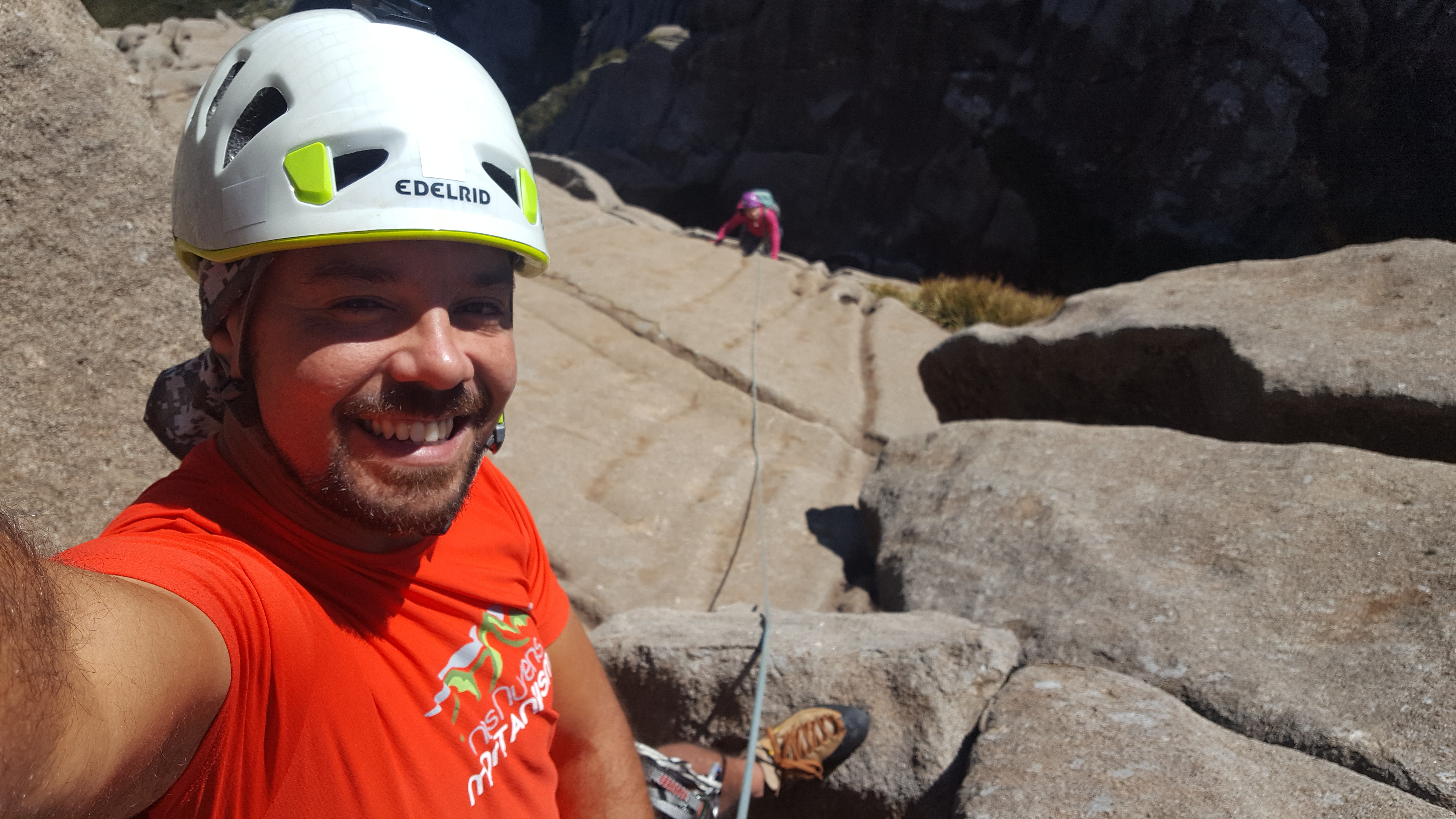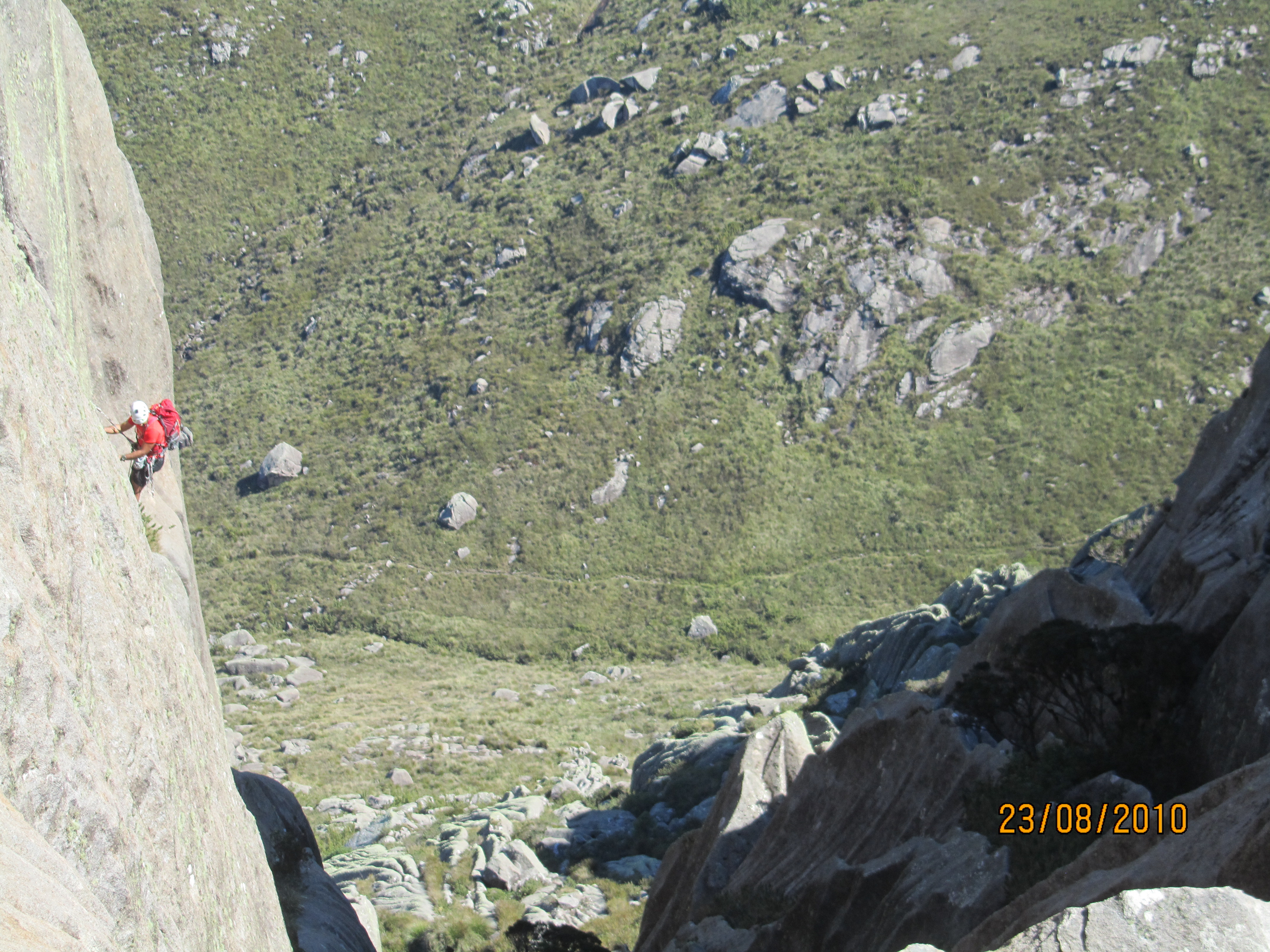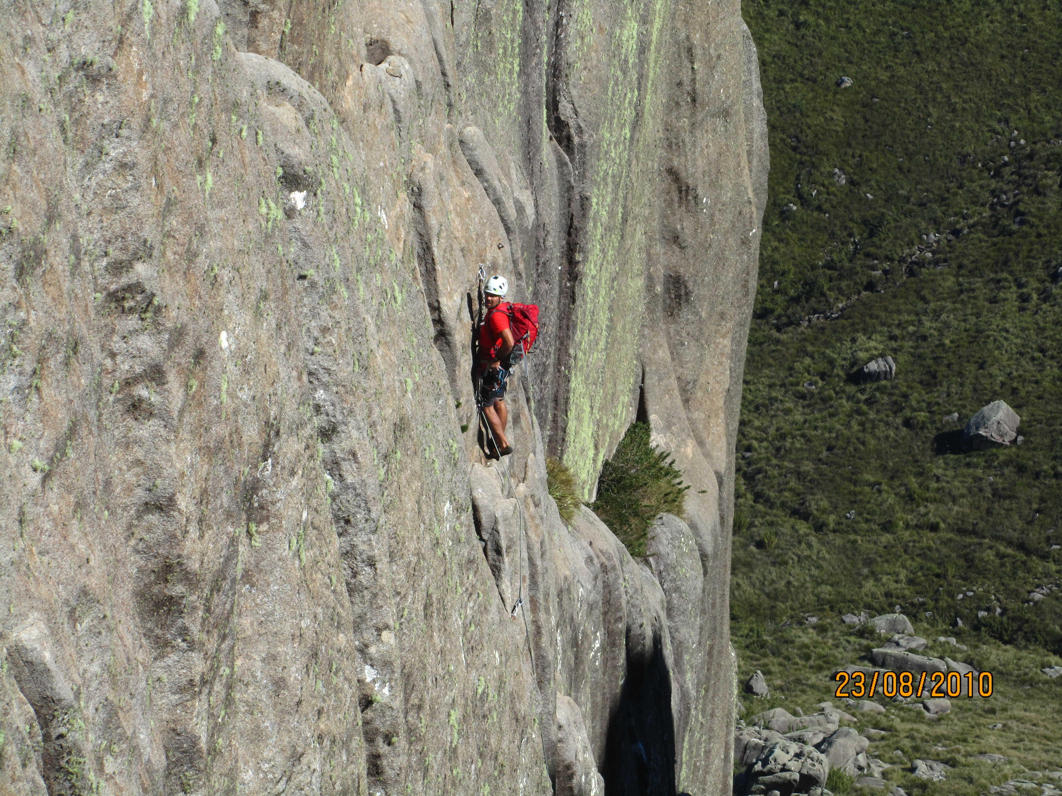 A orientação nessa montanha fica algumas vezes meio ruim já que não estou habituado a tanta pedra e praticamente nada de vegetação, tanto que por um descuido acabamos passando a base da via e tivemos que retornar depois de conversar com um montanhista da região.