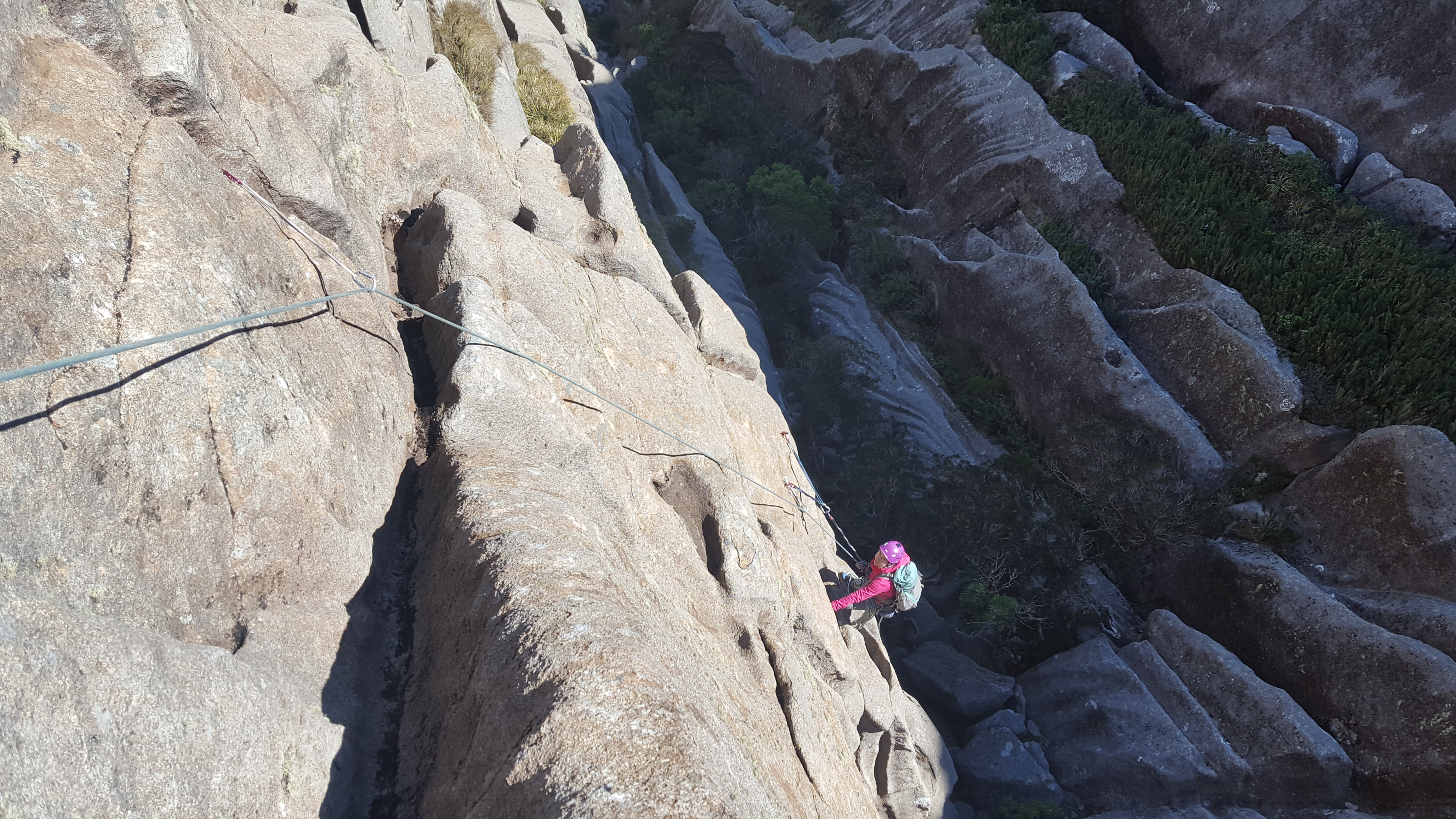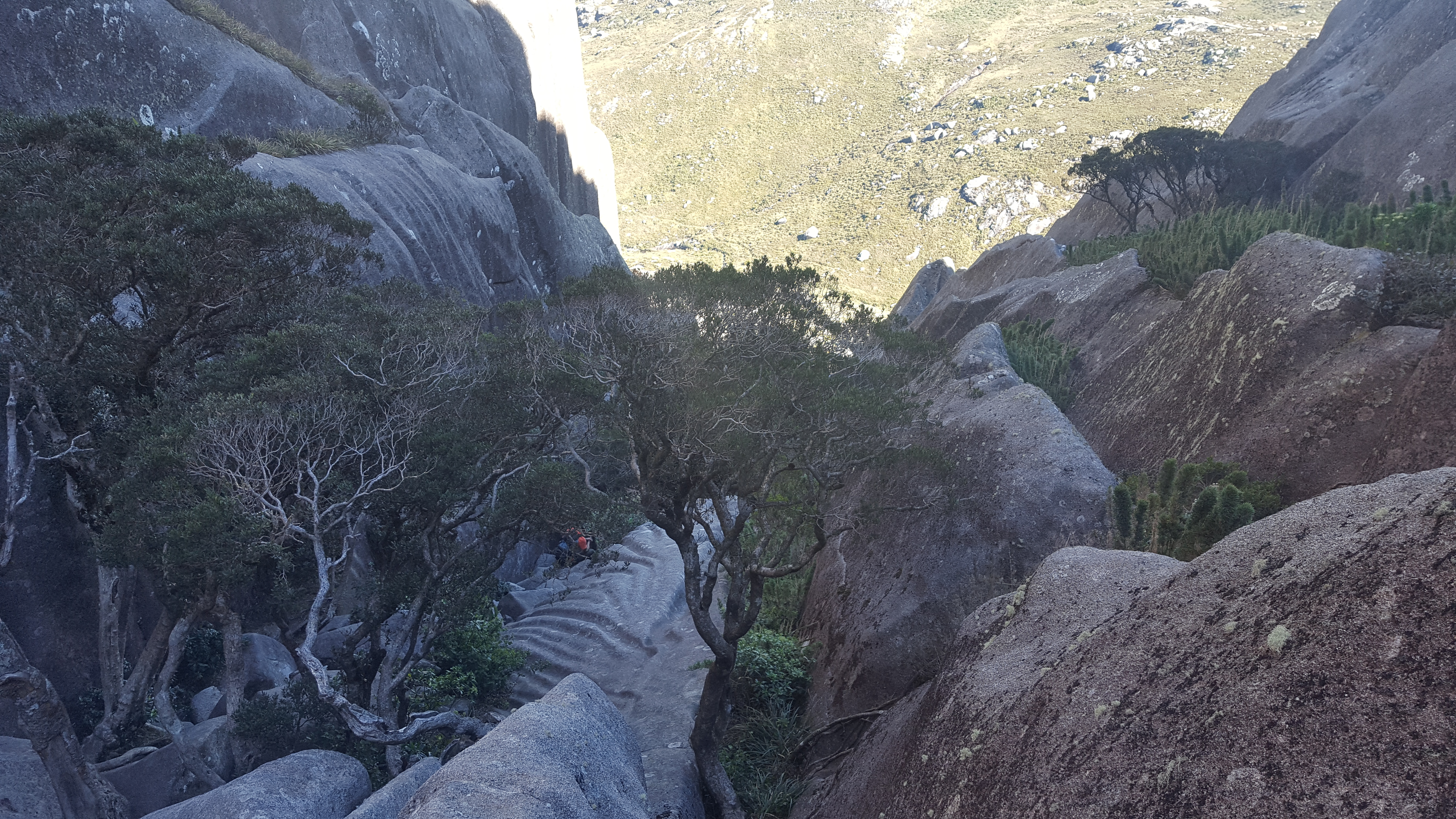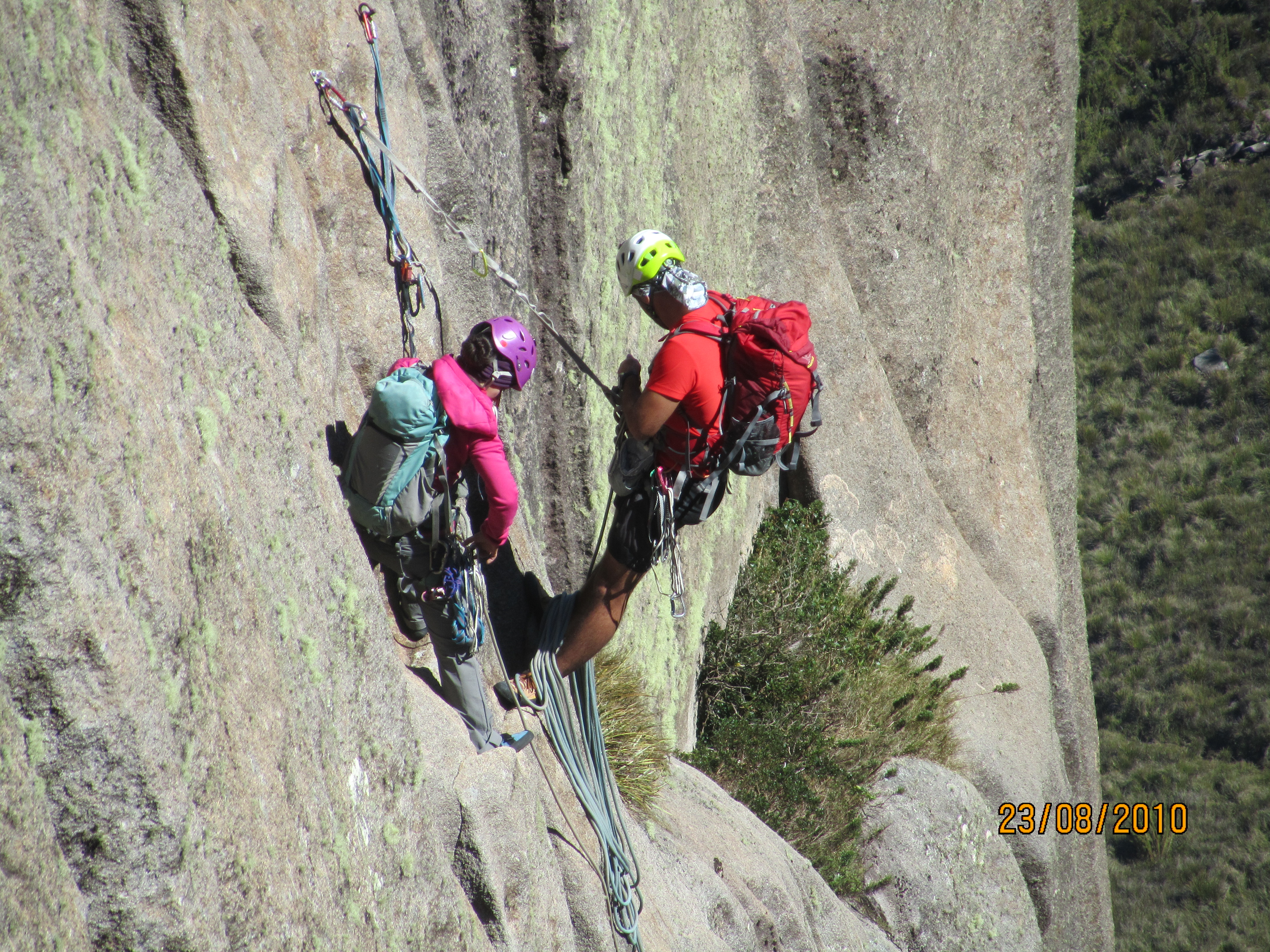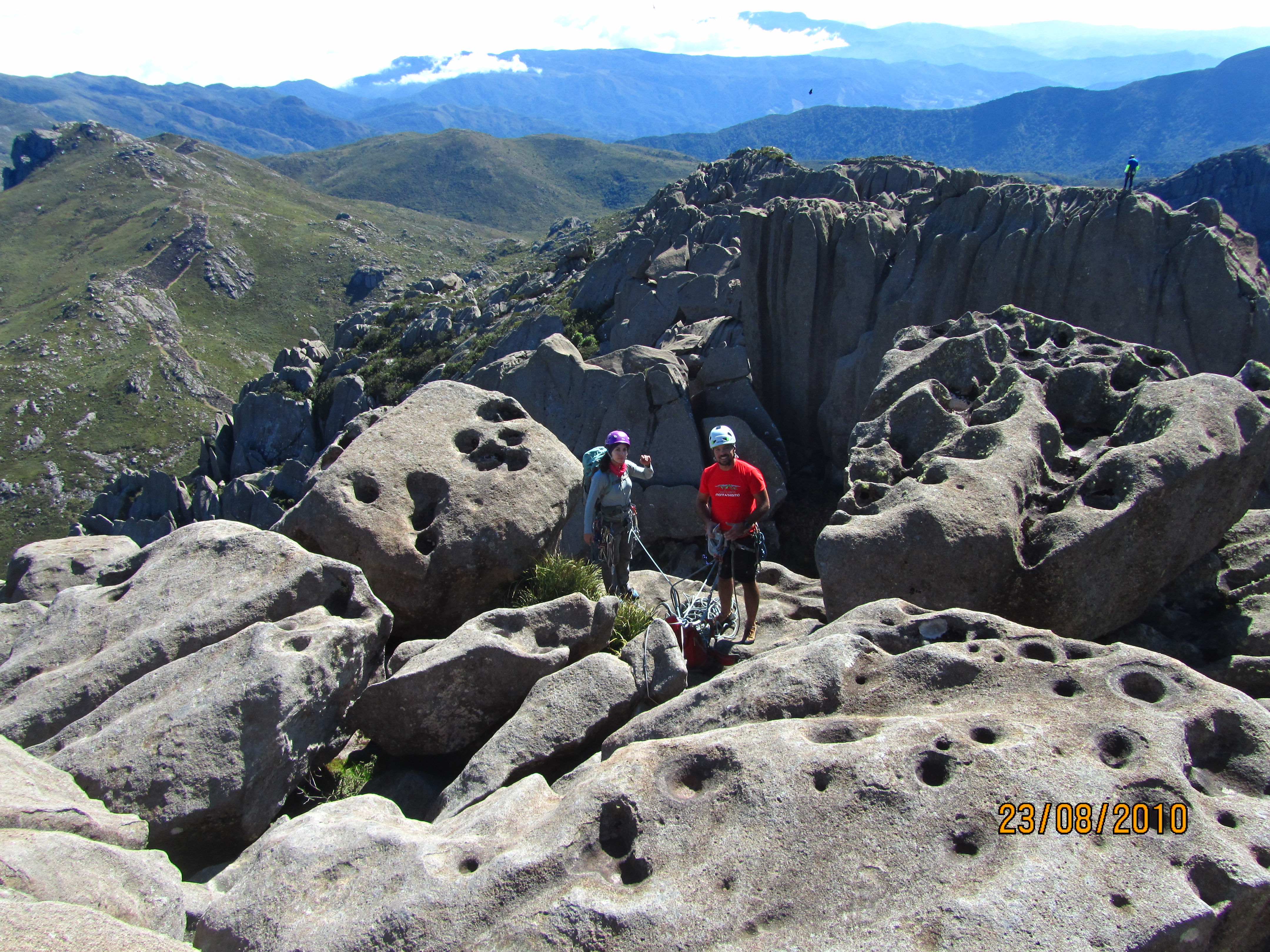 A orientação nessa montanha fica algumas vezes meio ruim já que não estou habituado a tanta pedra e praticamente nada de vegetação, tanto que por um descuido acabamos passando a base da via e tivemos que retornar depois de conversar com um montanhista da região.