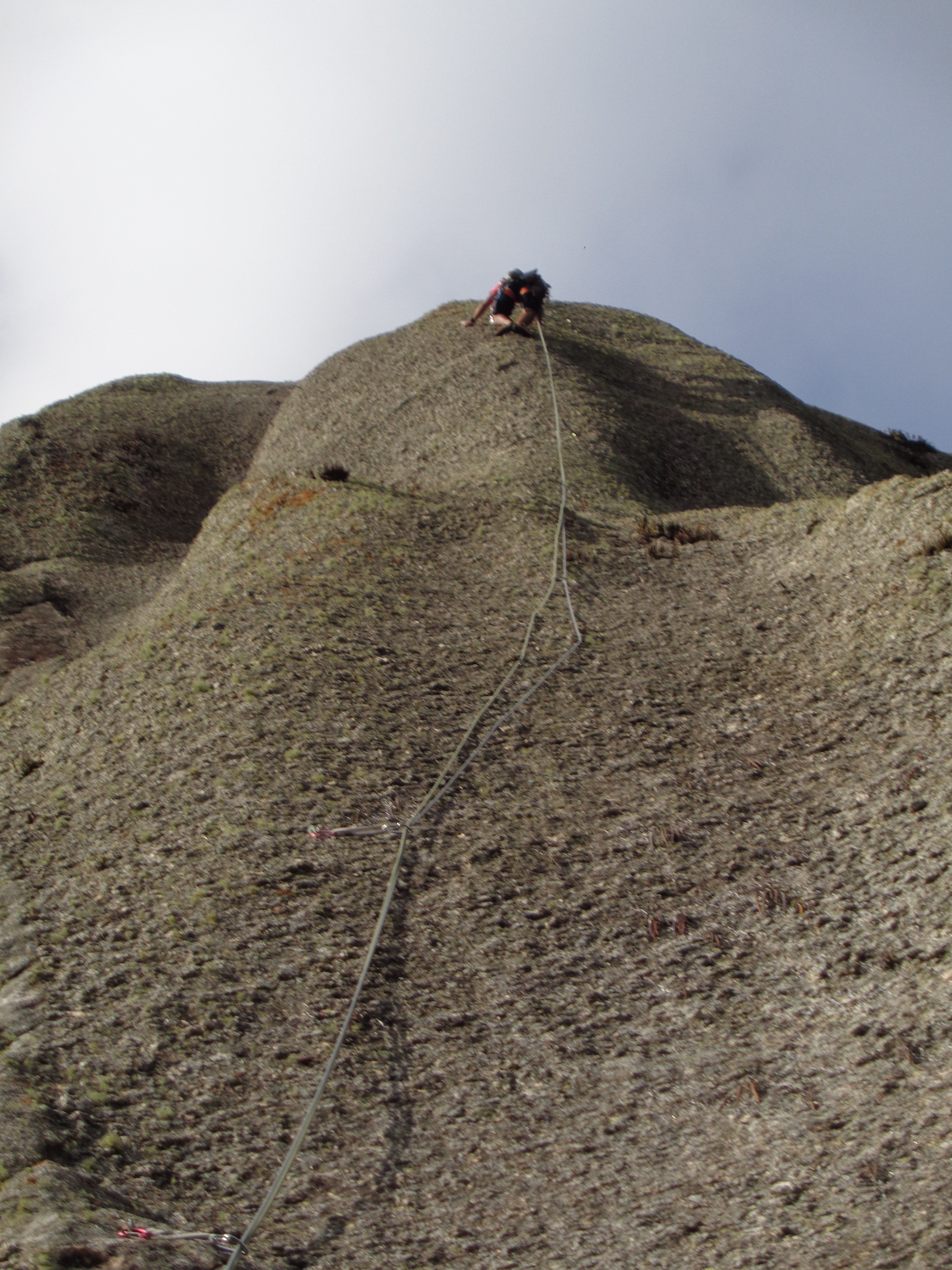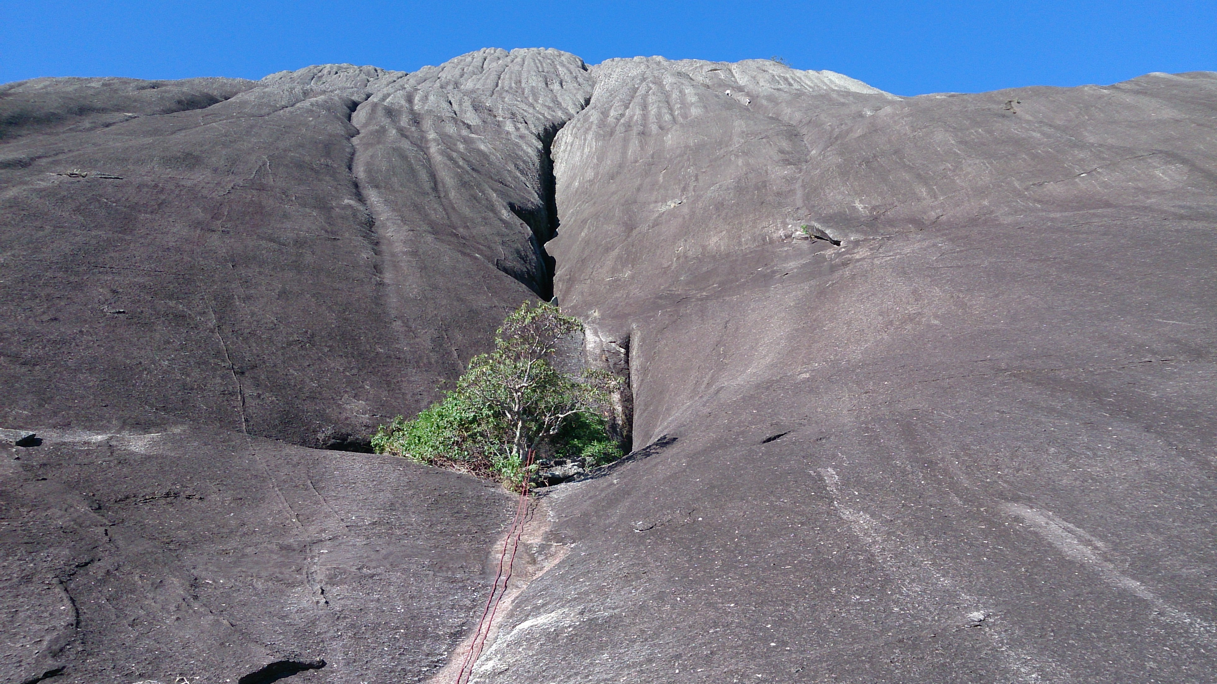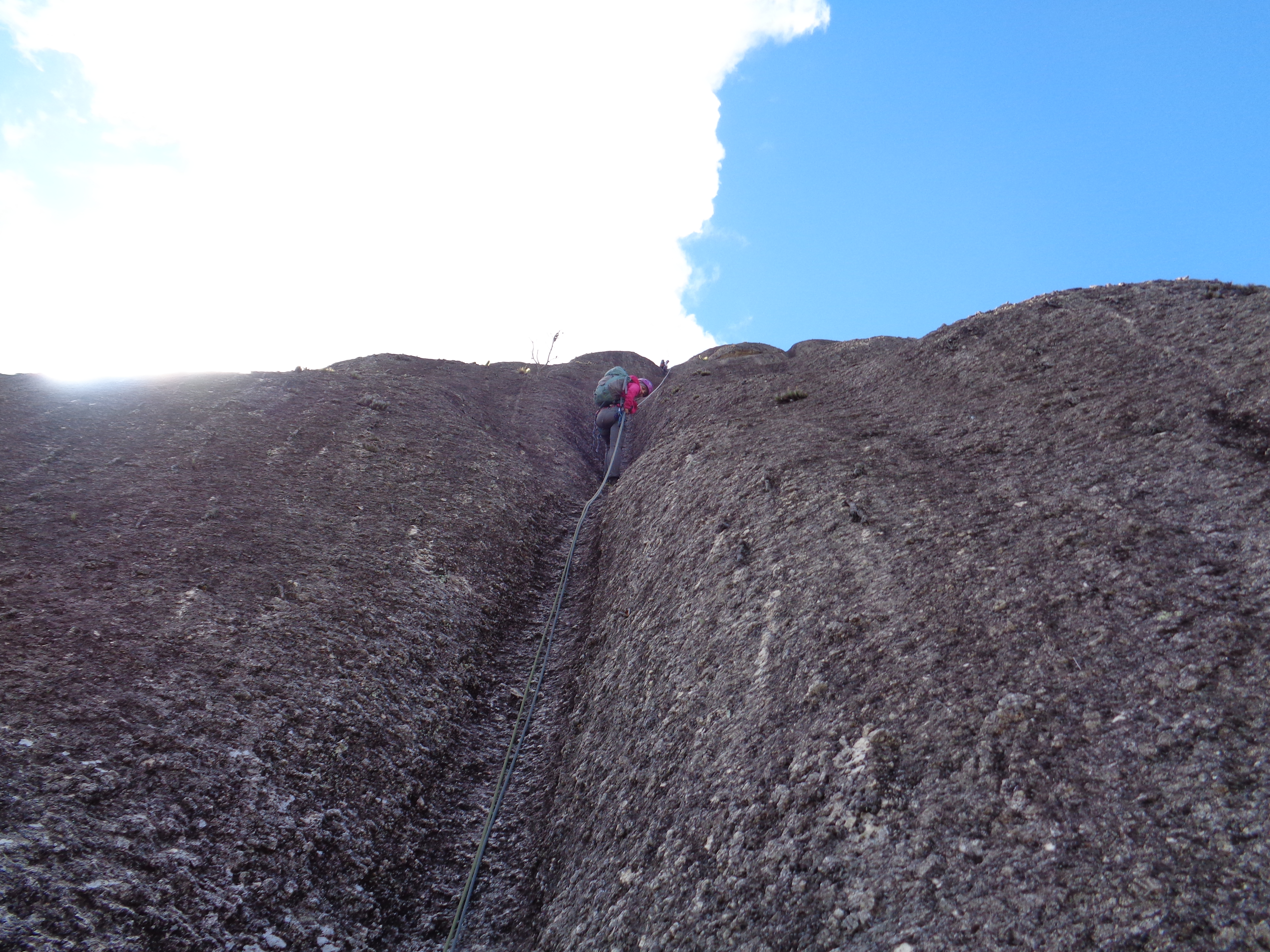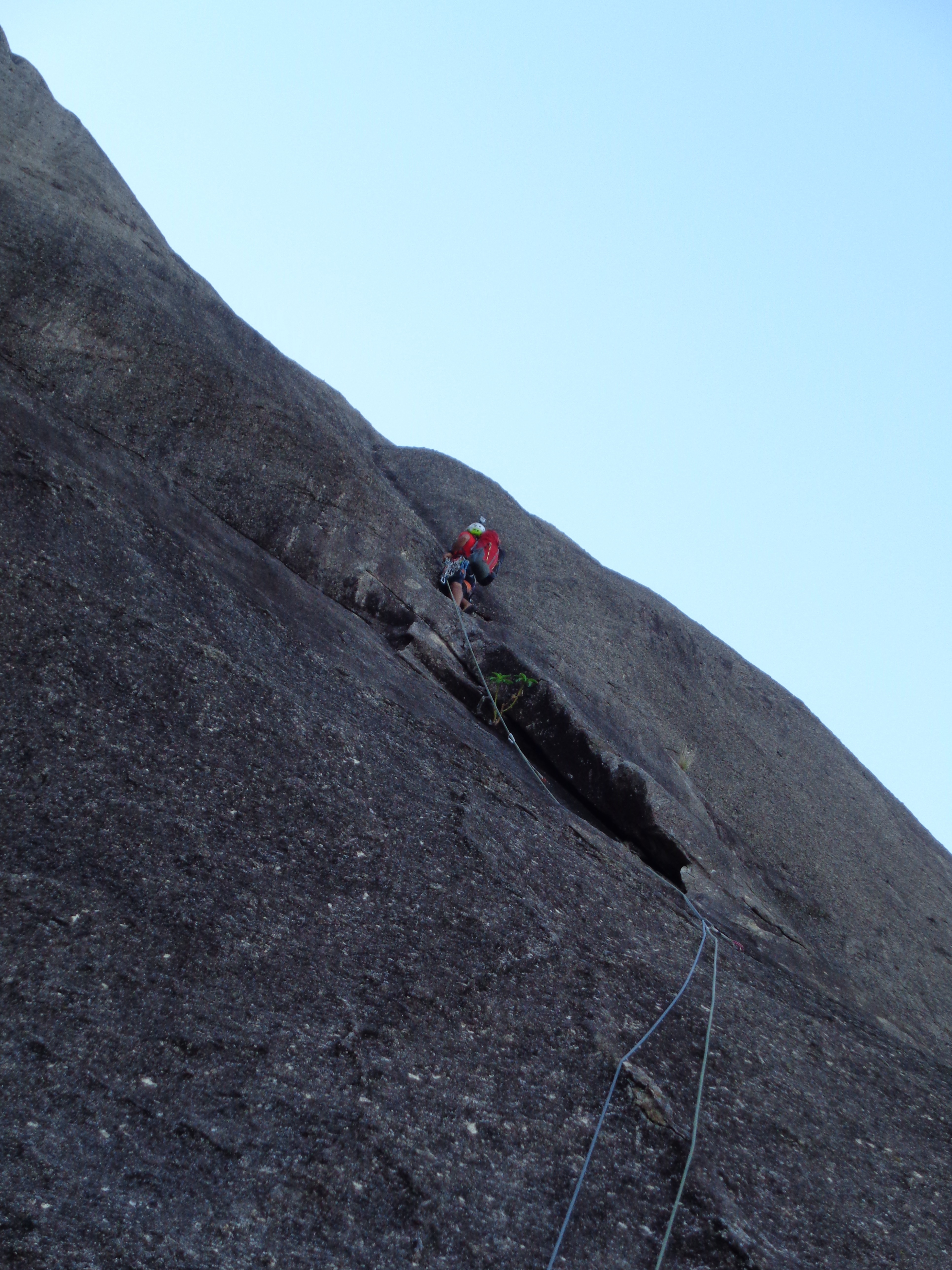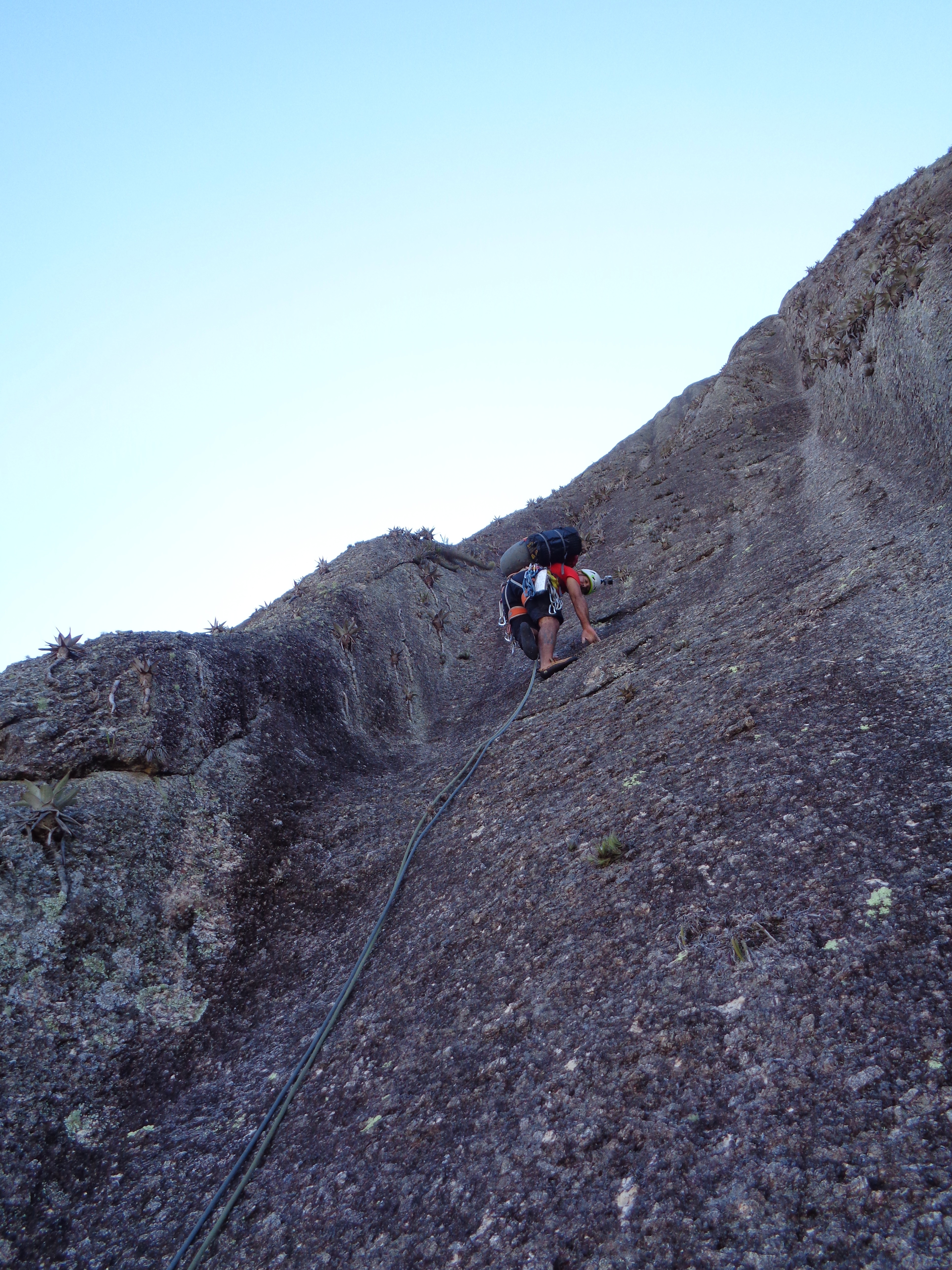 Posso estar enganado mais me pareceu que a partir do Platô de Bivaque a via Moonwalker não é tão escalada quanto a primeira parte, a via é muito mais suja, muito cristal quebrando no pé ou na mão.