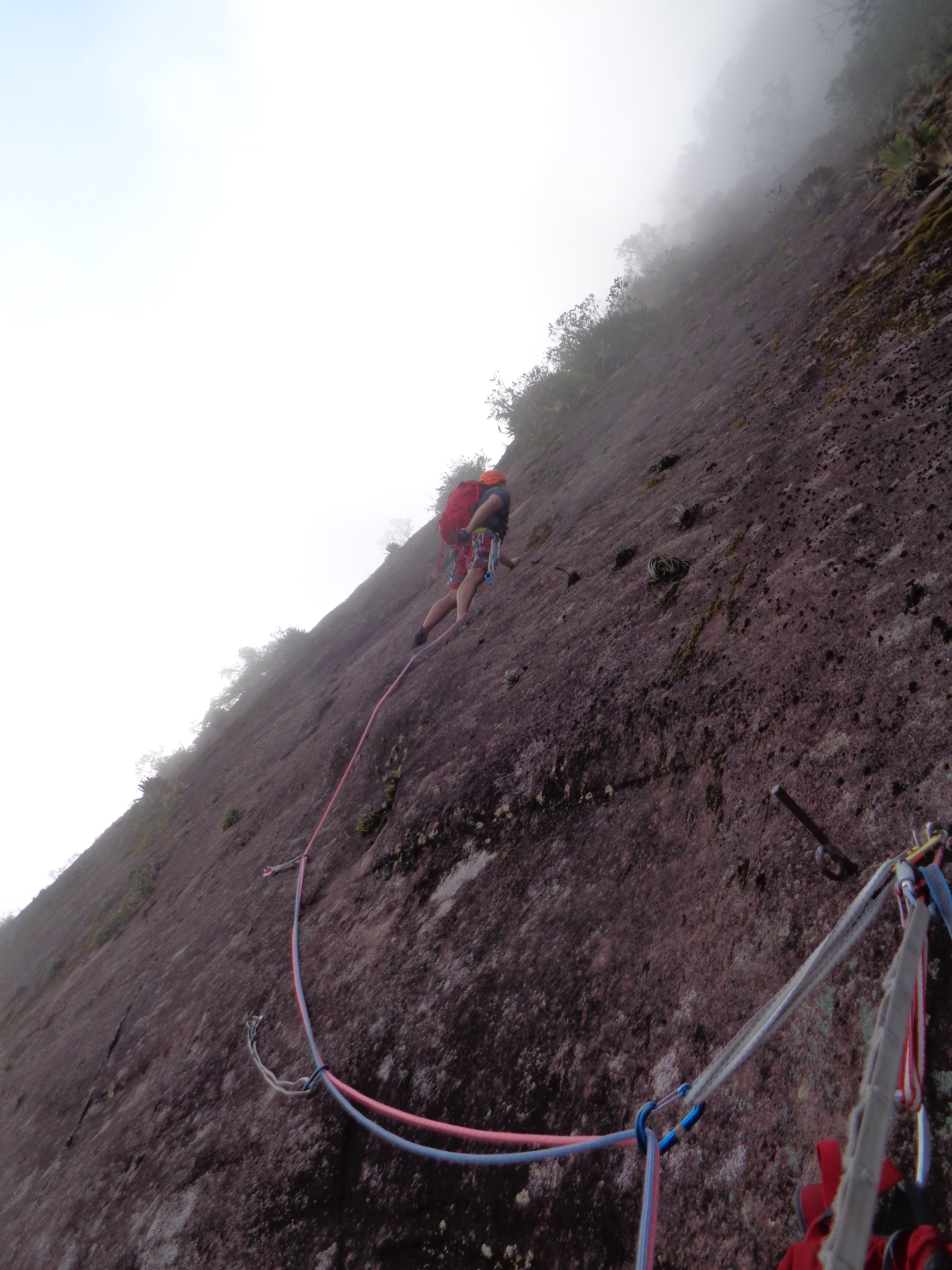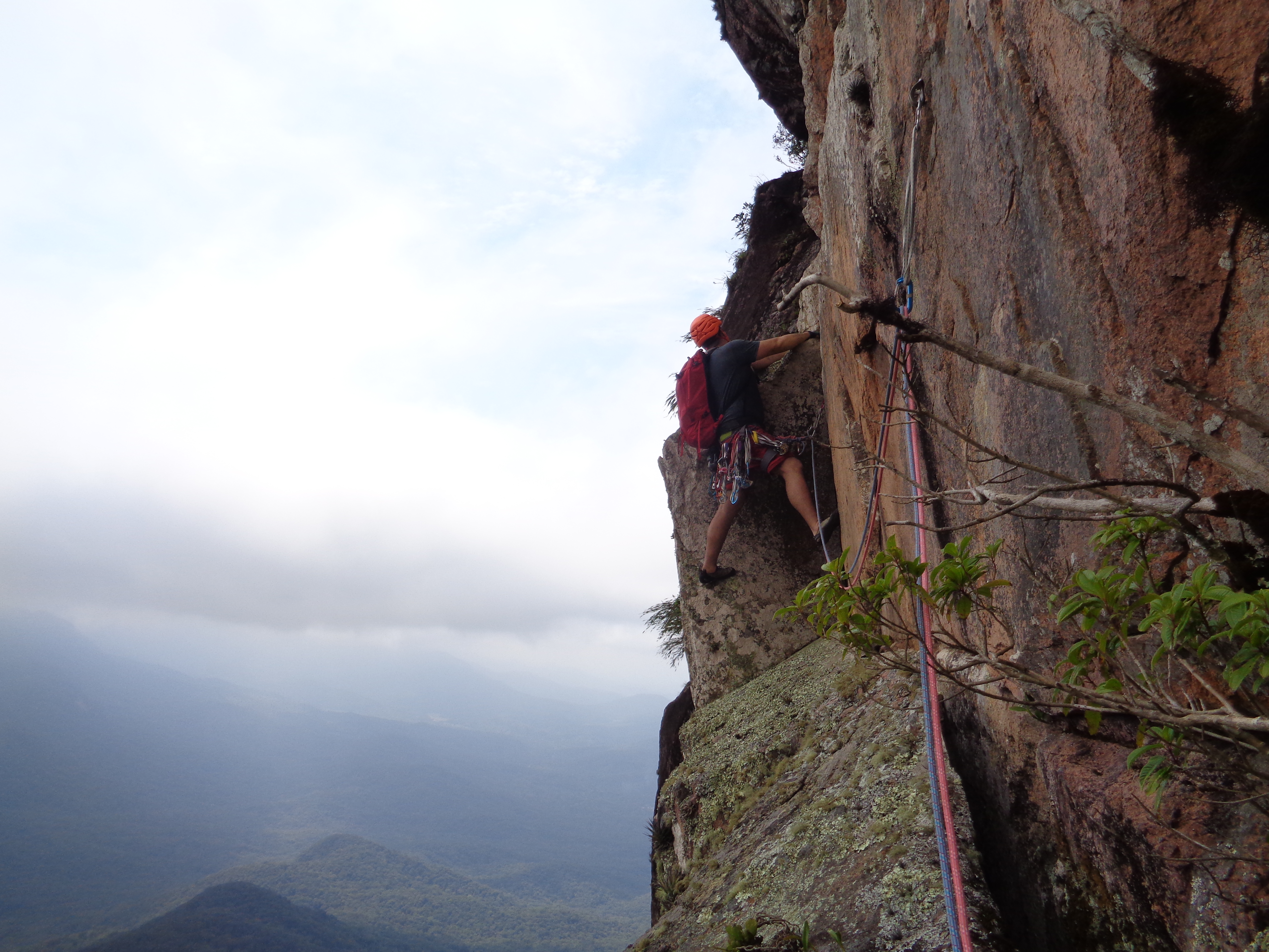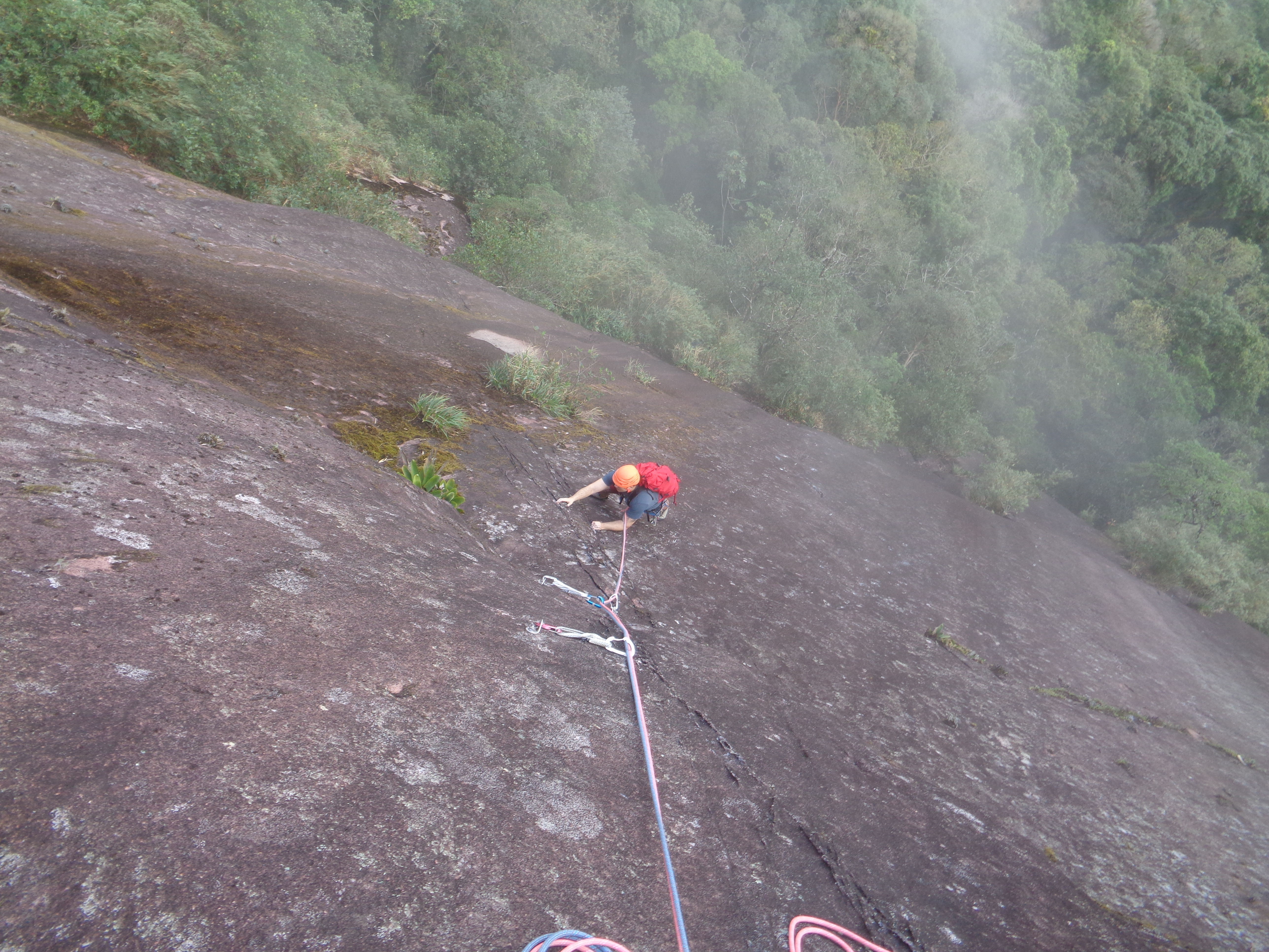 As 08:00 iniciamos a escalada da Cristal Negro, sem ter toda aquela aderência que precisávamos na rocha conseguimos progredir na parede. No final da terceira enfiada foi o lance mais tenso pois a saída para o mato estava totalmente molhada e escorregadia, desse ponto já não conseguimos saber se a dupla que vinha atrás continuaria seu projeto.