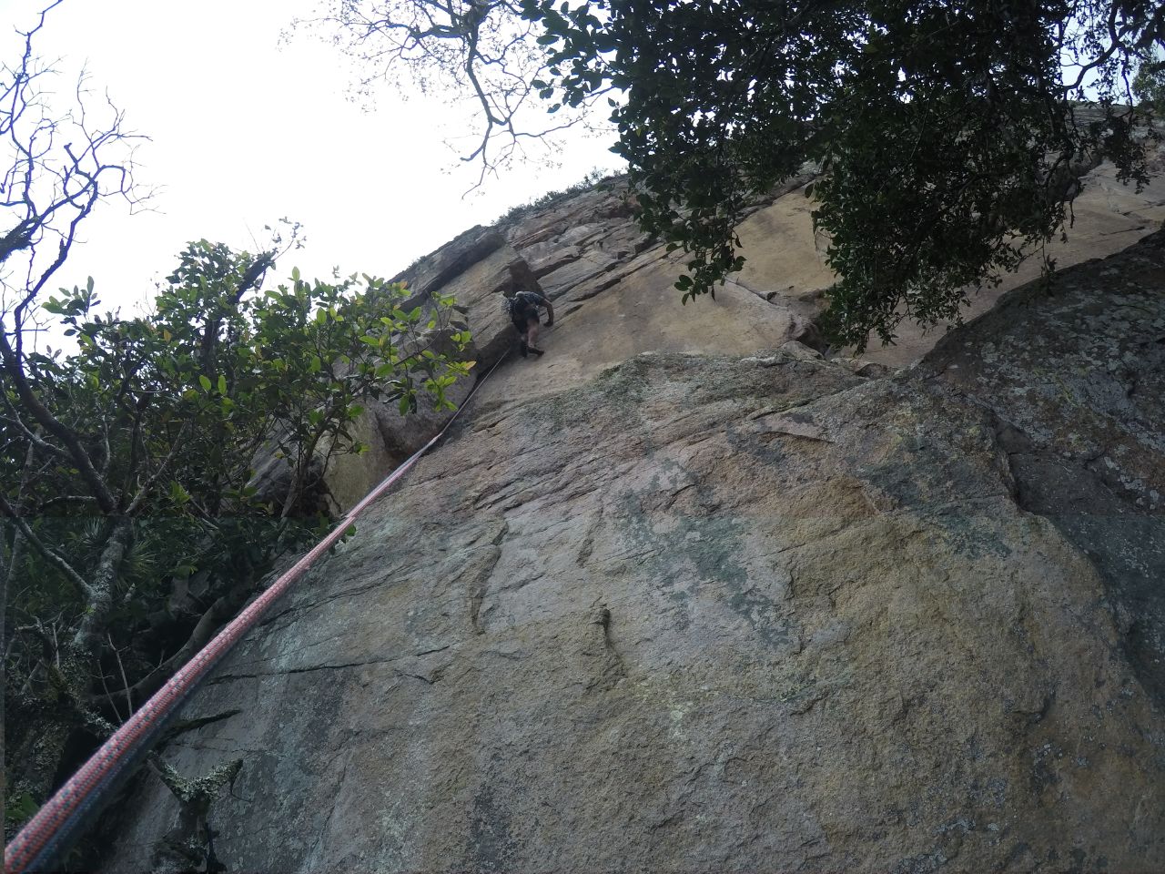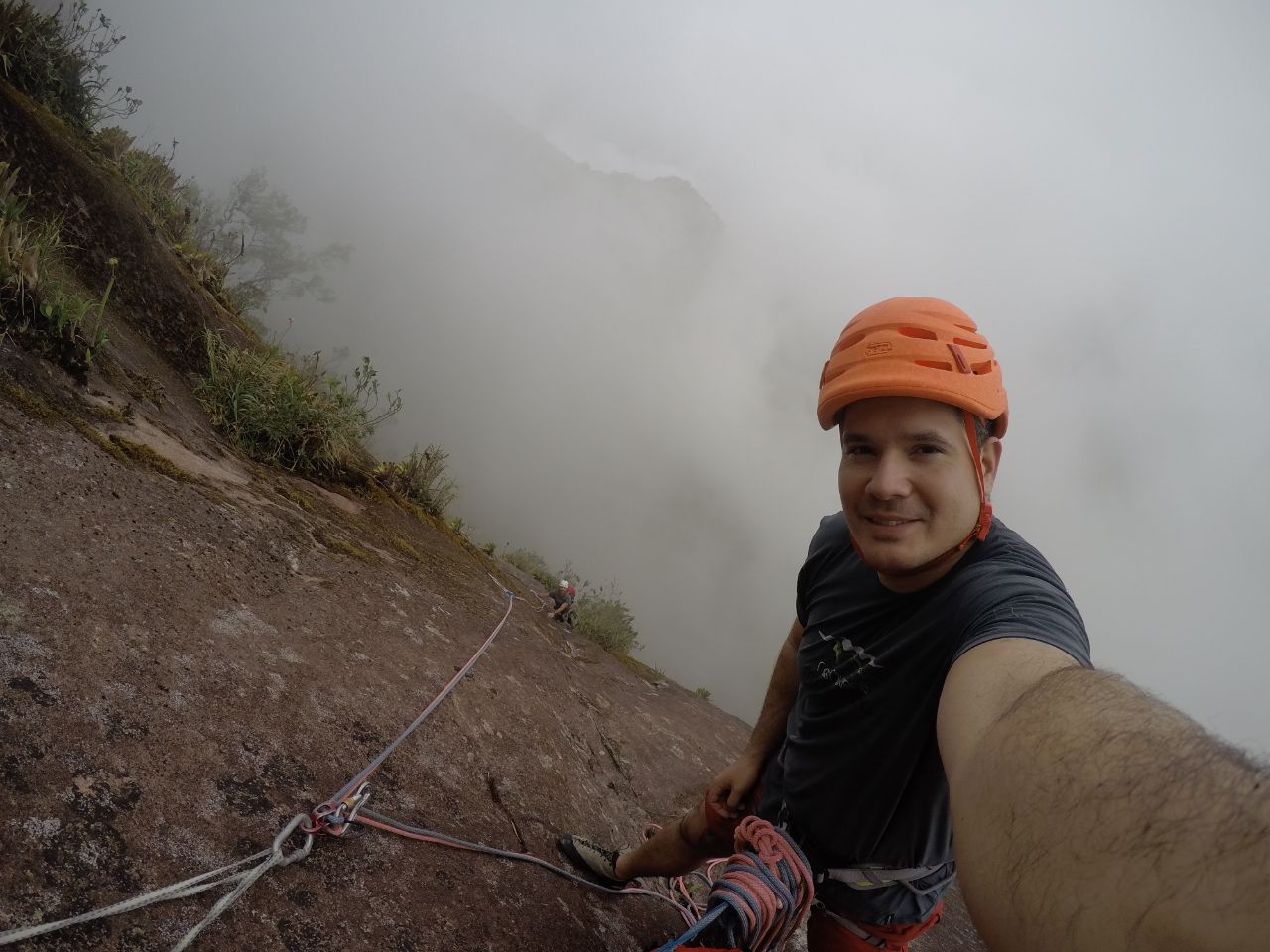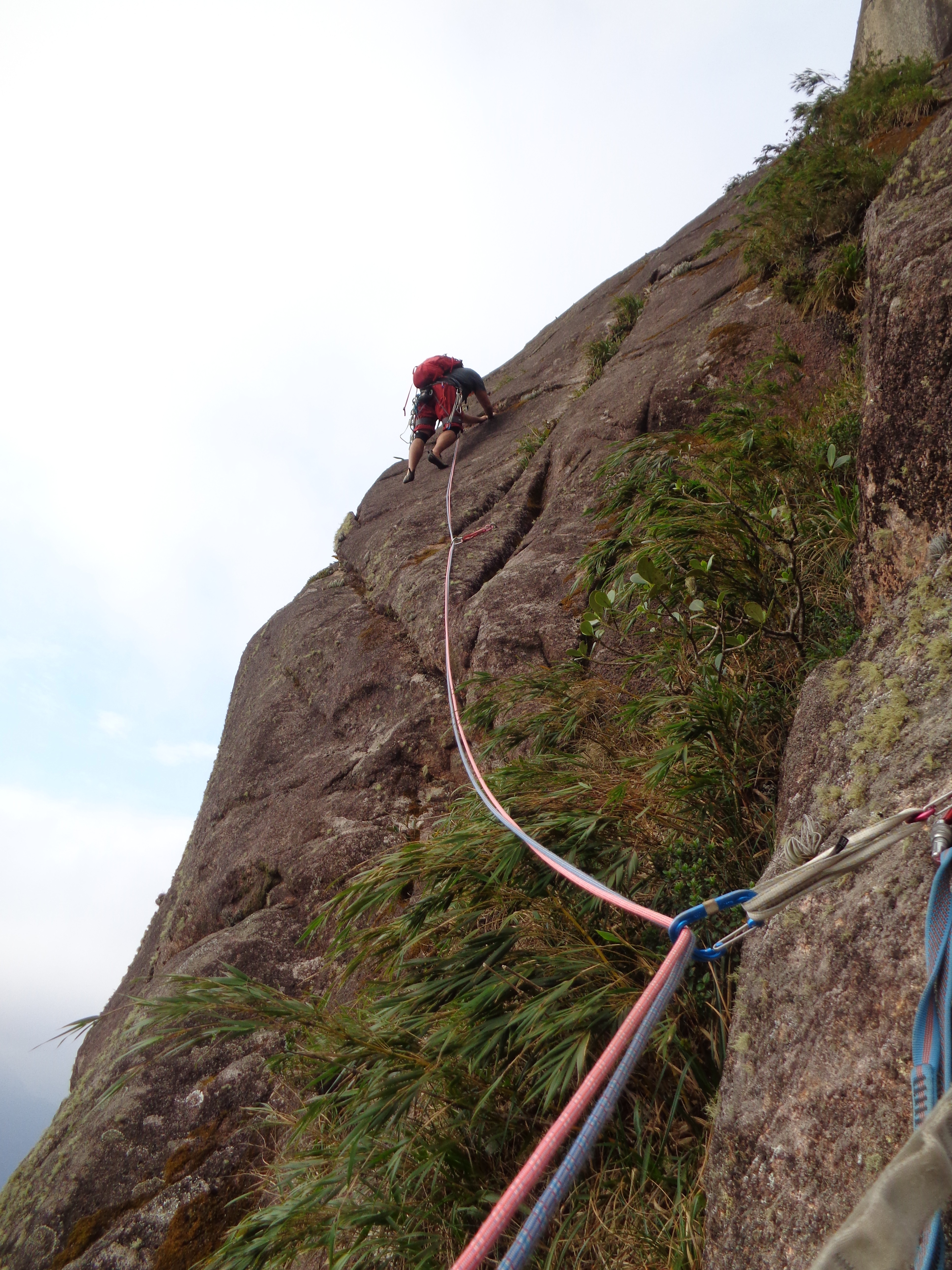 As 08:00 iniciamos a escalada da Cristal Negro, sem ter toda aquela aderência que precisávamos na rocha conseguimos progredir na parede. No final da terceira enfiada foi o lance mais tenso pois a saída para o mato estava totalmente molhada e escorregadia, desse ponto já não conseguimos saber se a dupla que vinha atrás continuaria seu projeto.
