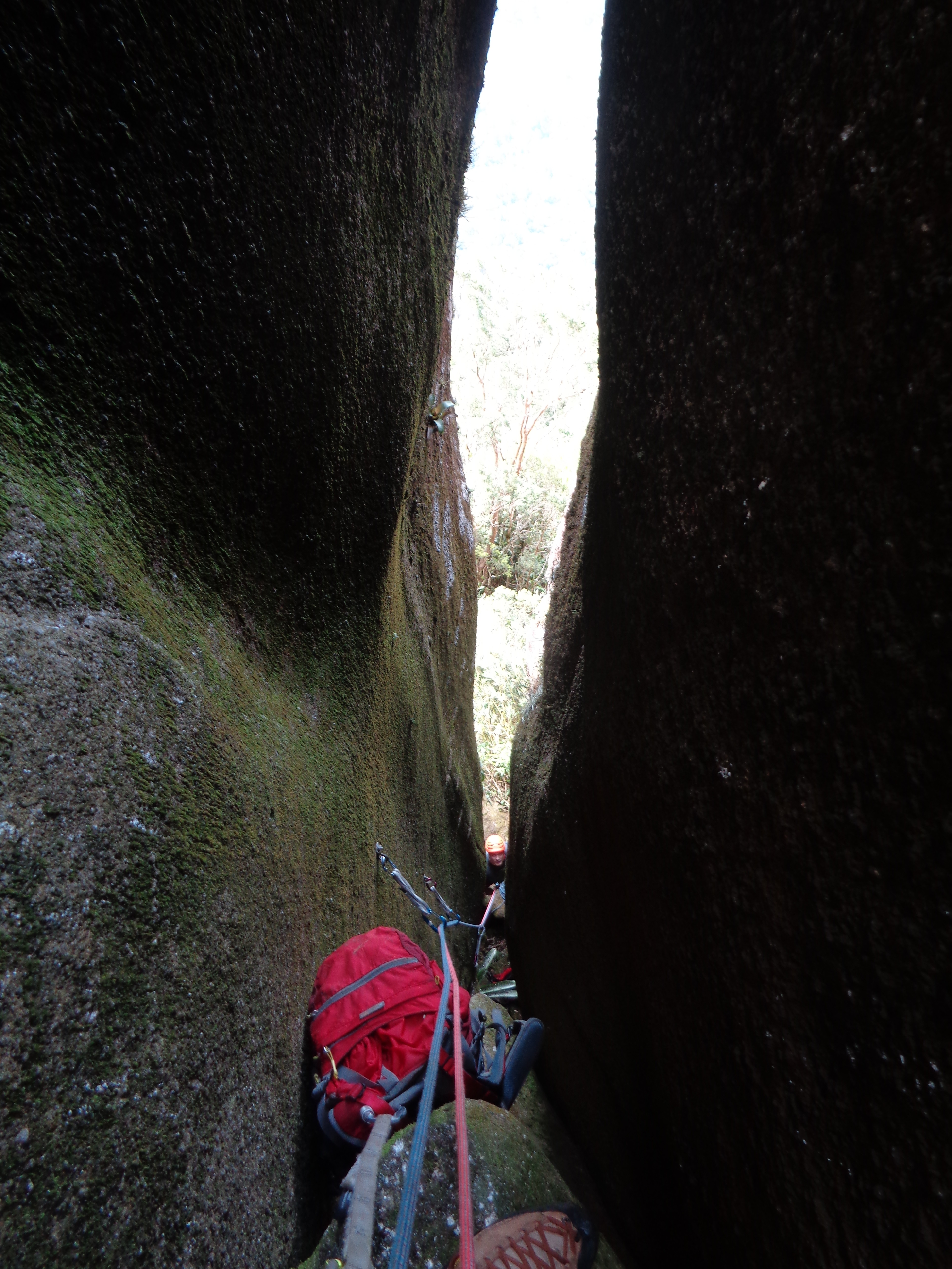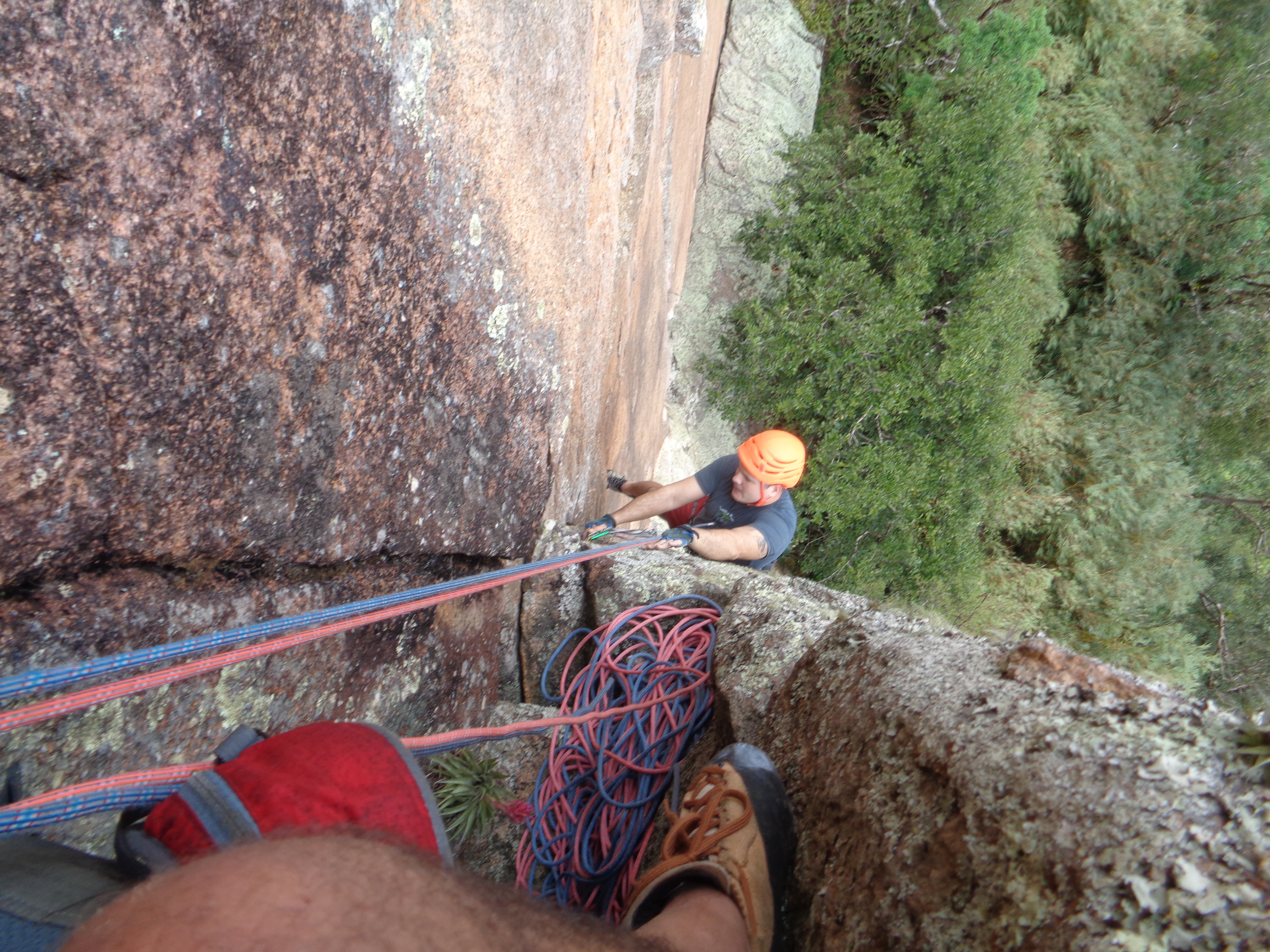 Sem achar nenhum rastro seguimos varando mato até o segundo degrau, onde depois de muito trabalho encontramos a base da via Viagem a Ixtlan. lindos lances de oposição em diedro protegido em móvel na primeira enviada e uma transversal um tanto suja na segunda para então entramos novamente no vara mato rumo ao Parque do Lineu.