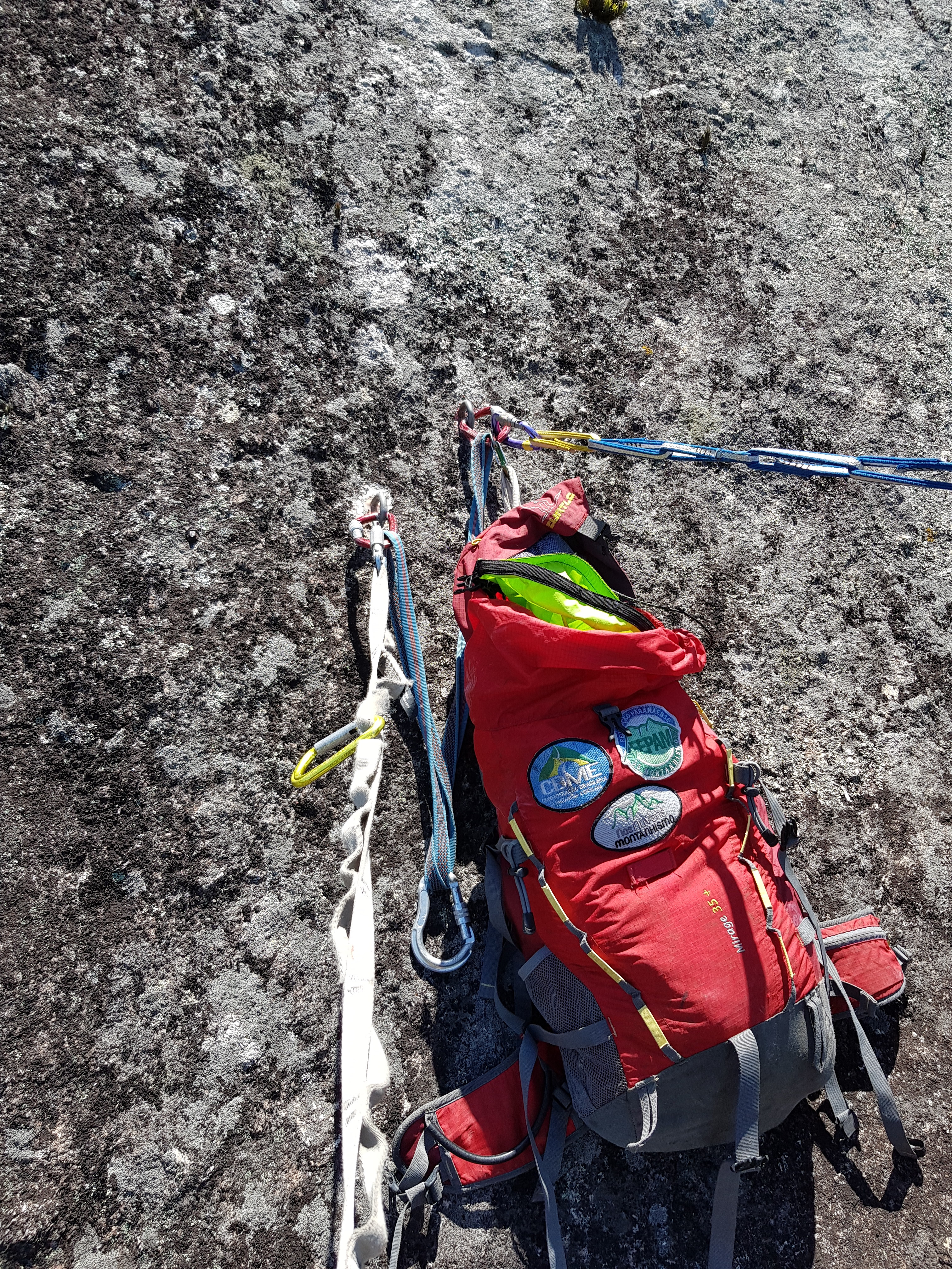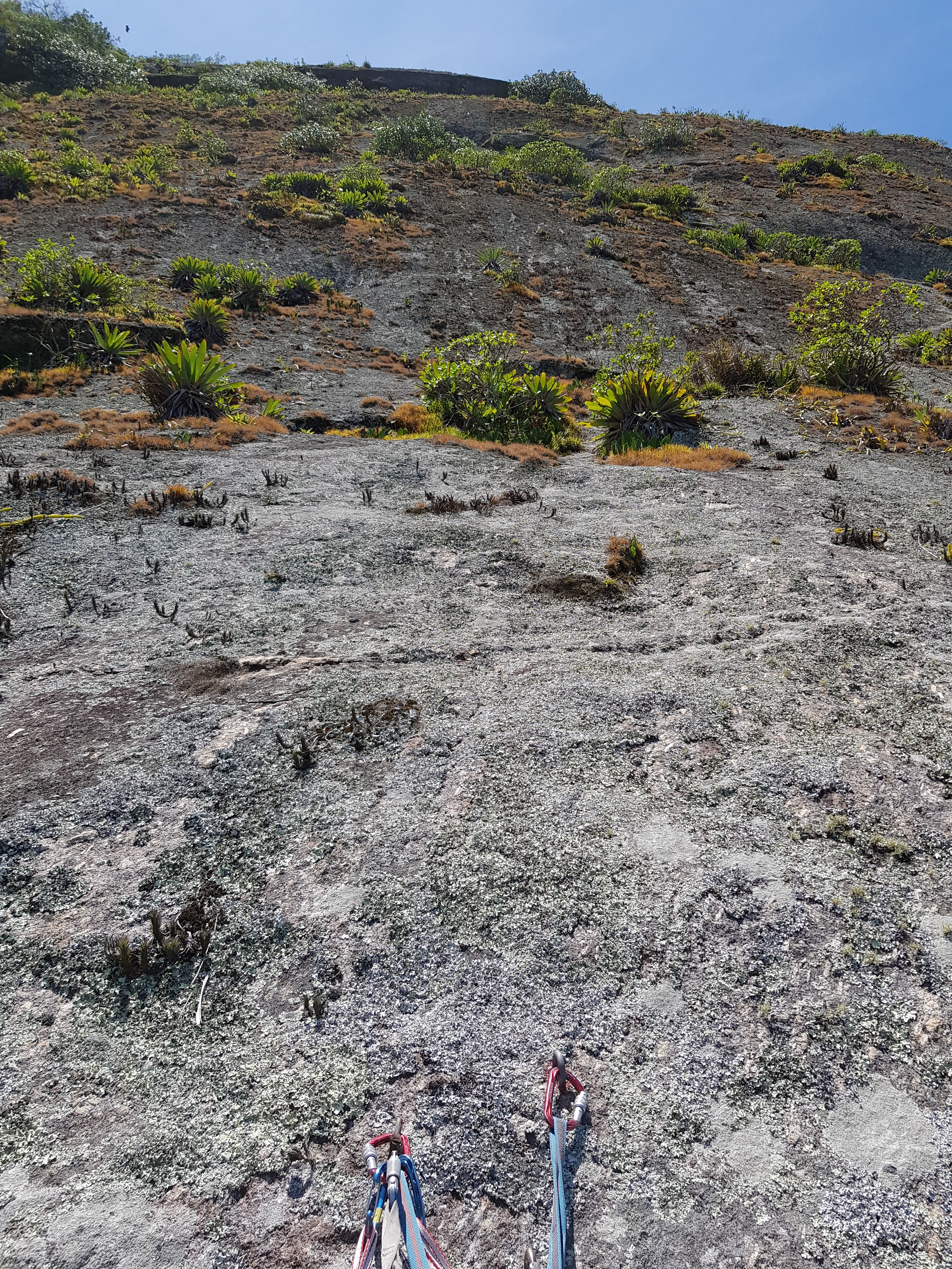 Em uma das cordadas acabei passando uma das proteções, quando estava quase chegando na próxima chapa e olhei para traz, percebi que tinha esticado muito, e de forma alguma poderia escorregar naquele lance. Escalar E3 já é meio foda, pulando proteção então …