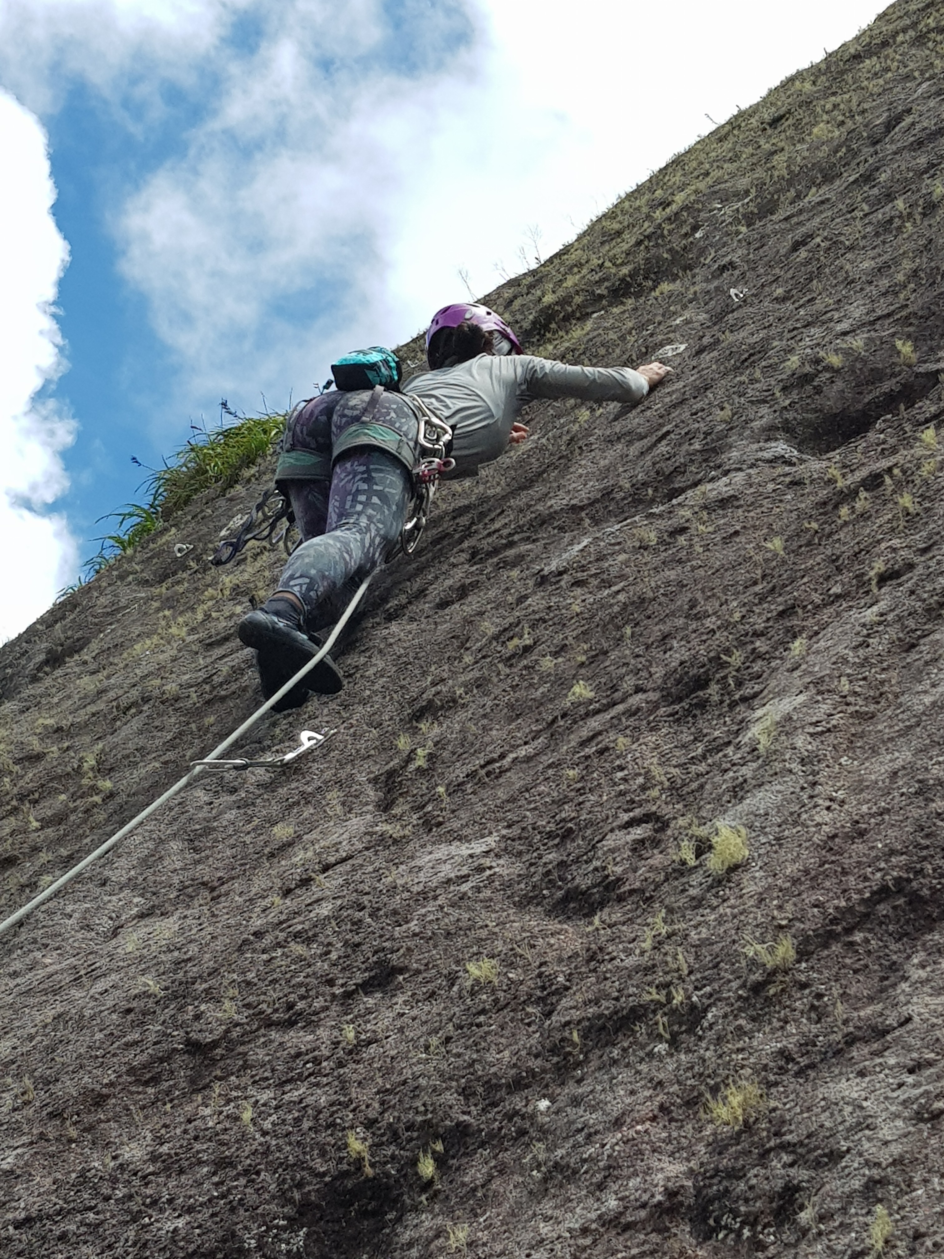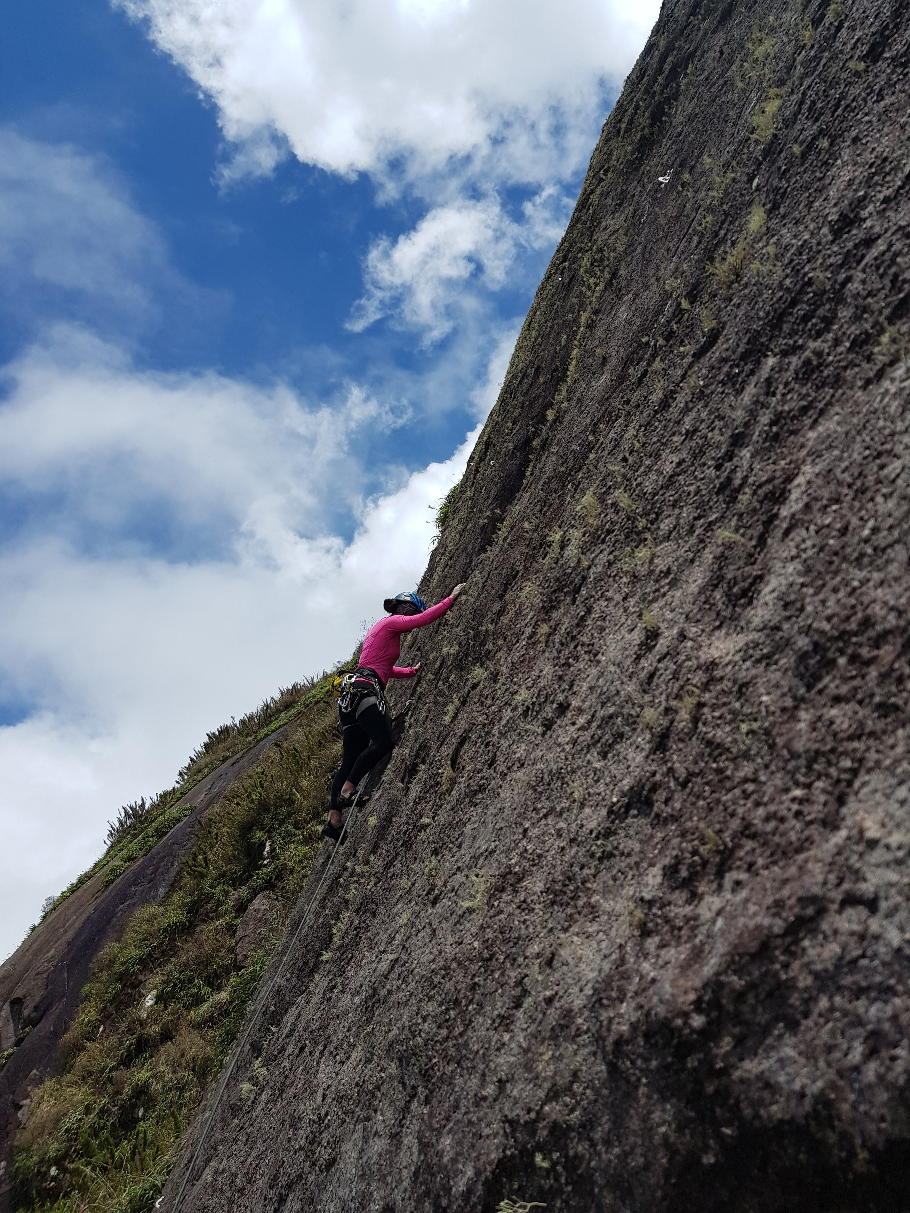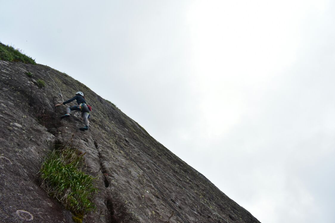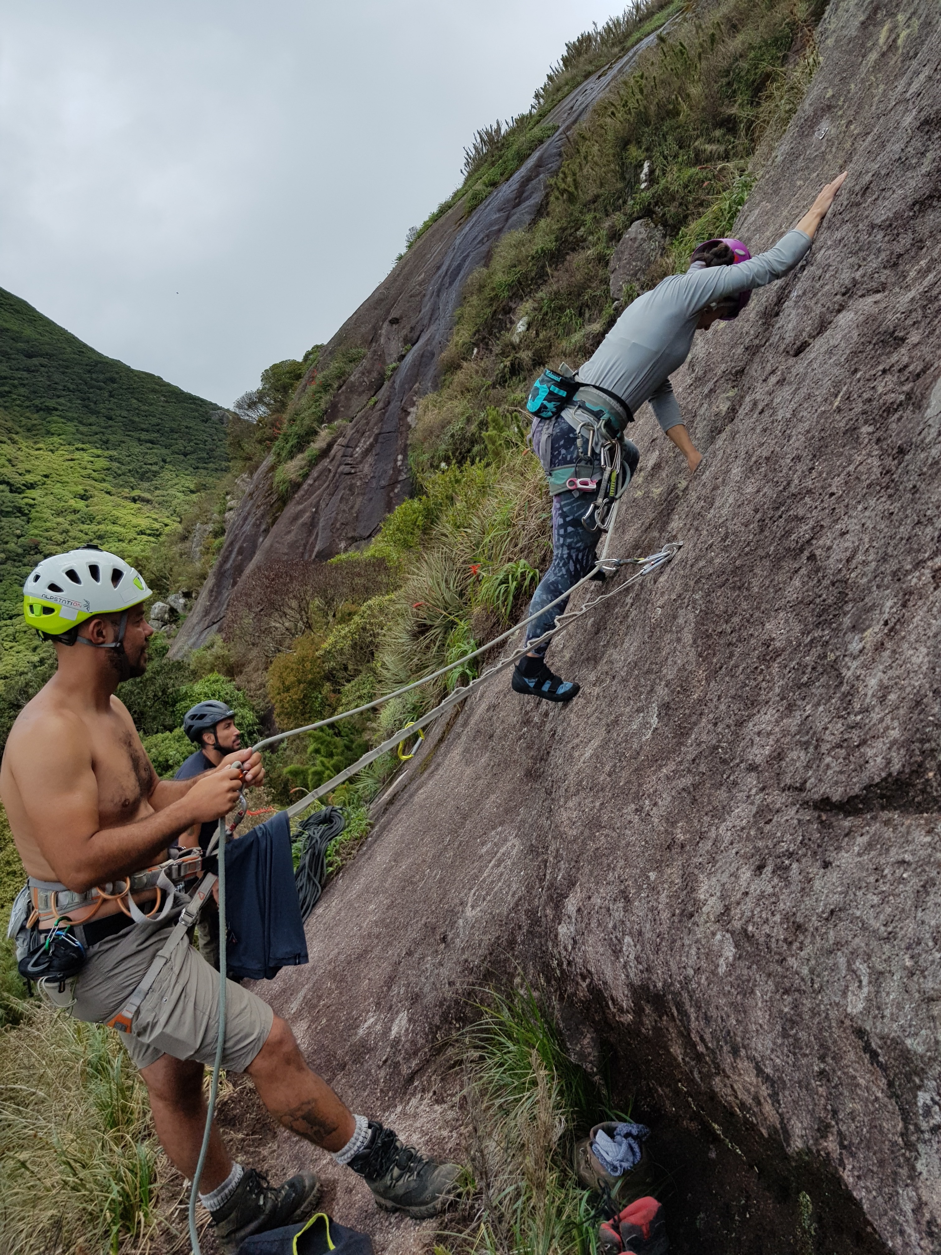 Enquanto analisava se continuaria a escalada ou não, avaliei os riscos ali envolvido caso tivesse uma queda. Depois de calcular cada movimento até chegar no final da via gritei para Michelle “escalando”, e segui cada lance que tinha visualizado antecipadamente.