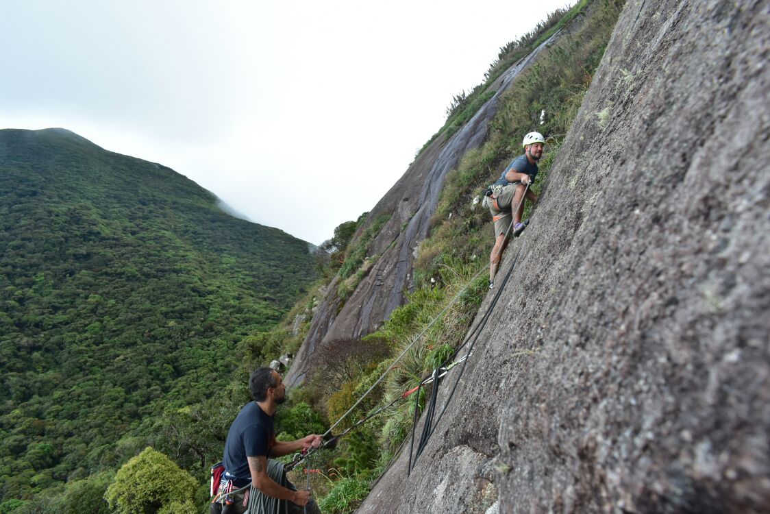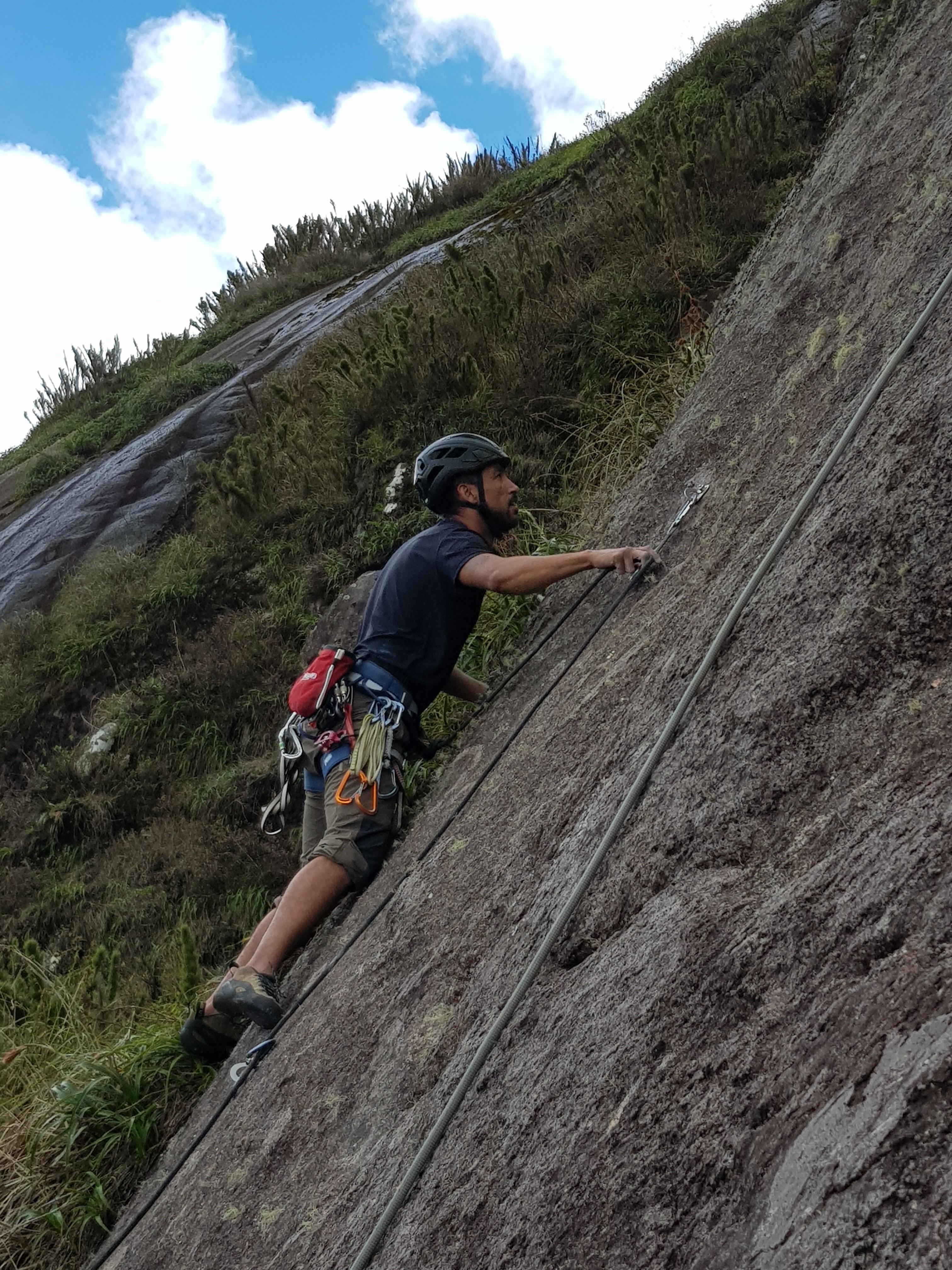 Guiei a via 10 anos até a última chapeleta antes da parada, dali para frente a parede estava completamente encharcada. Pedi para Michelle, que estava na minha segue, segurar um pouco a corda enquanto analisava esse último trecho da escalada. Lembro dela gritando lá de baixo, “não vai se machucar Natan, daqui alguns dias pegamos férias”.