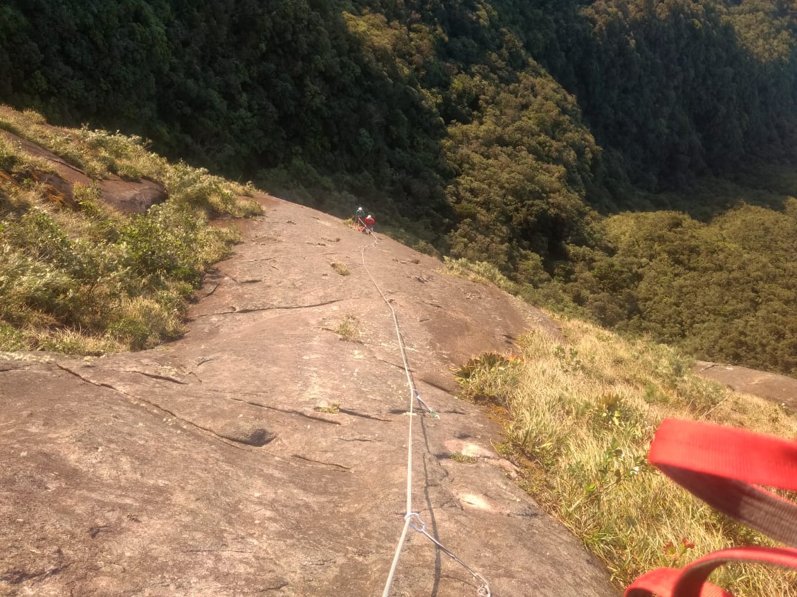 Eu guiei, Lorena guiou, chegou a vez do Juliano que puxou na ponta da corda a terceira enfiada. Lances mais esportivos e verticais, mas tudo muito bem protegido, uma característica que quase não se vê no Marumbi. Na quarta enfiada a Lorena pediu a ponta da corda novamente, foi a enfiada que na última vez que entrou ela não conseguiu passar. No meio dessa enfiada era o crux, que novamente depois de muitas tentativas, infelizmente não conseguiu passar.
