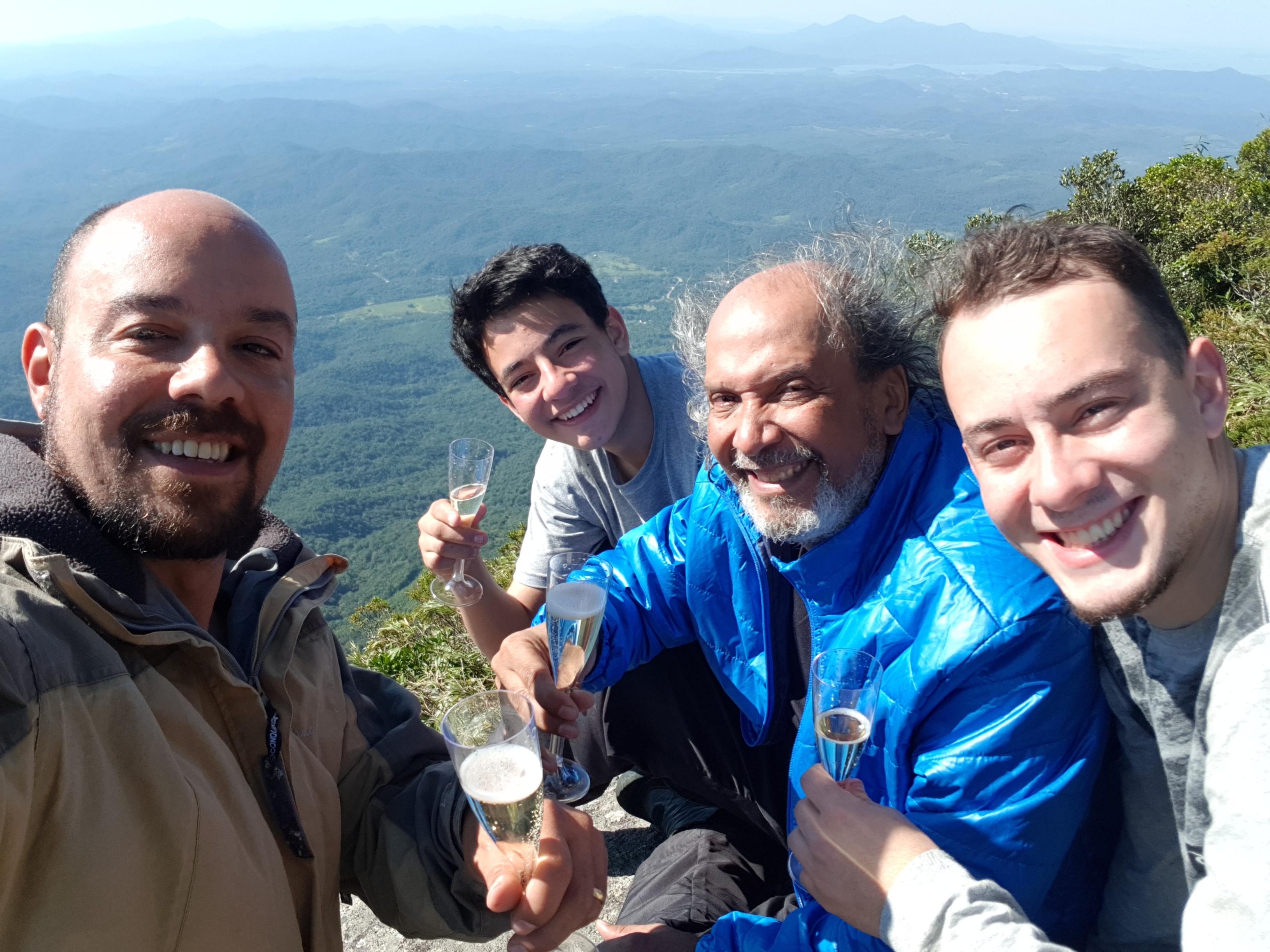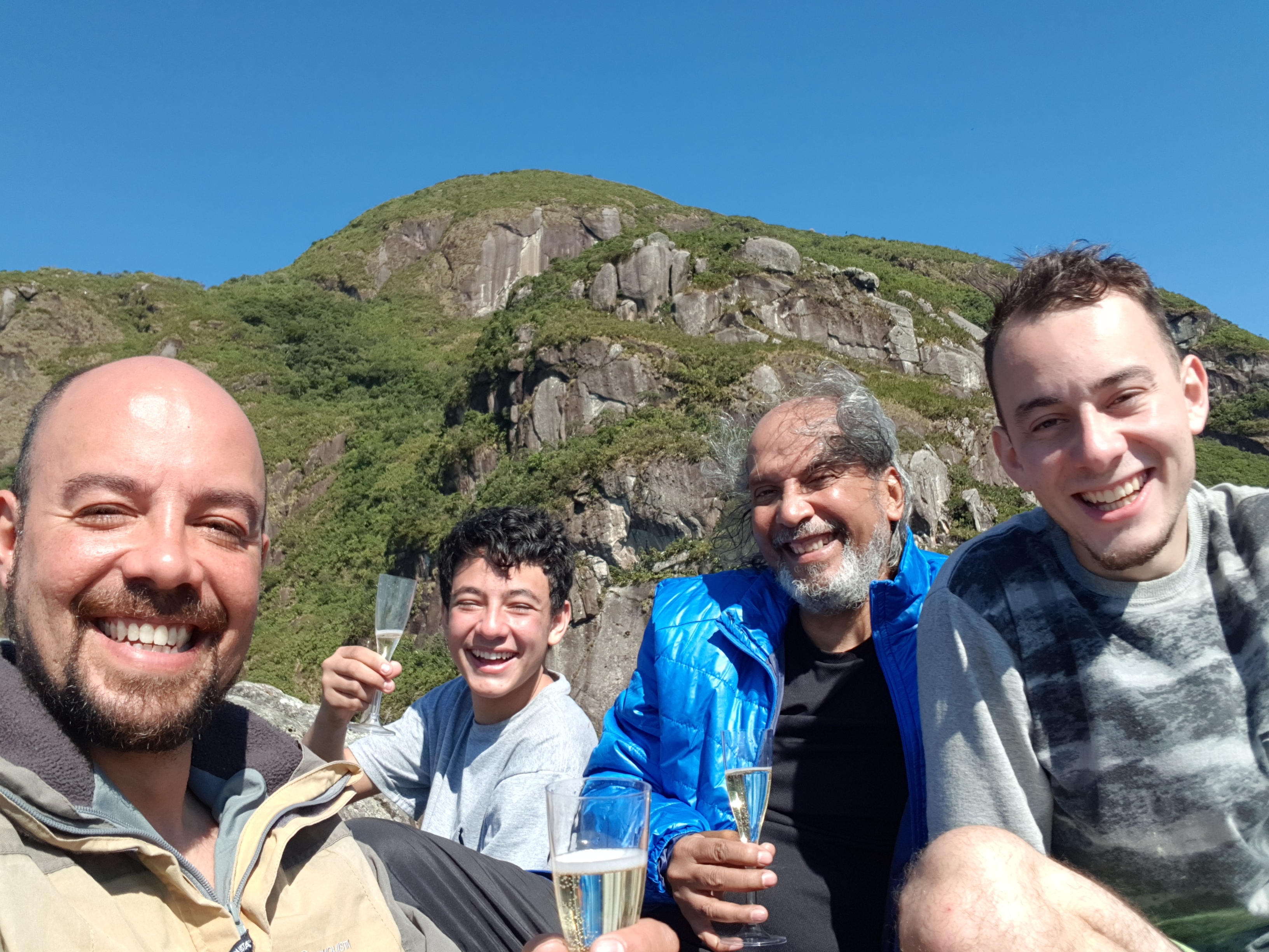O dia colaborou, o cume do Abrolhos estava com um visual fantástico e para comemorar as bodas de prata levei um champanhe para brindar. Foi um dia especial para mim, e a presença do meu pai e dos meus filhos foi muito significativo.