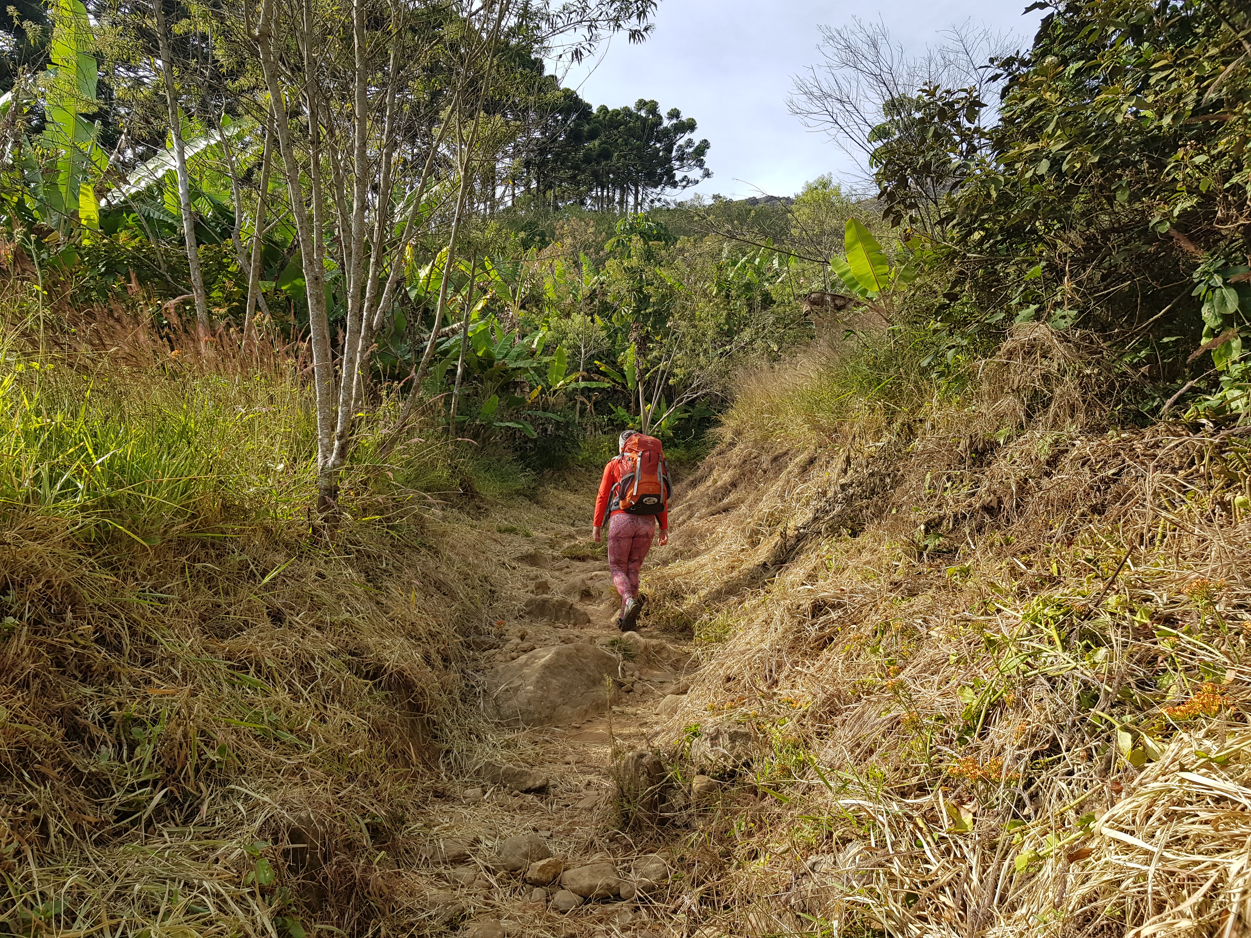 A caminhada até a base da via é bem tranquila, seguindo pela trilha principal que dá acesso ao Baú saindo do restaurante, deve levar uns 30 minutos no máximo. Assim que chegar na base da primeira escadaria é só pegar uma trilha a esquerda, uns 100 metros à frente começa a via Transbaú – 5°sup VIIa E3 D3 280m.