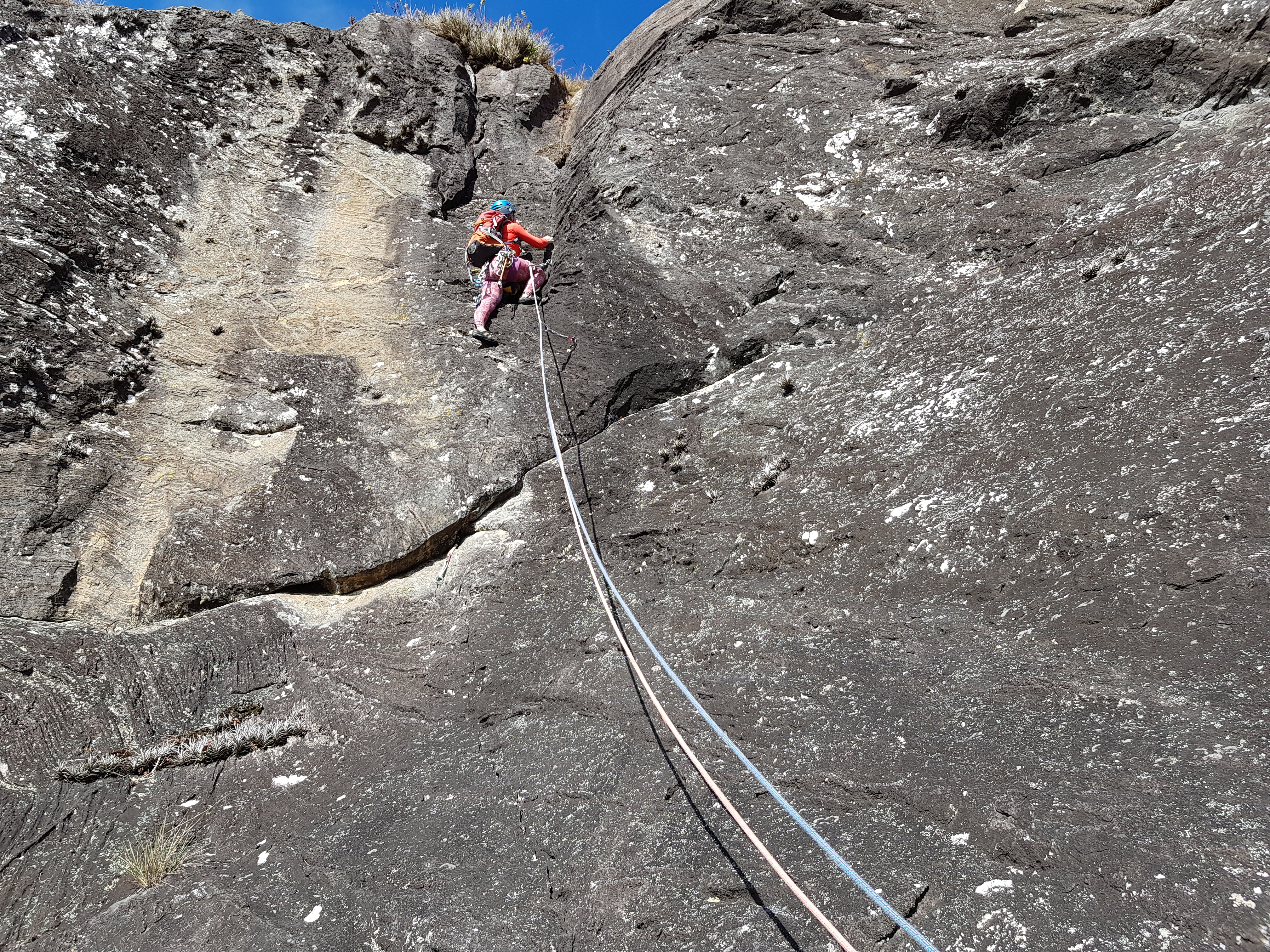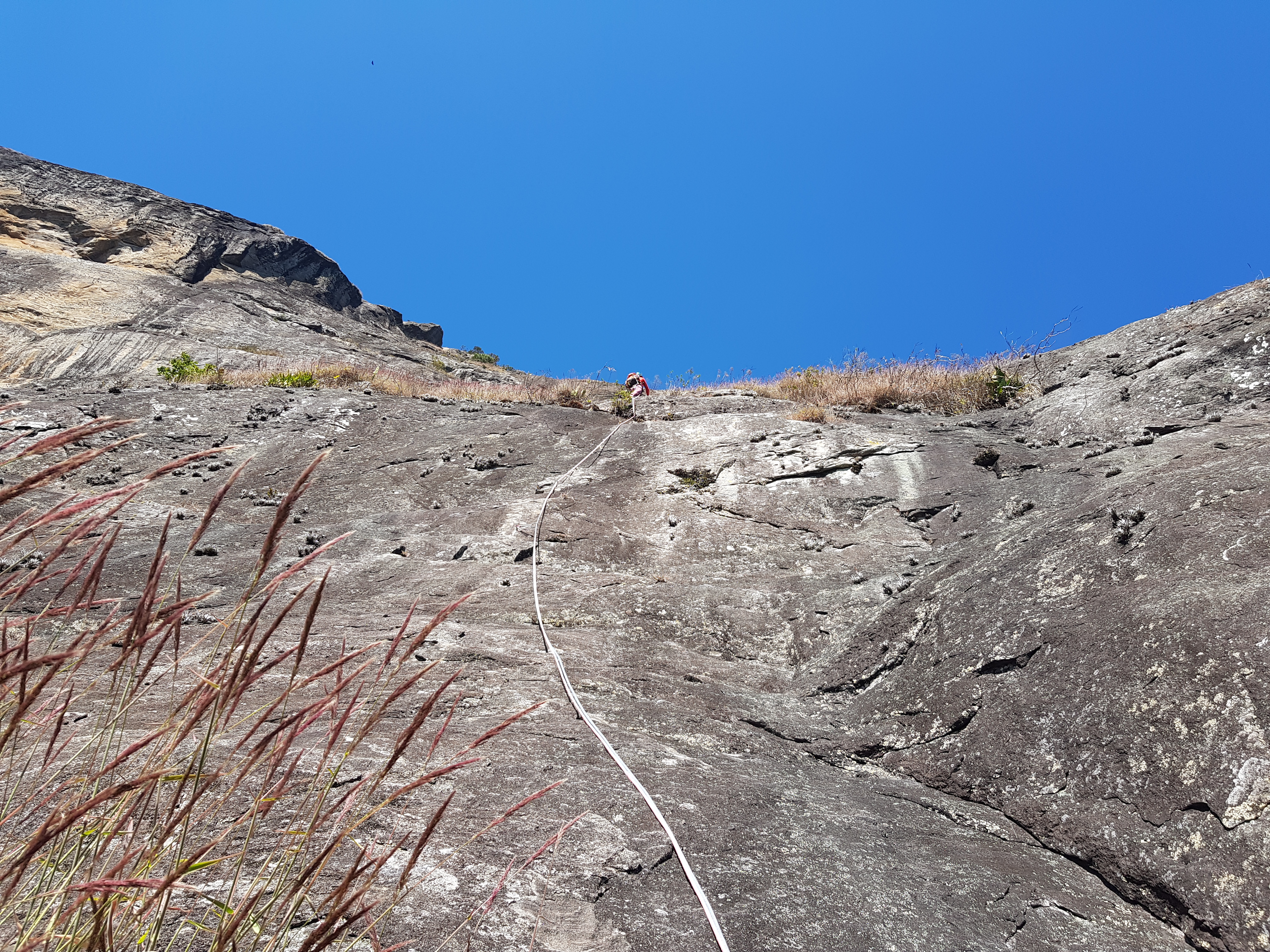 Pela demora que eles estavam, achei melhor guiar a enfiada do crux e deixar a Michelle esperando o trio para devolver a peça. Subi sem pressa, enfiada divertida com um 7a meio ardido com vários lances em móvel, uma das enfiadas mais divertidas da via. Chegando na parada ainda tivemos que esperar um pouco até eles chegarem na Michelle que aguardava na P4.