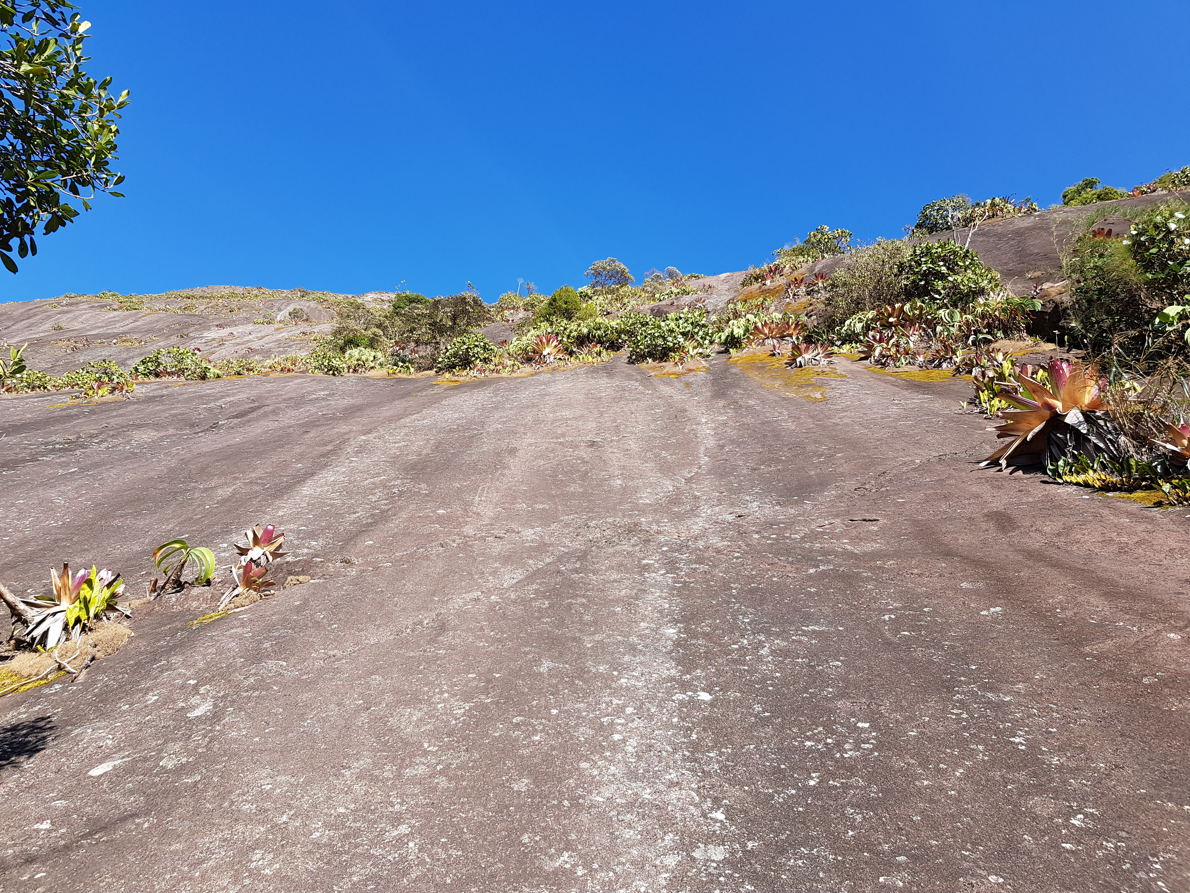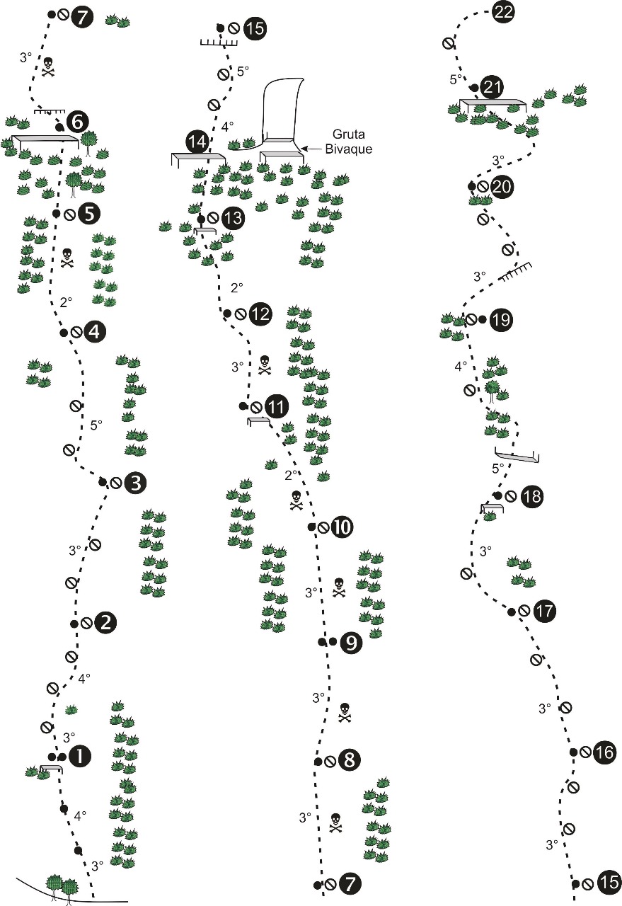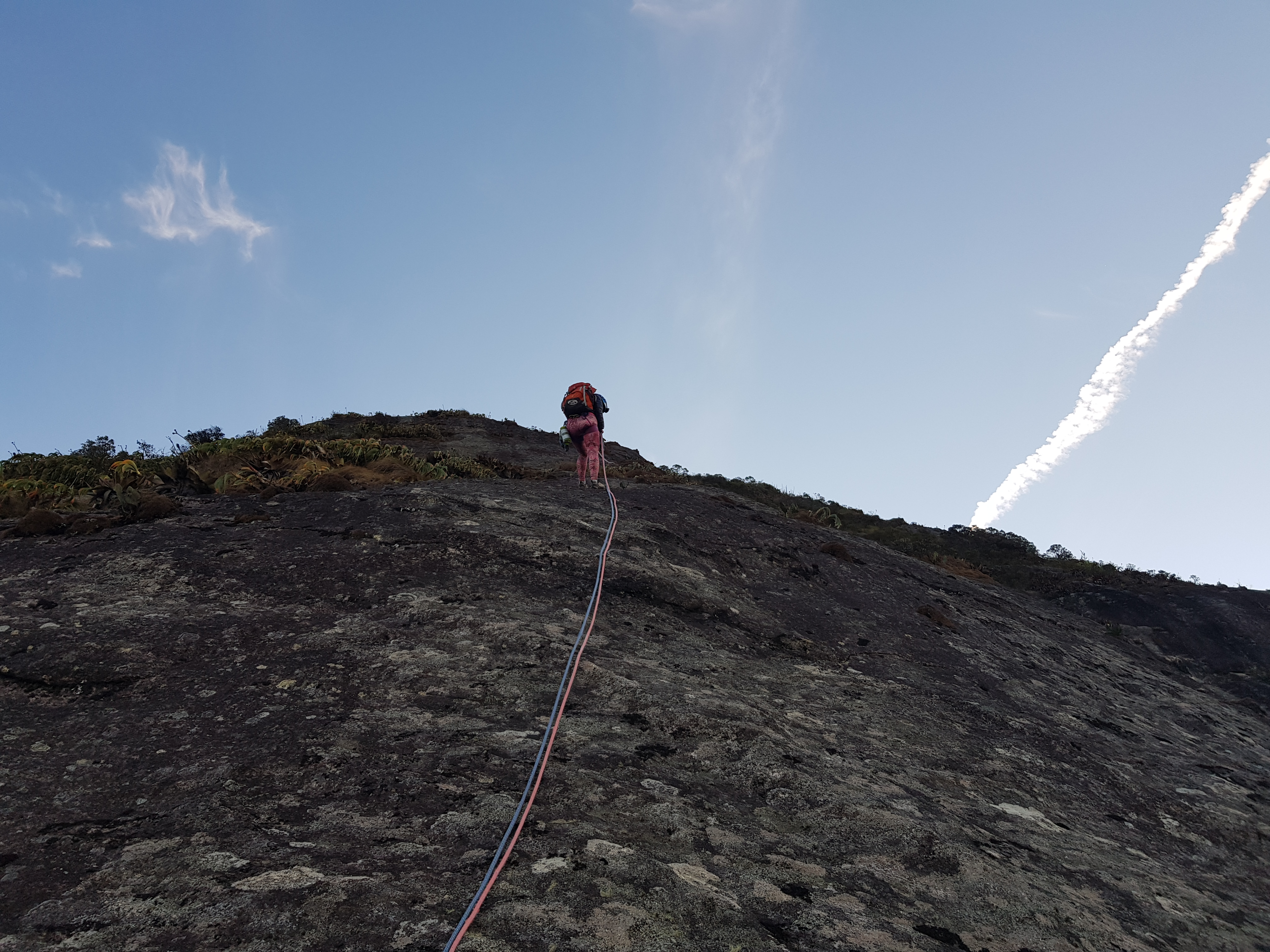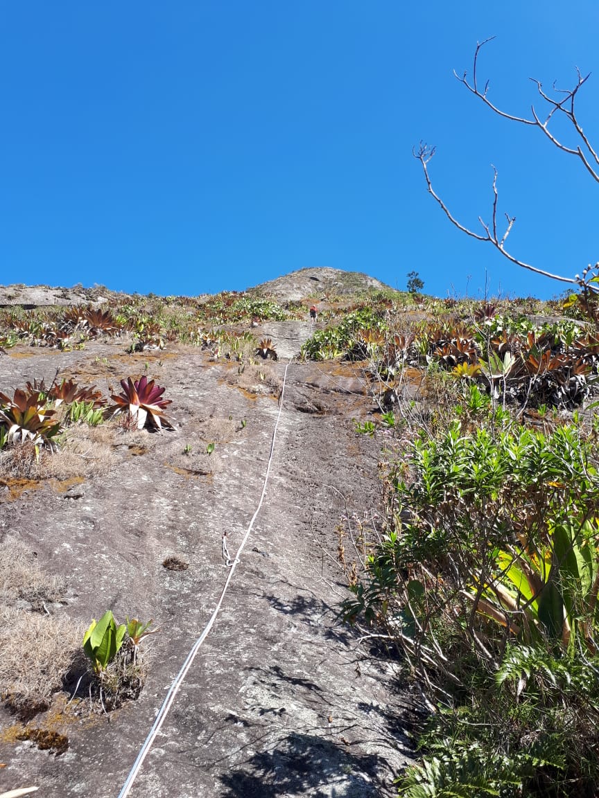 Subimos revezando a guiada até a P4 sem problema algum, fácil orientação com lances de pura aderência. A partir da P4 até a P14 escalamos em simultâneo, sempre de olho no croqui, não tivemos muitos problemas de orientação. Chegando na P14 entrei em algumas roubadas de mato, como nessa parada não tem grampo de equalização, levei um tempinho para ter a certeza onde ficava o início da 15° enfiada, só fui ter essa certeza quando vi a linha de grampos e identifiquei o tetinho que precisa vencer para chegar na P15.