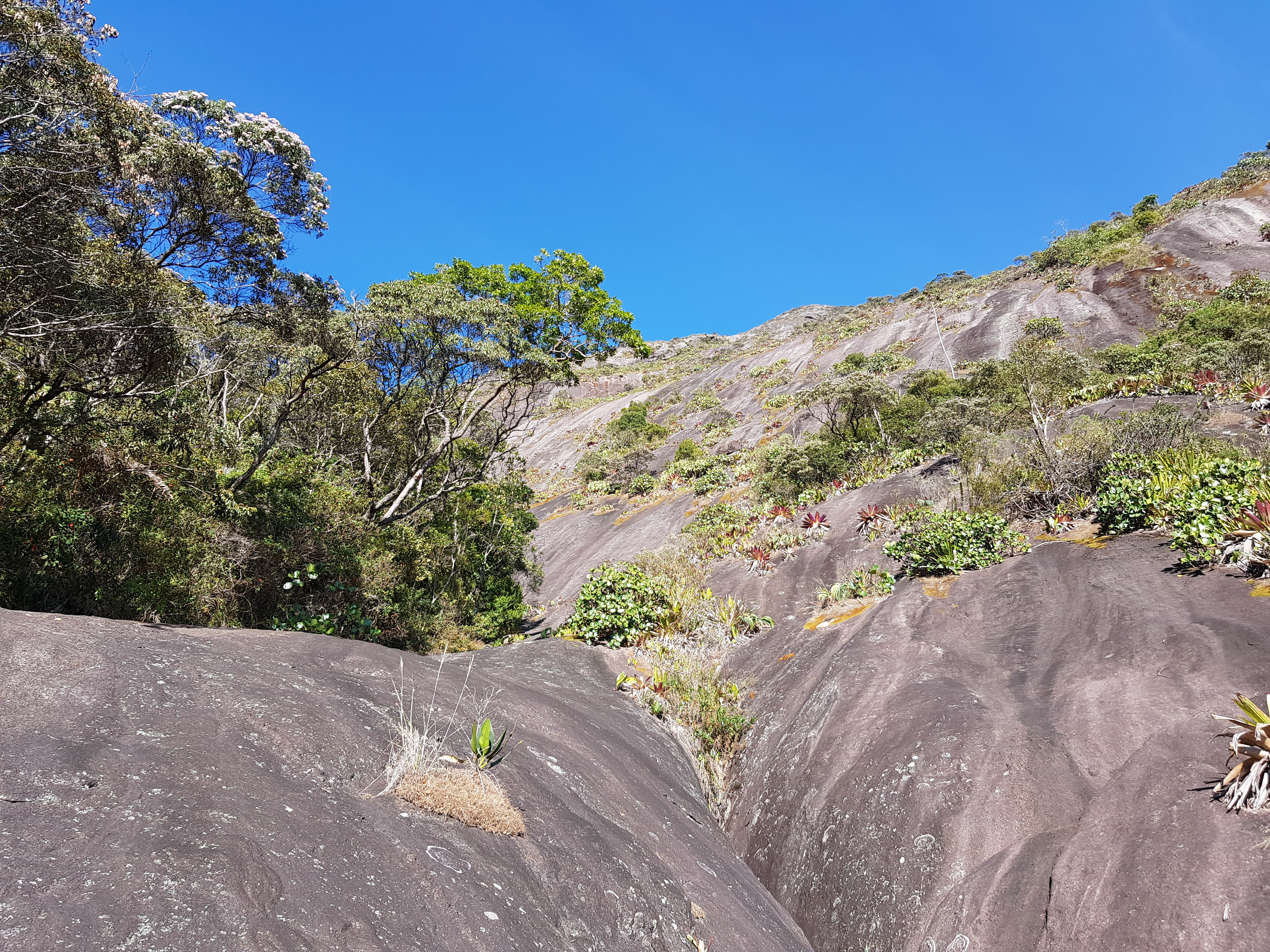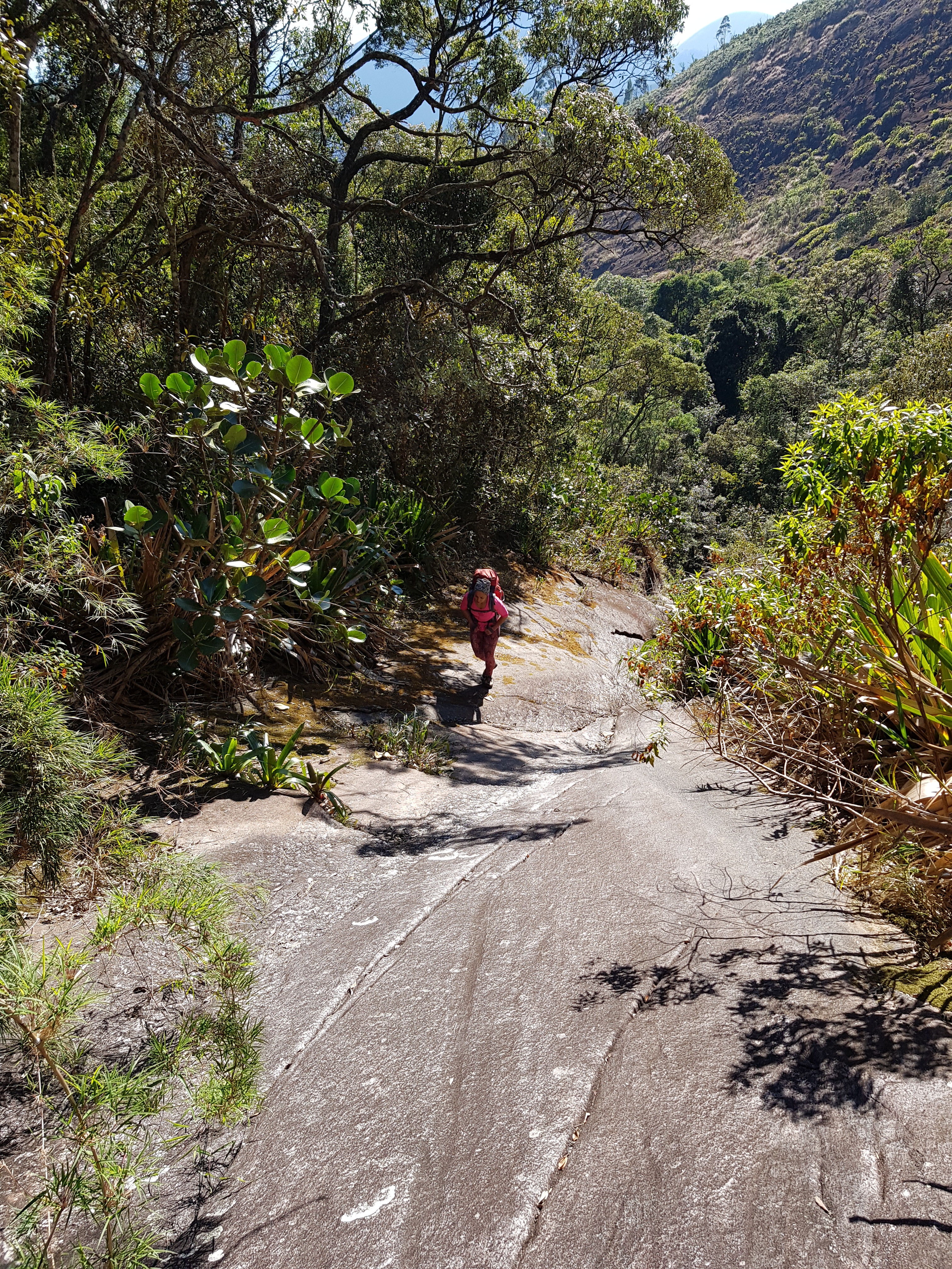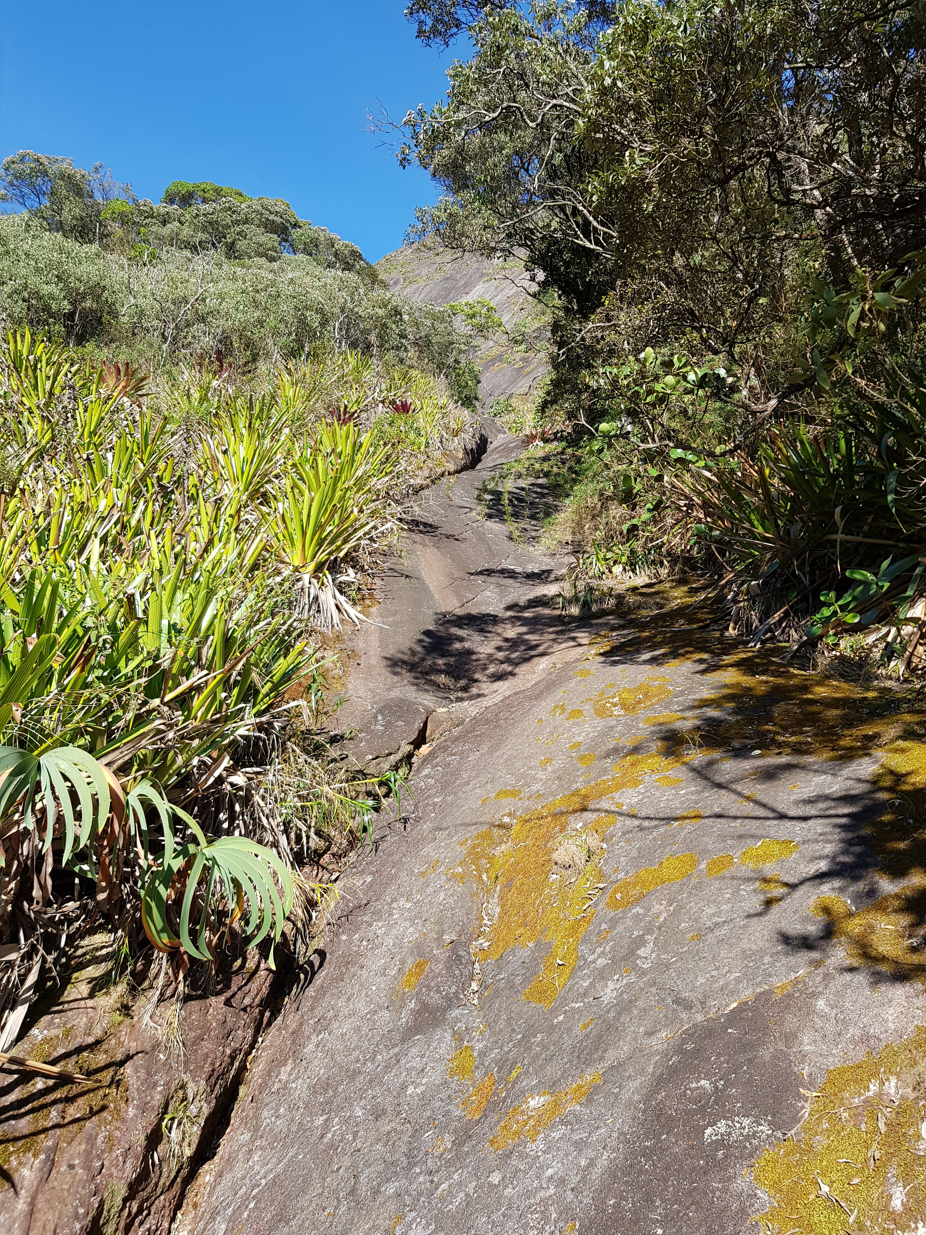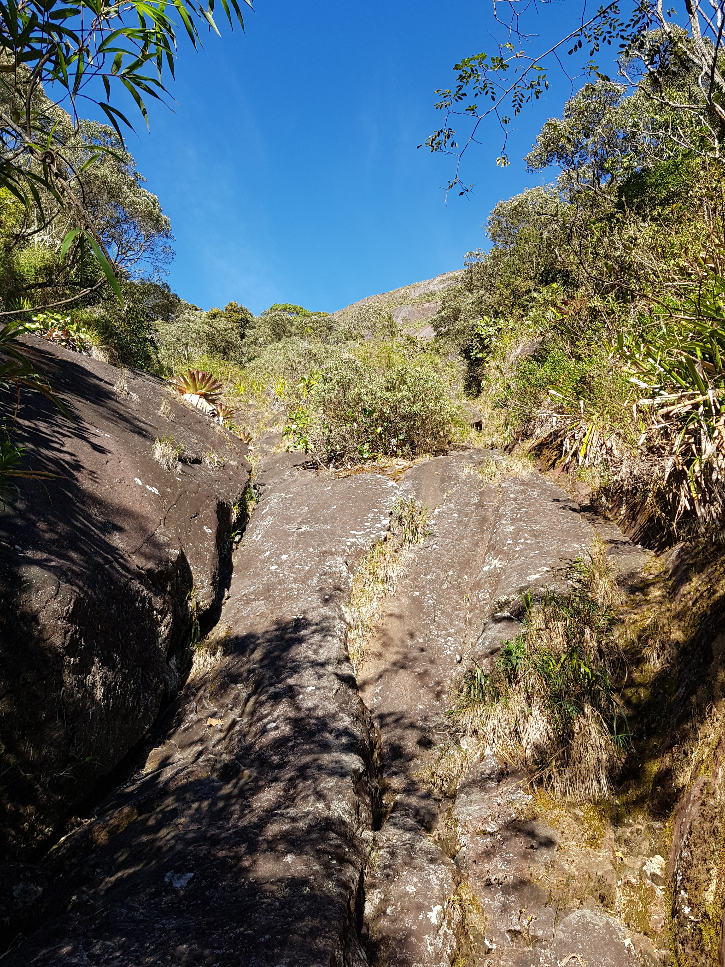 Subimos revezando a guiada até a P4 sem problema algum, fácil orientação com lances de pura aderência. A partir da P4 até a P14 escalamos em simultâneo, sempre de olho no croqui, não tivemos muitos problemas de orientação. Chegando na P14 entrei em algumas roubadas de mato, como nessa parada não tem grampo de equalização, levei um tempinho para ter a certeza onde ficava o início da 15° enfiada, só fui ter essa certeza quando vi a linha de grampos e identifiquei o tetinho que precisa vencer para chegar na P15.