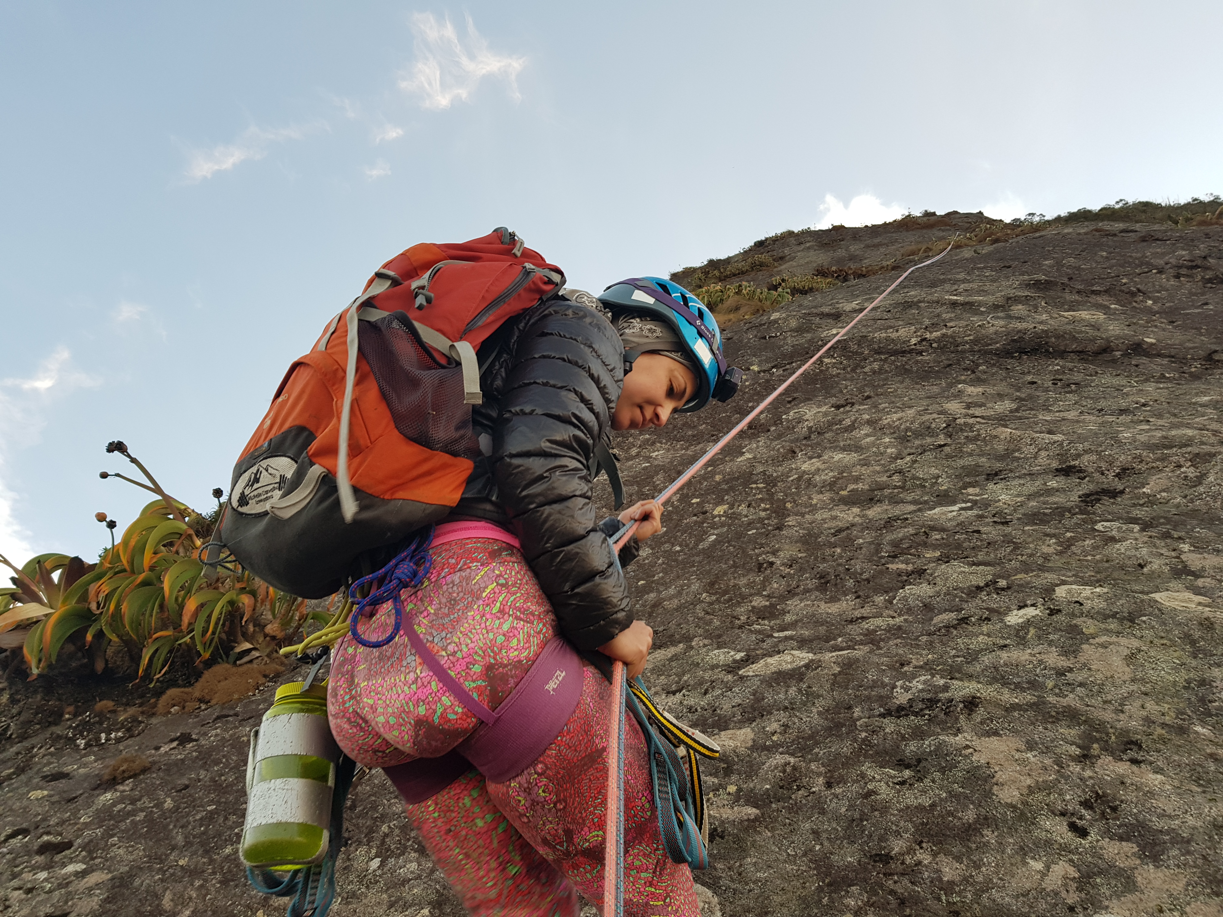 A escalada fluiu que foi uma maravilha, apenas tomei um susto na saída da P18, assim que eu tinha livrado o tetinho e já estava mais tranquilo, o meu pé vazou quando quebrou a agarra que eu estava apoiado, só vi a Michelle desviando da pedra que foi em sua direção.