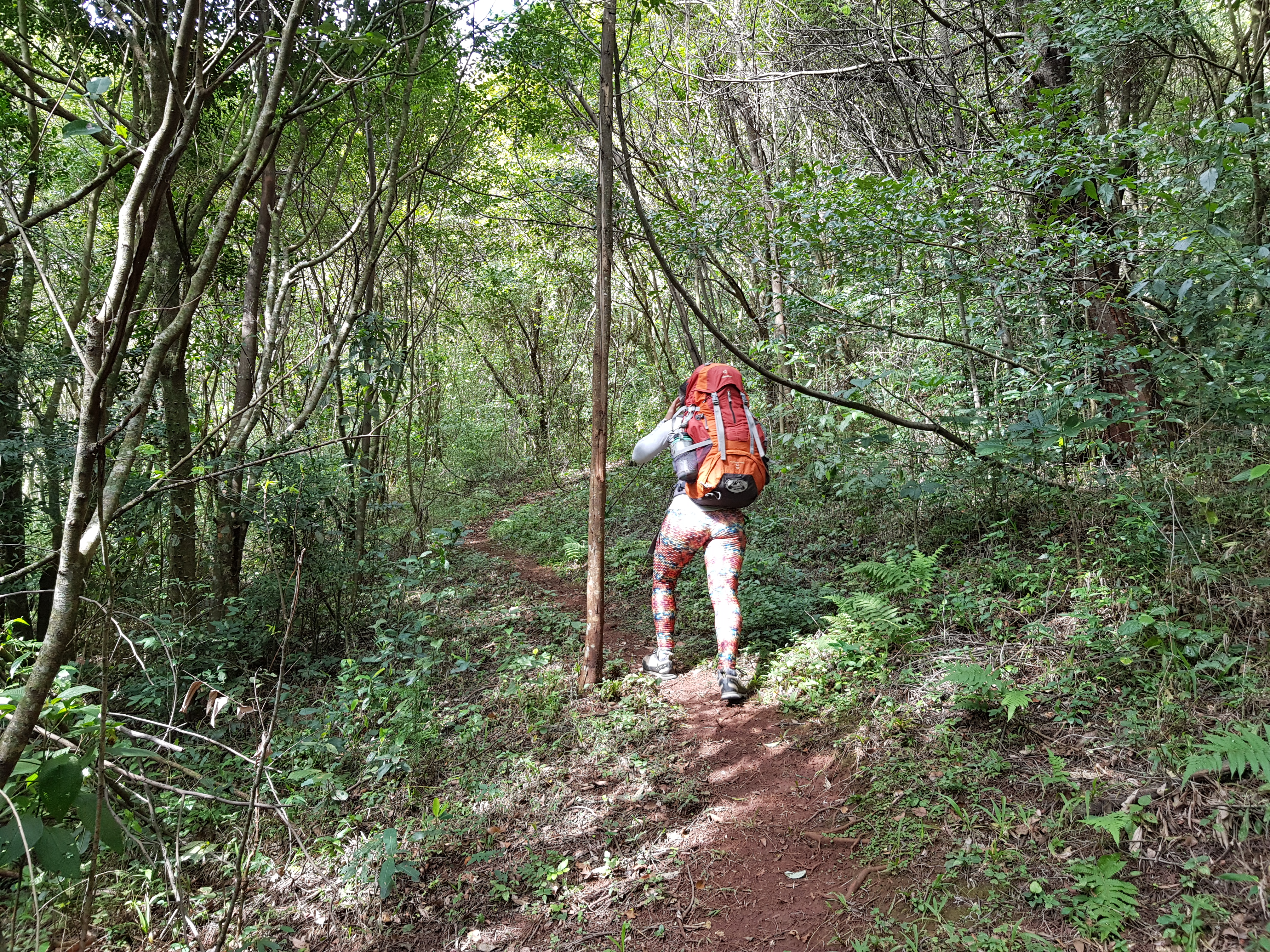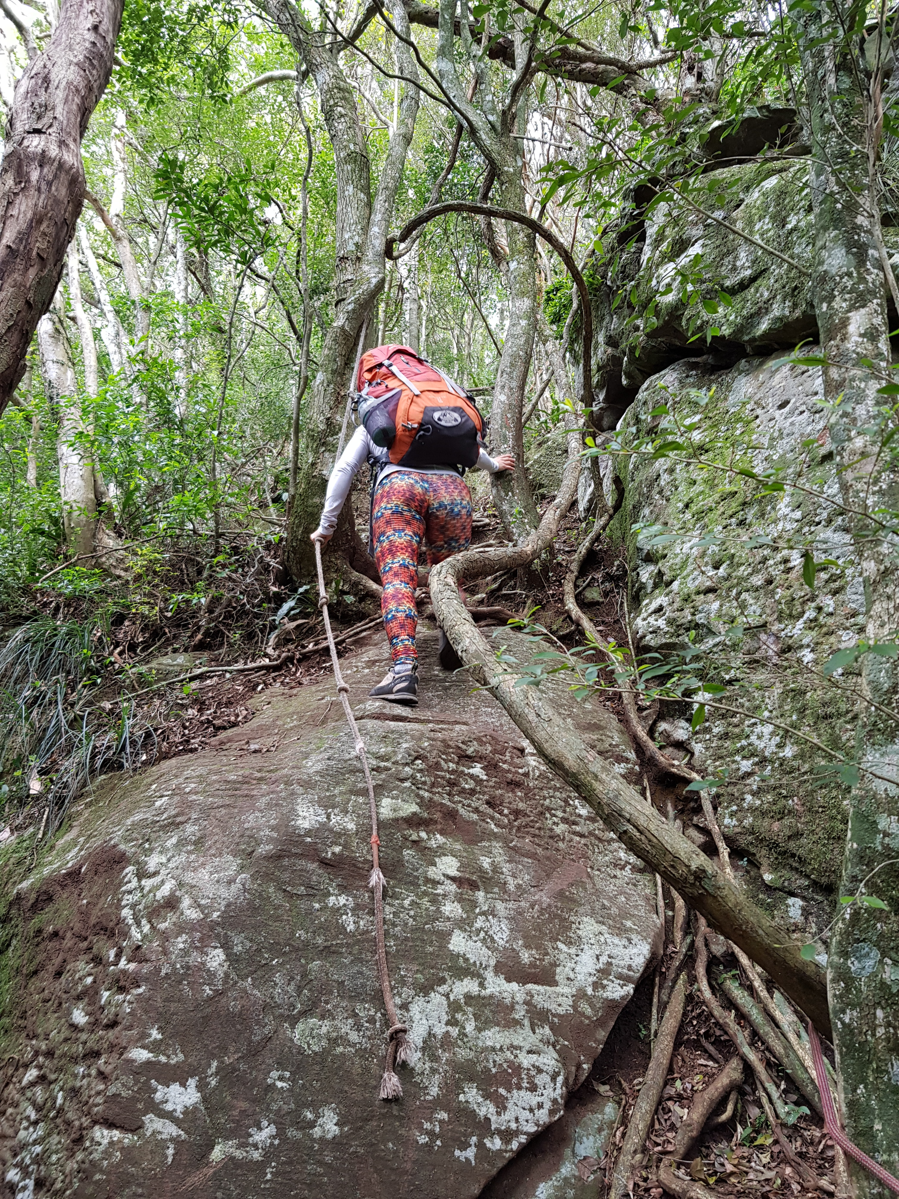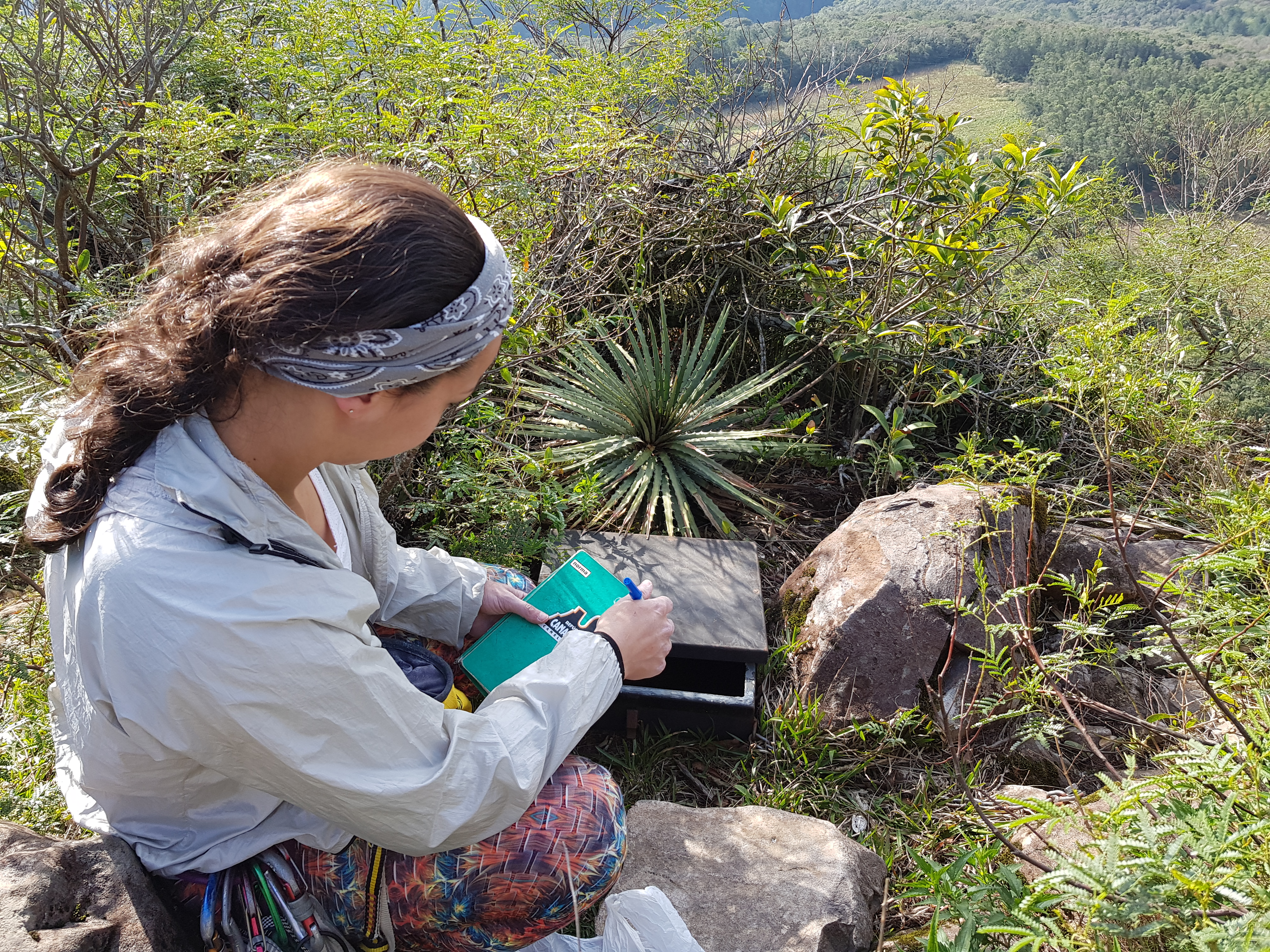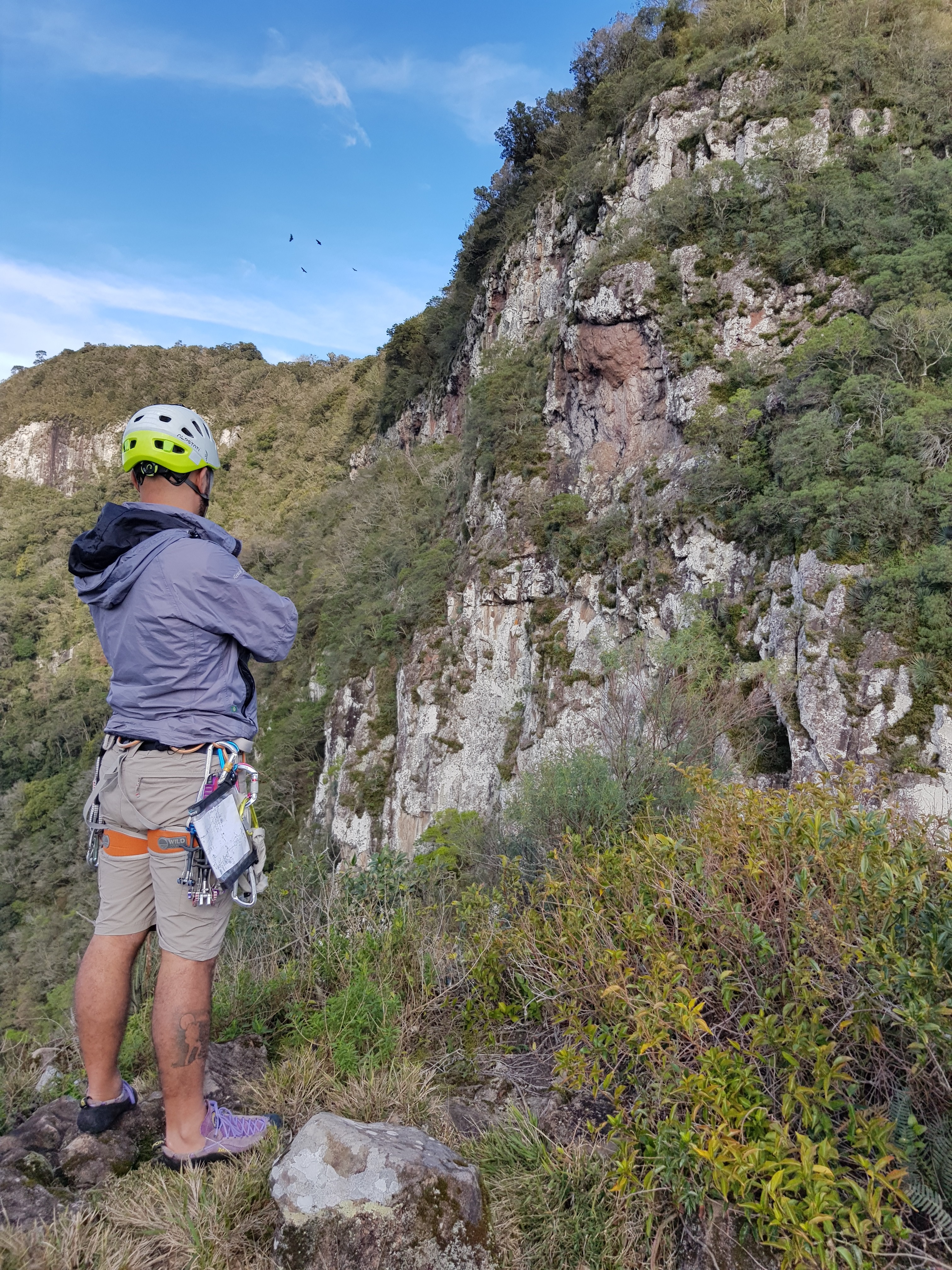 Rapelamos e achamos a via Bugio Solando que fica um pouco à direita da parede assim que vc sai da trilha. Novamente a Michelle puxa a primeira enfiada e agora a escalada é fiel ao croqui que carregava.
