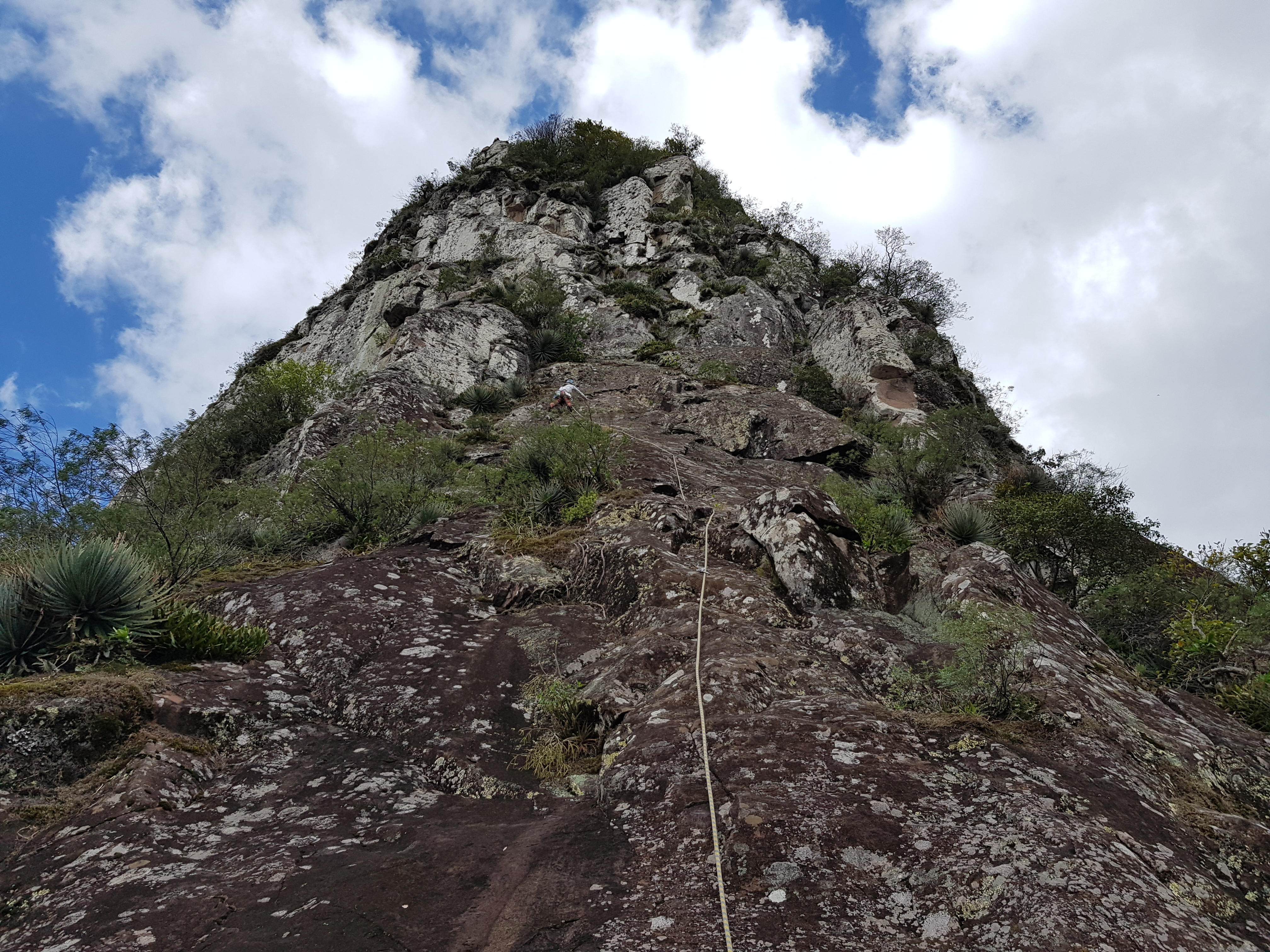 A segunda enfiada é a mais divertida e também do crux, um lance um pouco aéreo e meio cabreiro até conseguir encontrar um grampo escondido antes do crux, depois uma boa esticada até um platô onde se encontra a P2. A terceira enfiada começa em uma pequena fenda, da para melhorar a proteção com algumas peças pequenas ( .4 e .75), depois fica bem tranquilo até a próxima parada. Para finalizar a escalada a última enfiada só precisa passar por alguns blocos de pedra tendendo a esquerda e rapidamente a escalada acaba no cume.