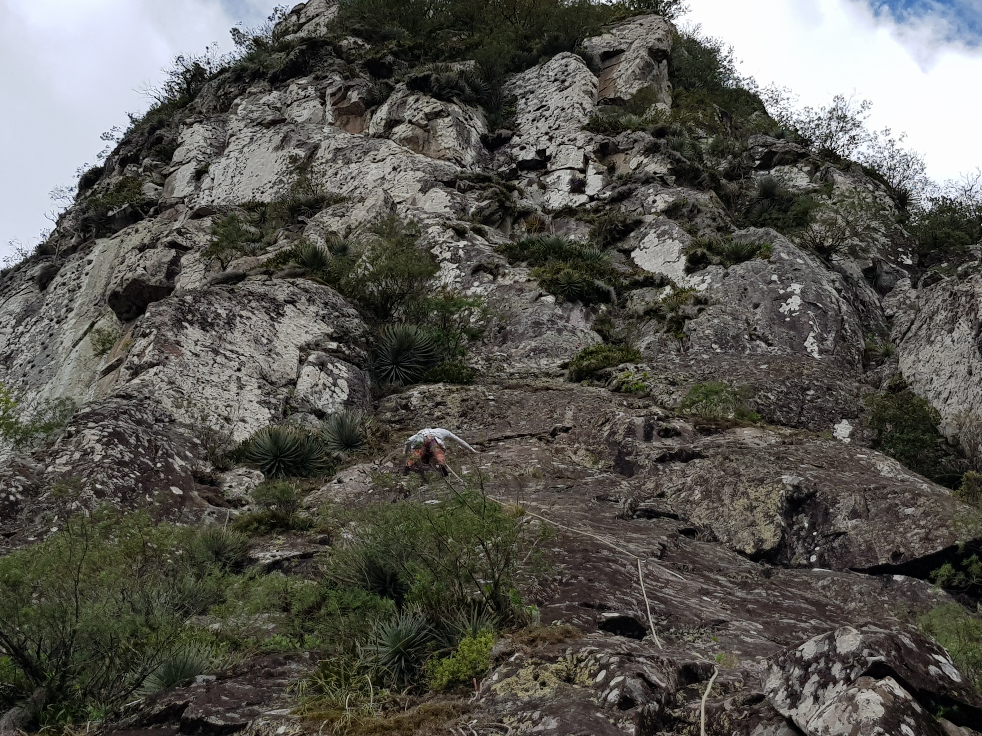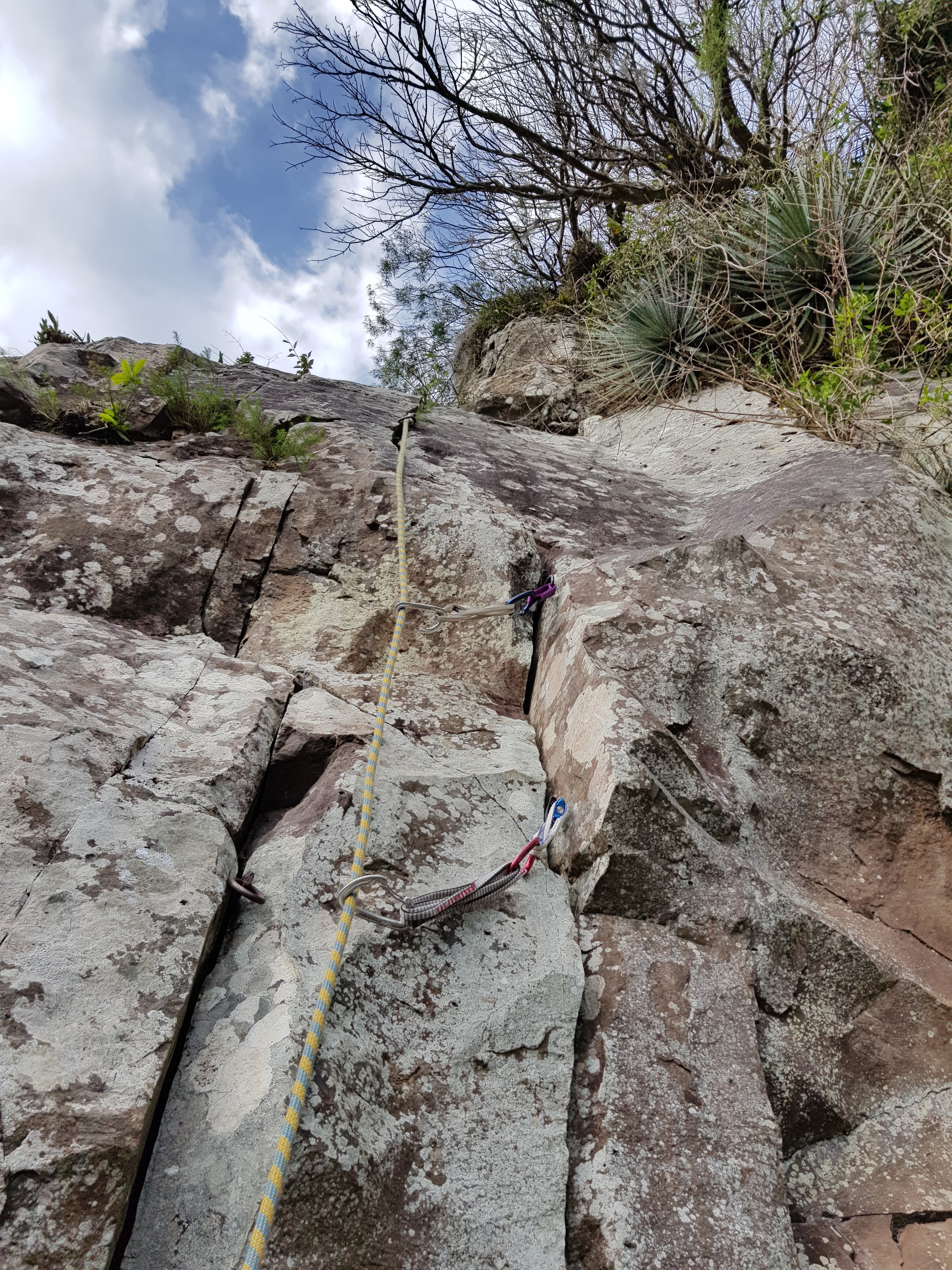 Logo que começamos a escalada estranhei a Michelle passando perrengue já na primeira enfiada que deveria ser fácil, quando subi até a primeira parada onde ela me dava segurança constatei que realmente aquela não era a via que procurávamos, não sei em qual via estávamos, mas parecia bem divertida, pena que eu não tinha o croqui de todas as escaladas desse lugar para poder dar continuidade naquela linha.