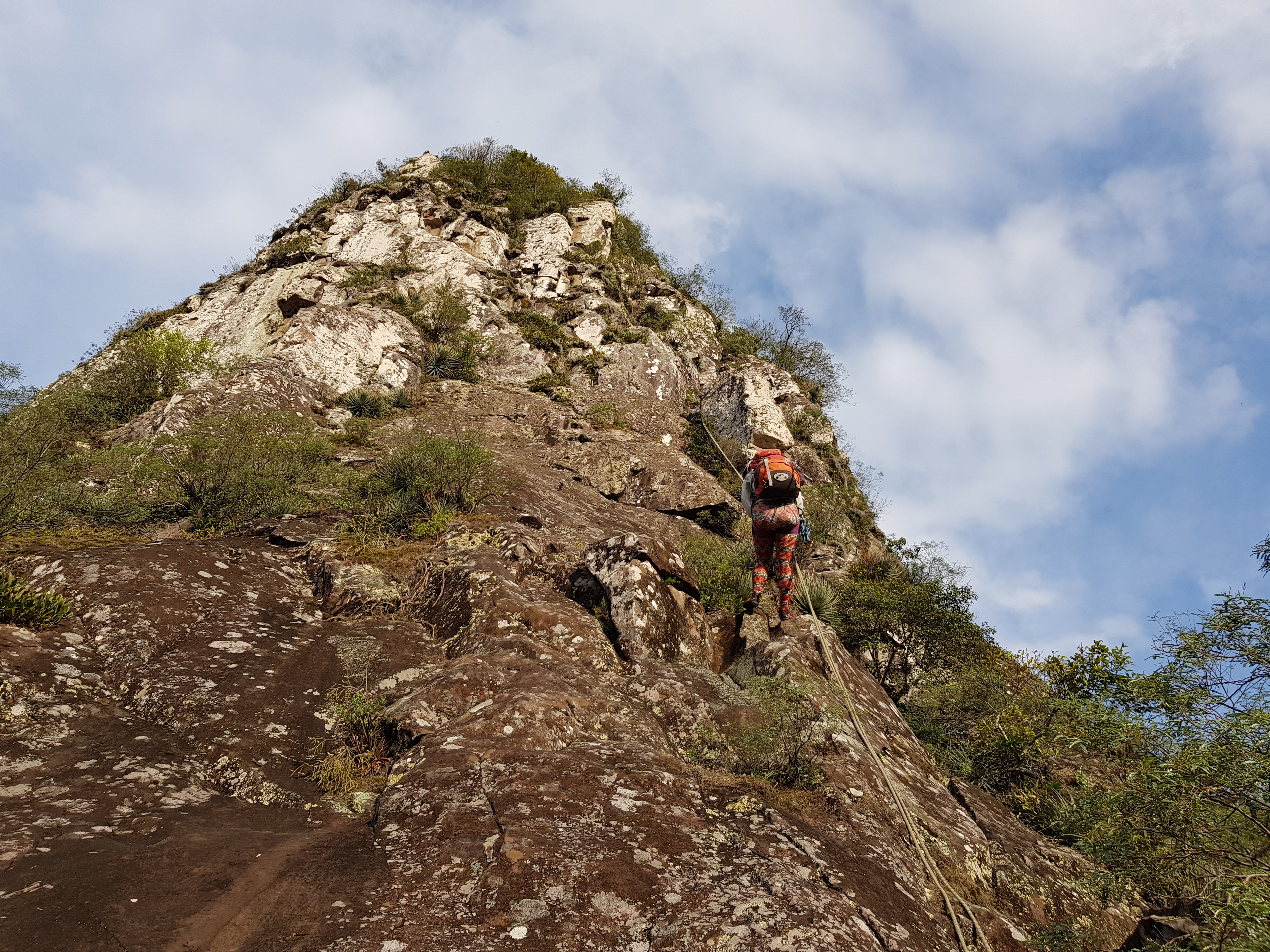 Escolhemos uma das vias mais clássicas do lugar, Bugio Solando 5°VI E2 D1 120m, escalada com 4 enfiadas curtas até o cume.