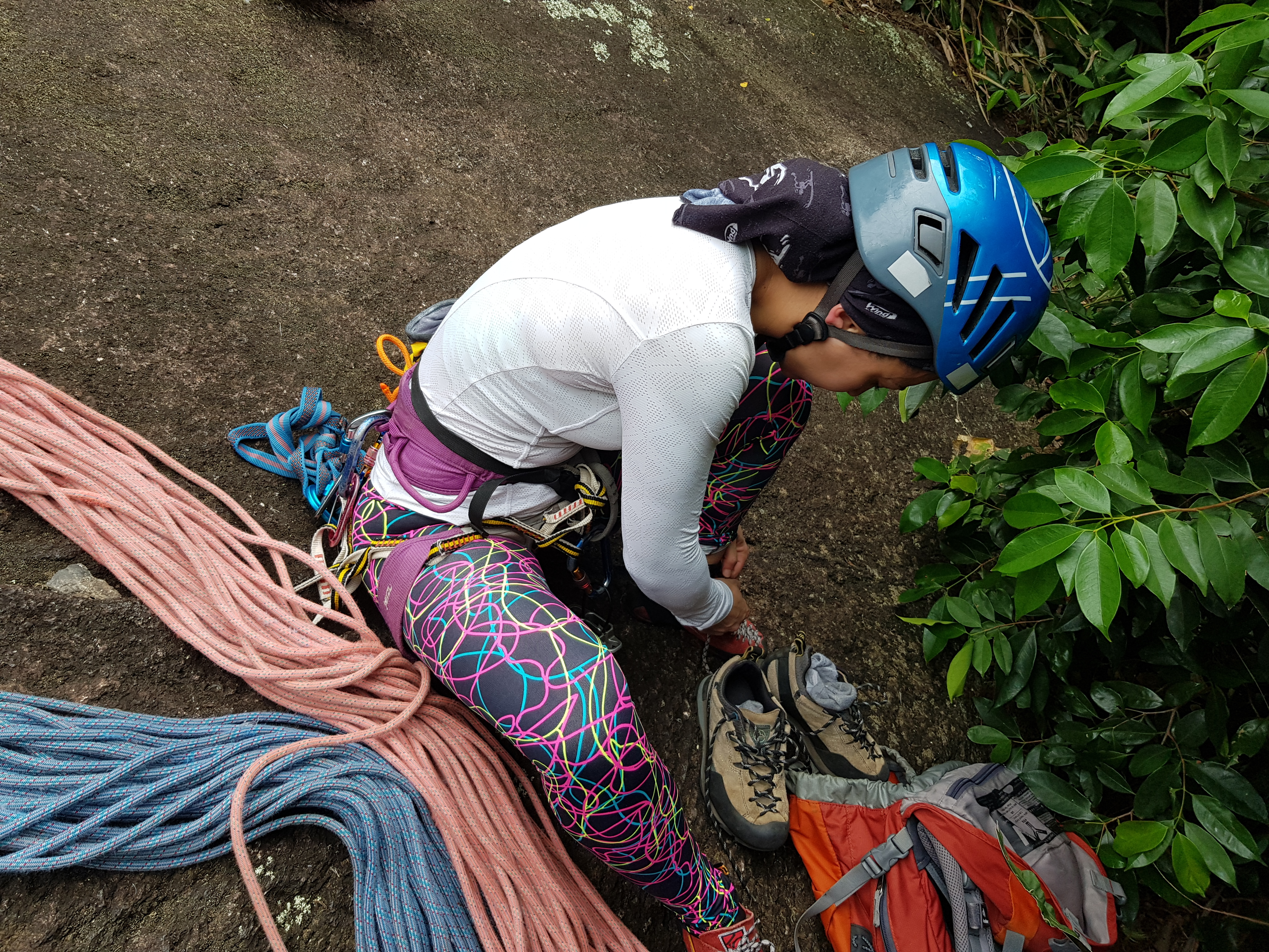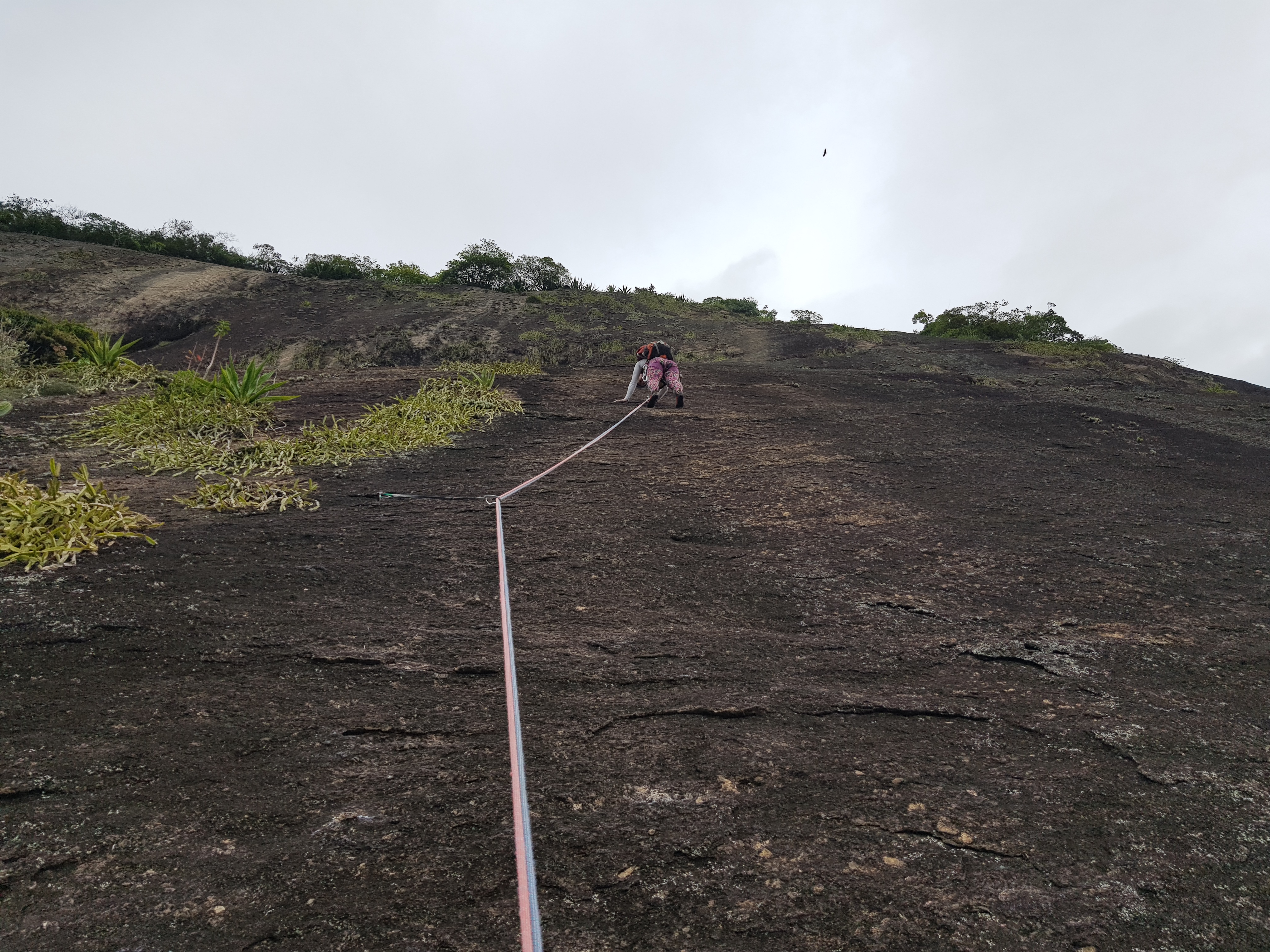 Ficar um tempo sem escalar no Rio, precisa se adaptar novamente com a aderência que da pedra, 3° grau de Carioca não é difícil mas também não é de graça. A via segue sem problemas na orientação, sempre dava para identificar a linha da próxima enfiada. No final da última enfiada surgiu uma certa dúvida para onde seguia a via, mas logo que ganhei um pouco mais de altura já consegui identificar o grampo escondido atrás de um matinho.