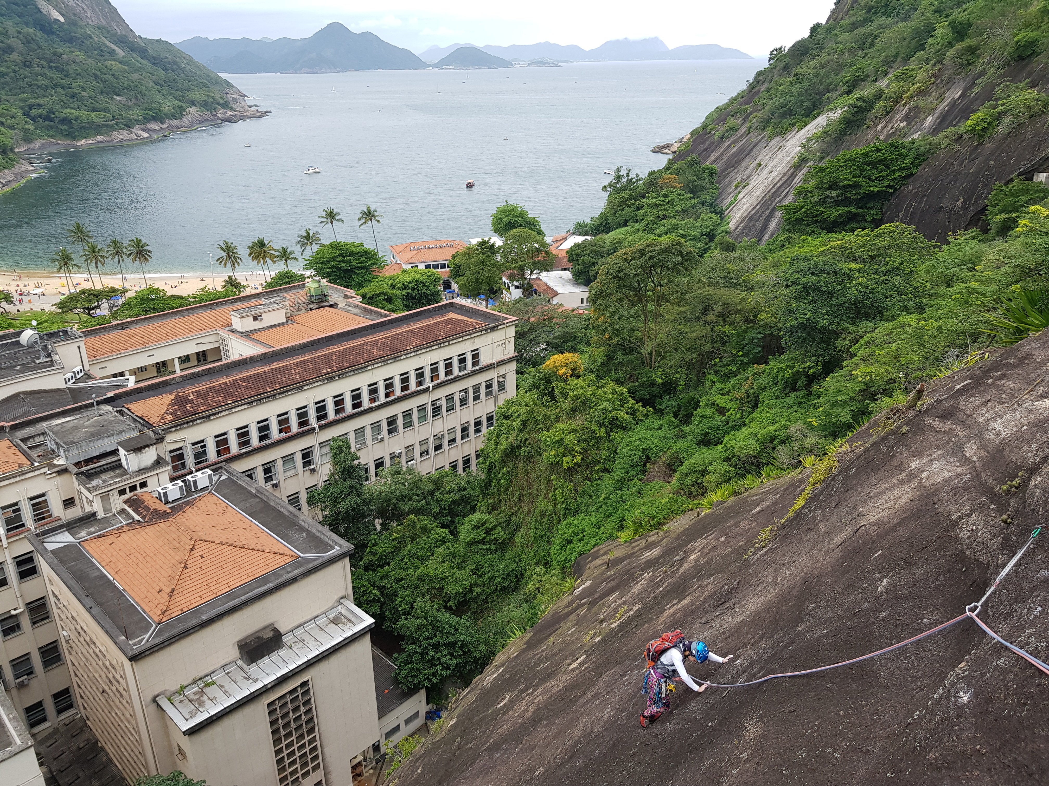 A via Entropia é a primeira escalada bem a esquerda do setor. Começa em uma enfiada toda na horizontal para esquerda, escalada praticamente toda em aderência com suas proteções um pouco distante uma da outra. O visual do Morro da Babilônia é muito legal, cidade, praia, Pão de Açúcar na frente, pra quem não é do Rio sempre fica impressionado com o visual.