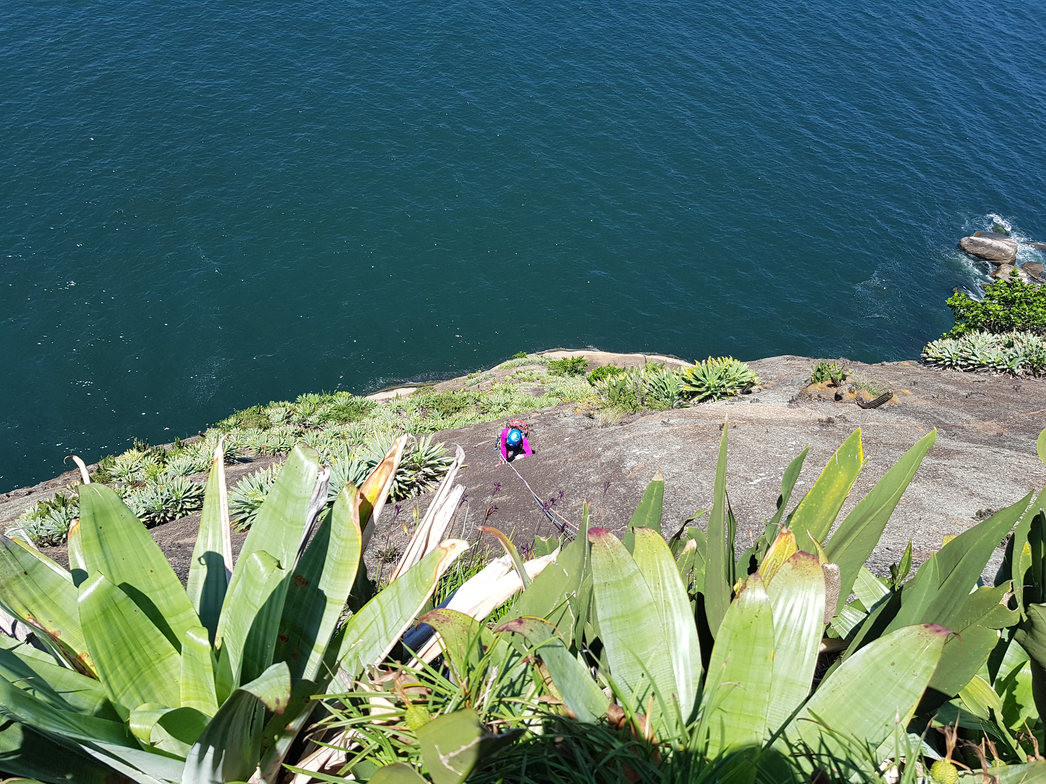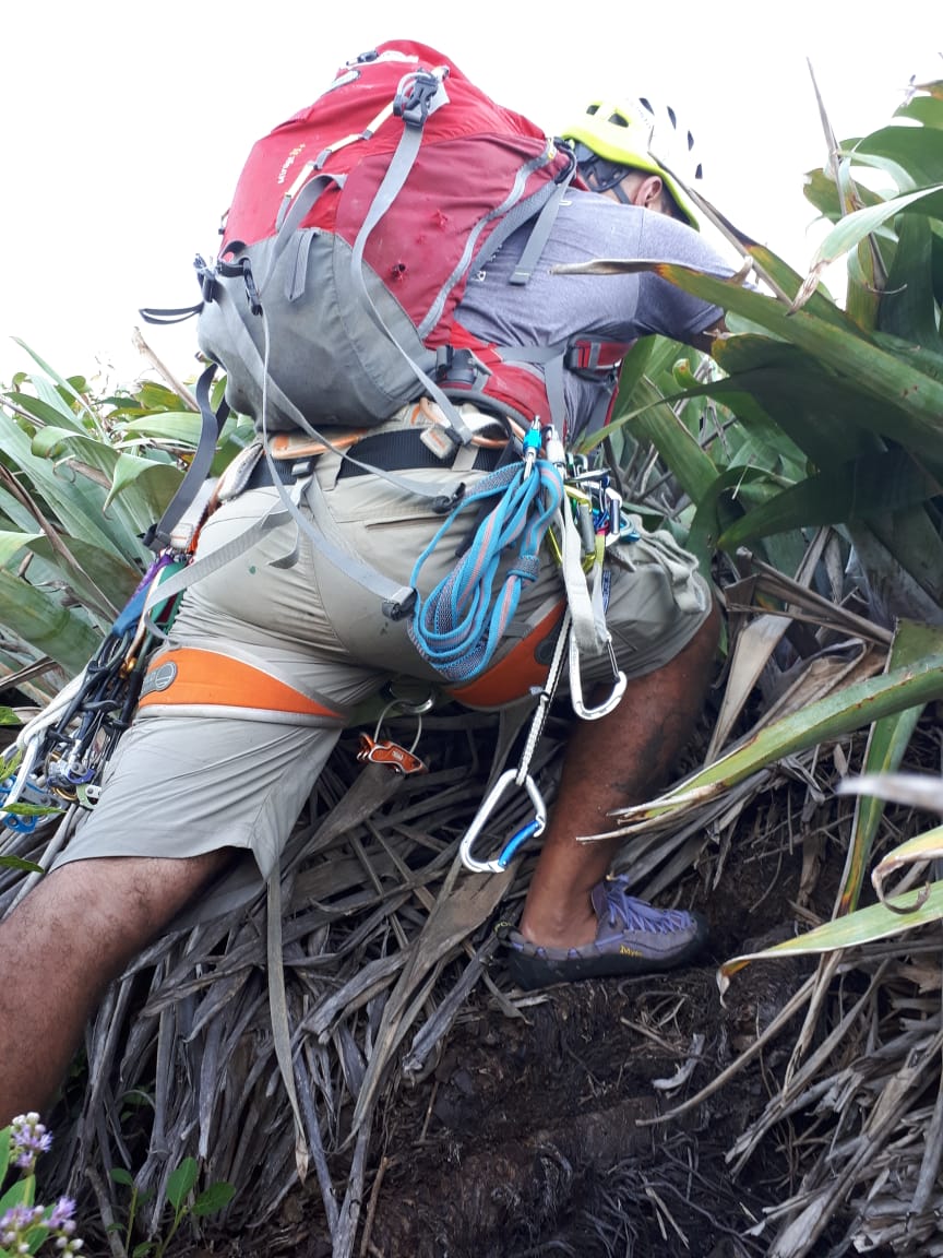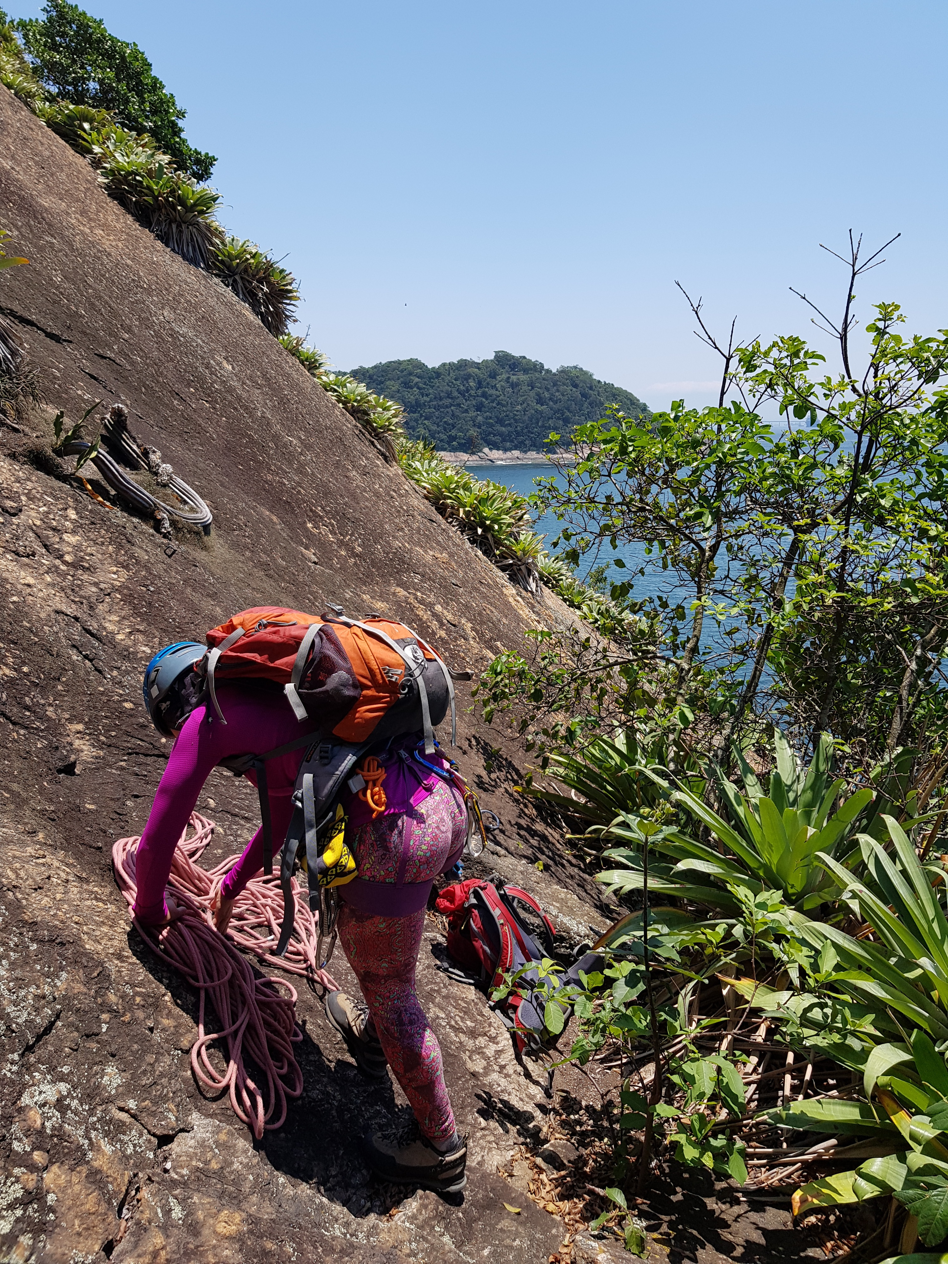 Eu já tinha escalado algumas vias na face leste e, na teoria não seria difícil localizar a base da via Iemanjá. Realmente era uma teoria, pois eu e a Michelle nos batemos bastante até acertar a linha correta. A sugestão que posso dar é: depois que passar por baixo das vias Heineken e Bohemia Gelada, não desça muito o vale que segue em direção ao mar, logo que você começar a descer e se afastar um pouco da parede já fique ligado em uma entrada a esquerda, é pouco visível essa entrada que segue em curva de nível até sair da floresta e chegar nos gravatás, tem um pequeno platô com um grampo na rocha, esse é o inicio da via.