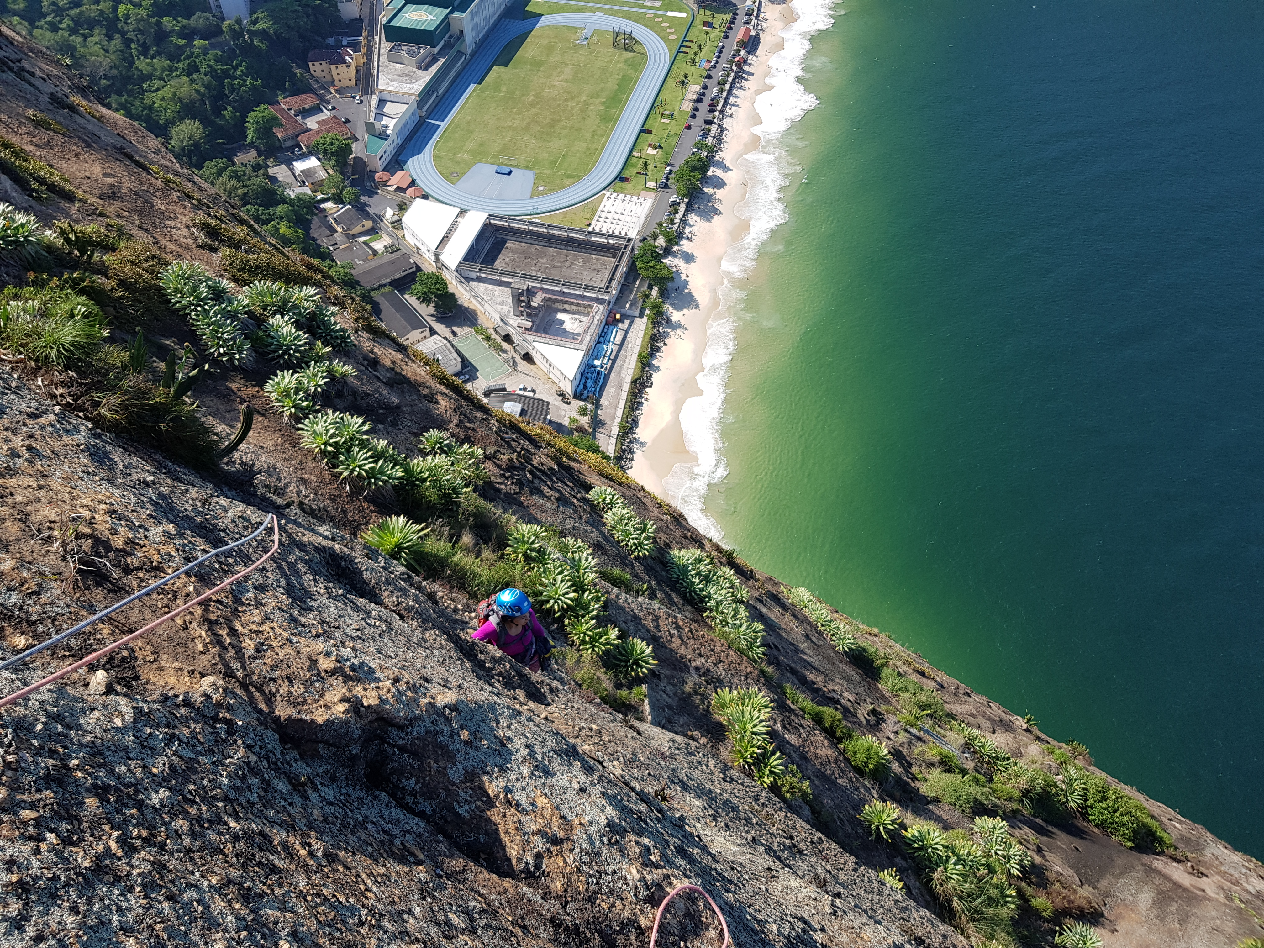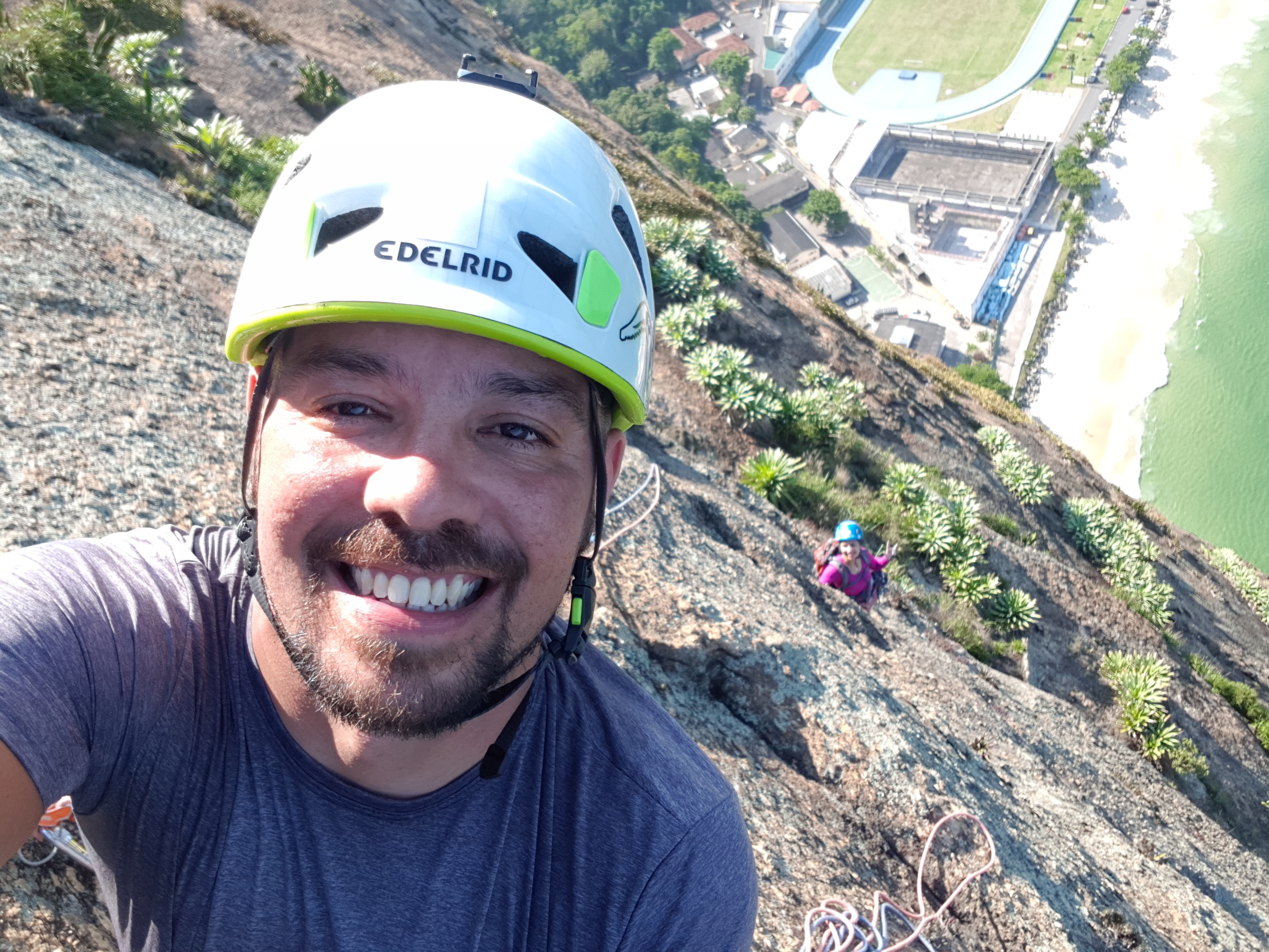 A saída da via até o cume do Pão de Açúcar deve ter uns 200 metros com uma caminhada meio chata entre os gravatás e alguns espinhos, mas com certeza foi um belo dia de escalda.