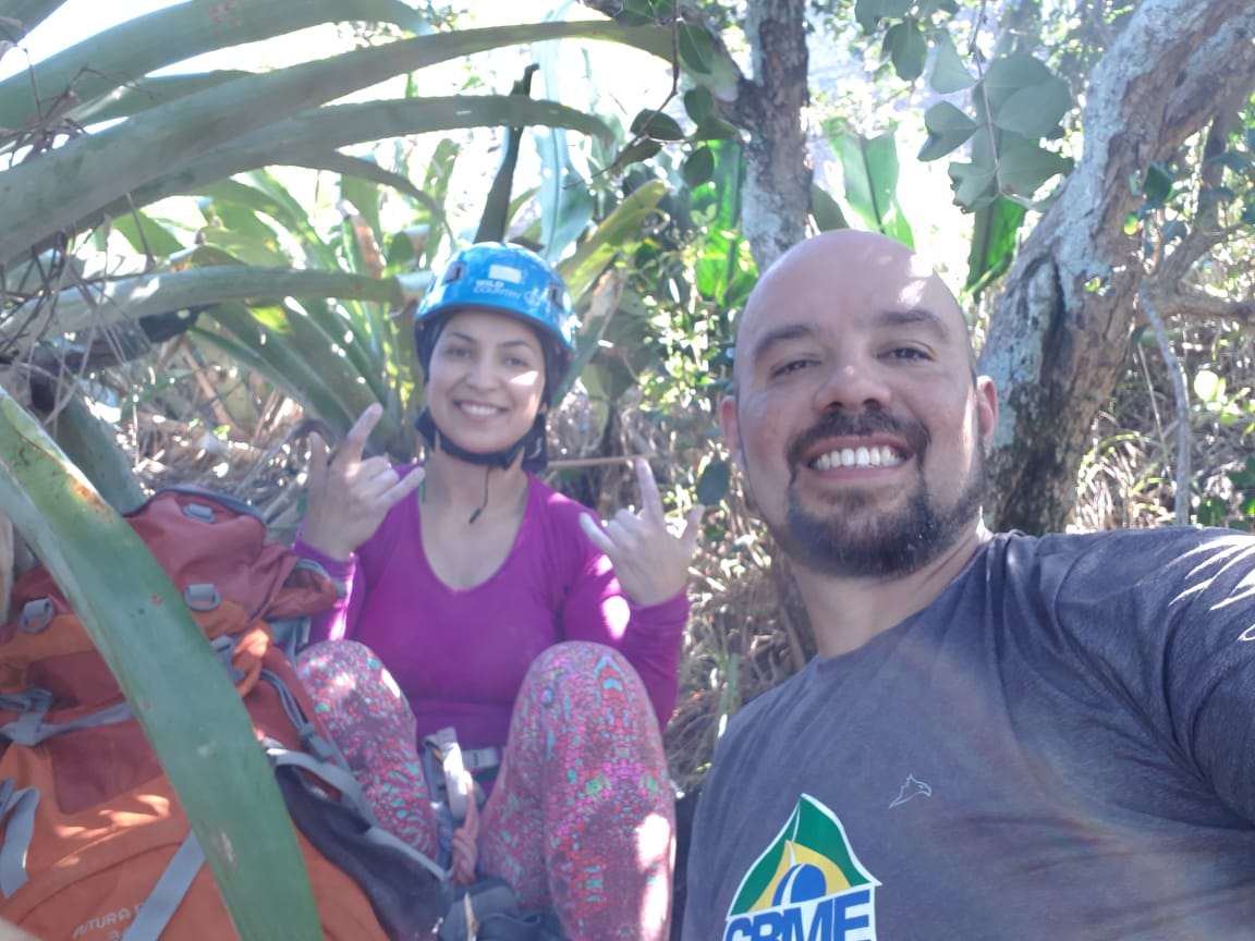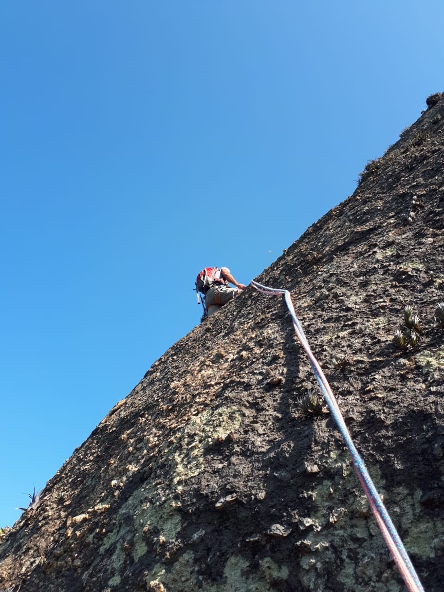 A orientação da via não é simples, os gravatás escondem os grampos e complicam a direção que você deve seguir. Com uma errada aqui ou ali, fomos progredindo na escalada com aquele sol torrando nossos capacetes.