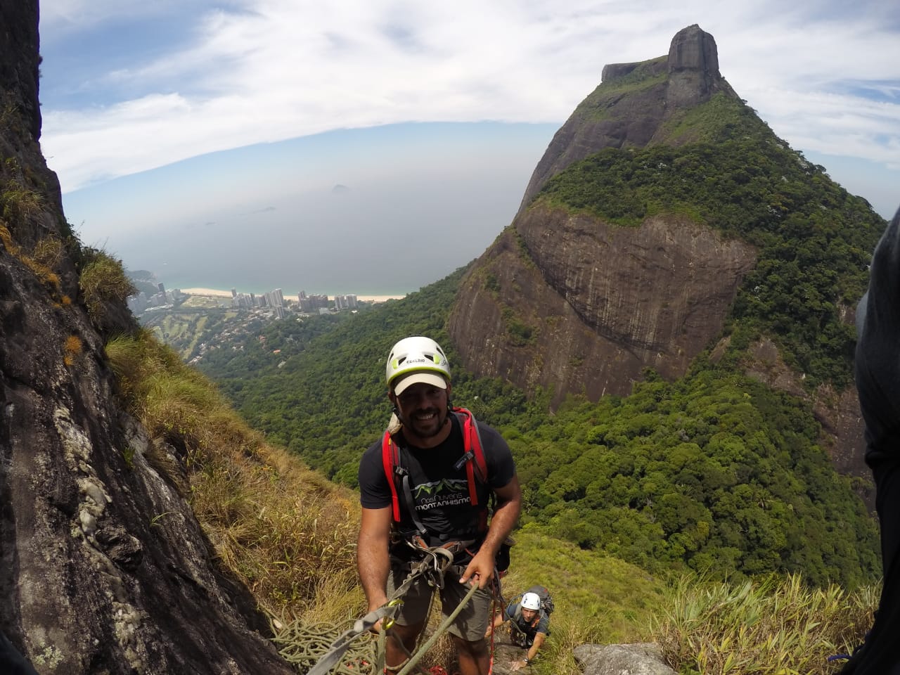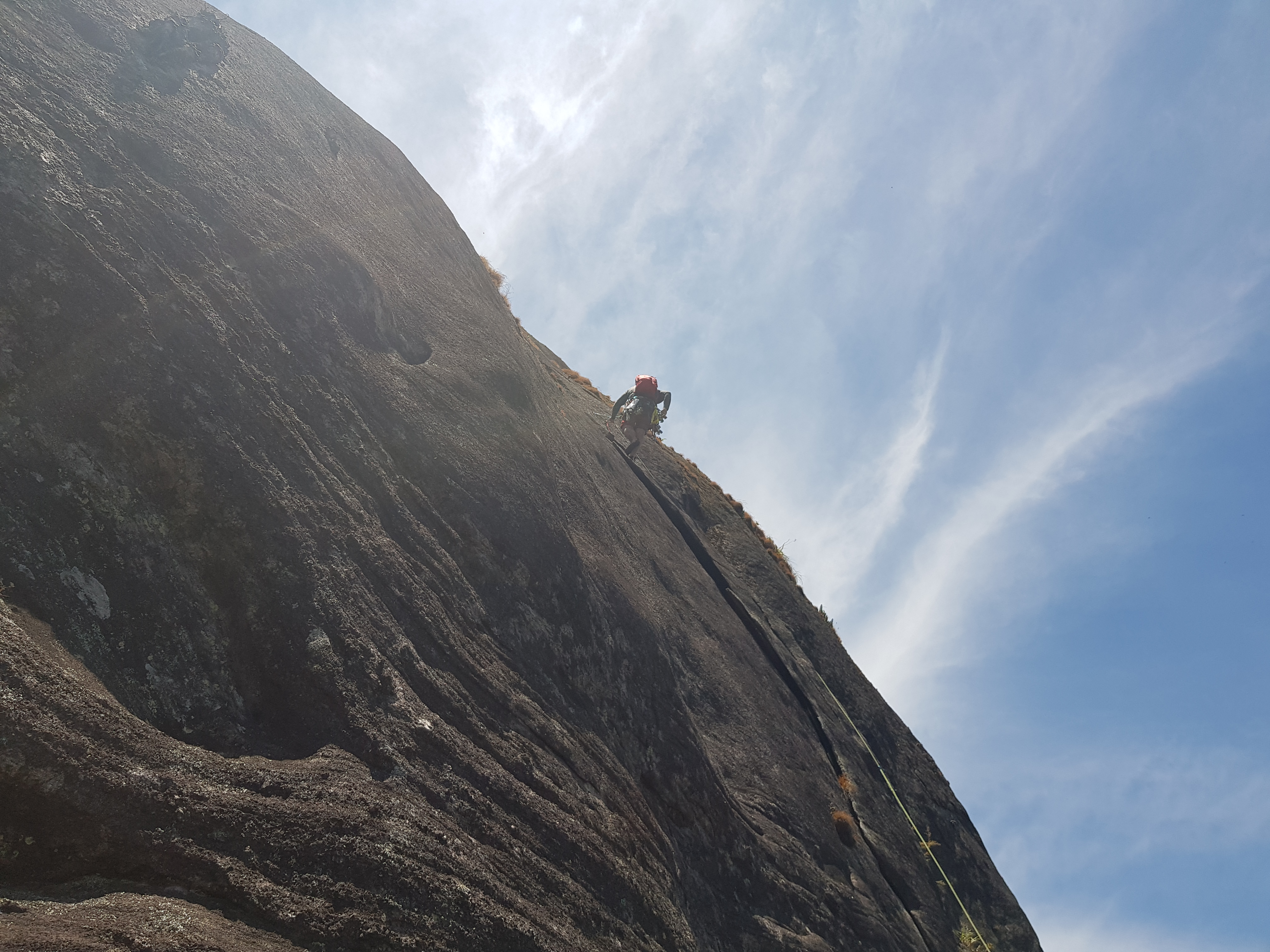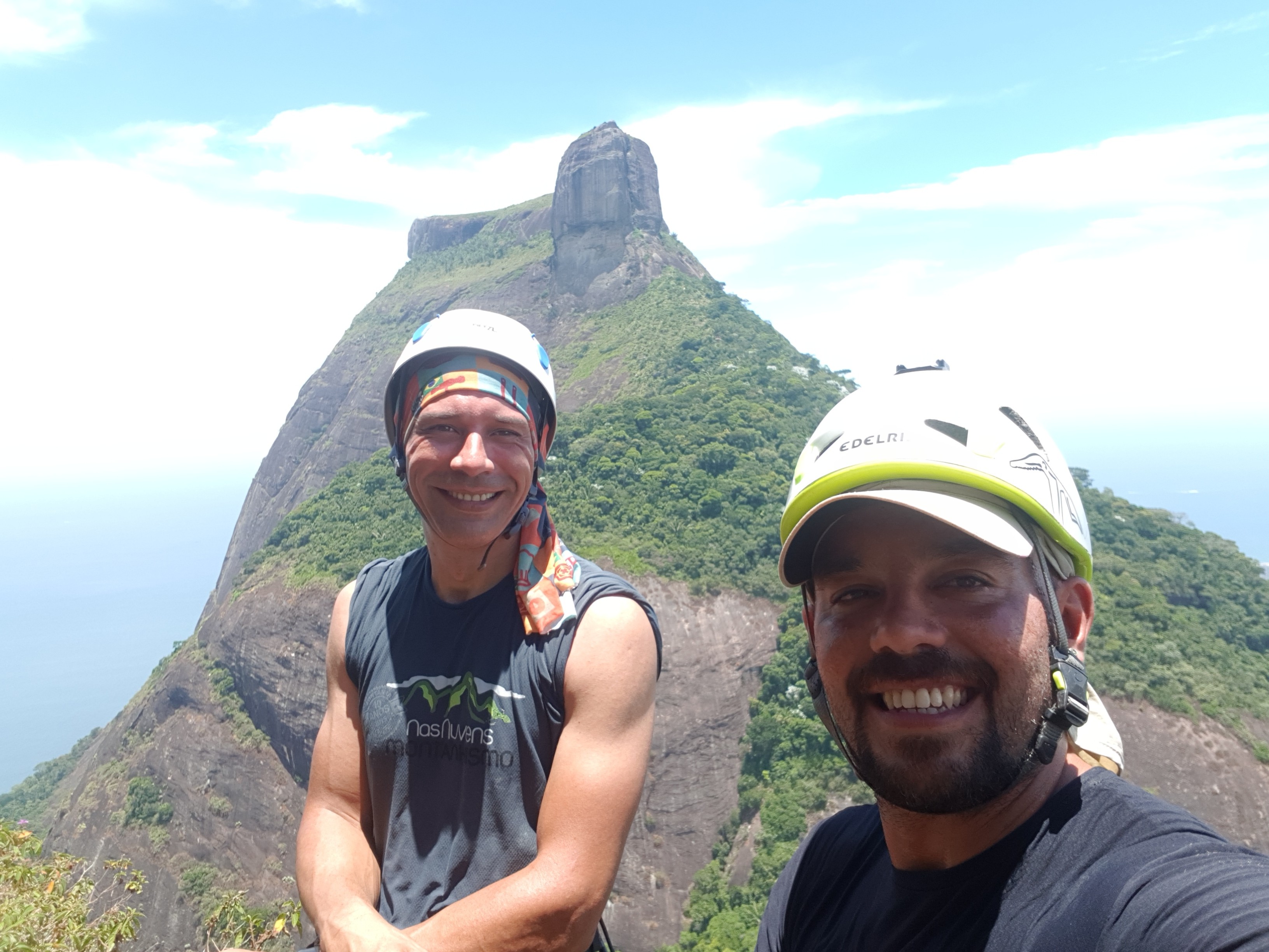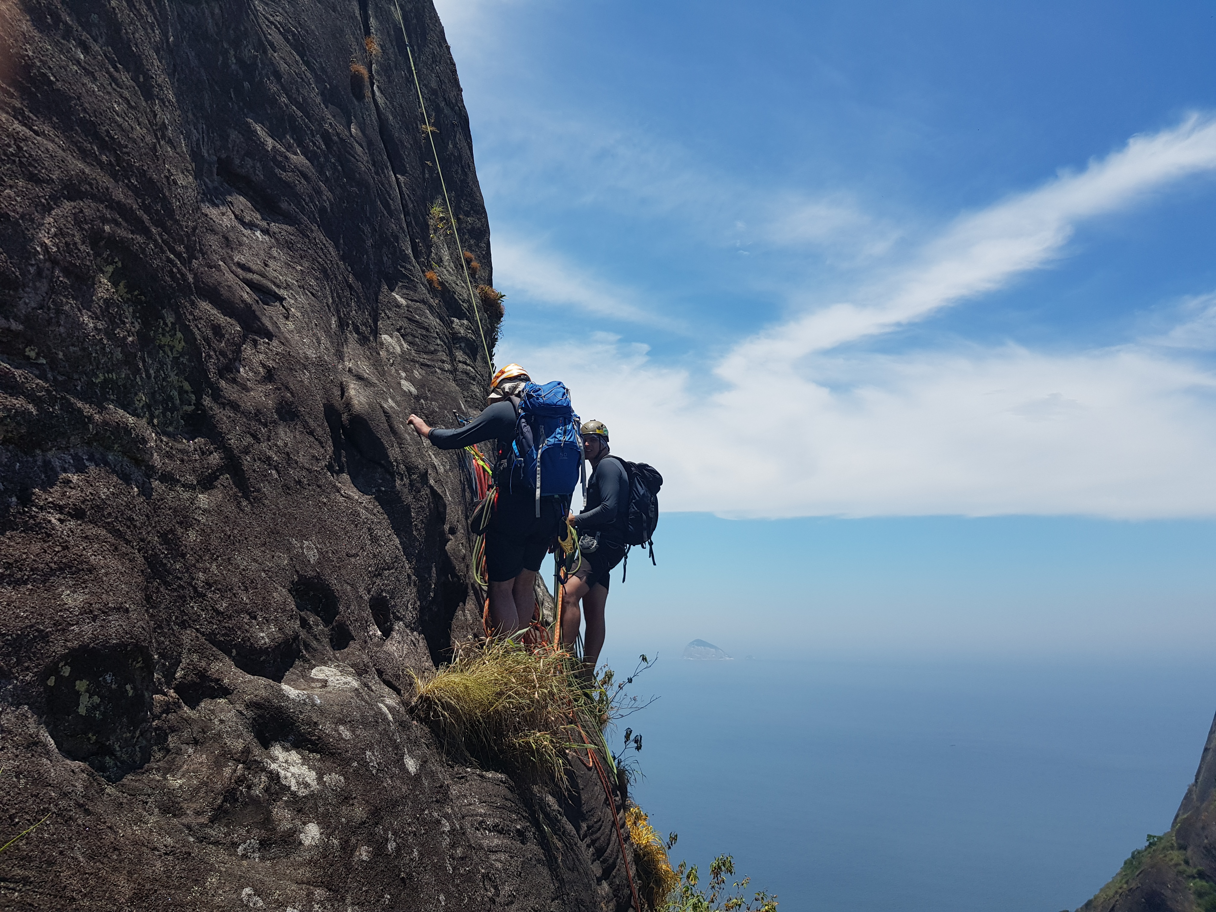 O Juliano já a conhecia de uma escalada anterior, mas o Willian estava bem curioso para encarar uma das vias clássicas do Rio de Janeiro. Extremamente desgastados pela intensa atividade no dia anterior já na trilha sentiram o cansaço pegar forte naquele calor todo. Na base da via pegaram dicas sobre outras vias com uma dupla que se encordava enquanto observavam um casal evoluindo na vizinha Cavalo Louco.