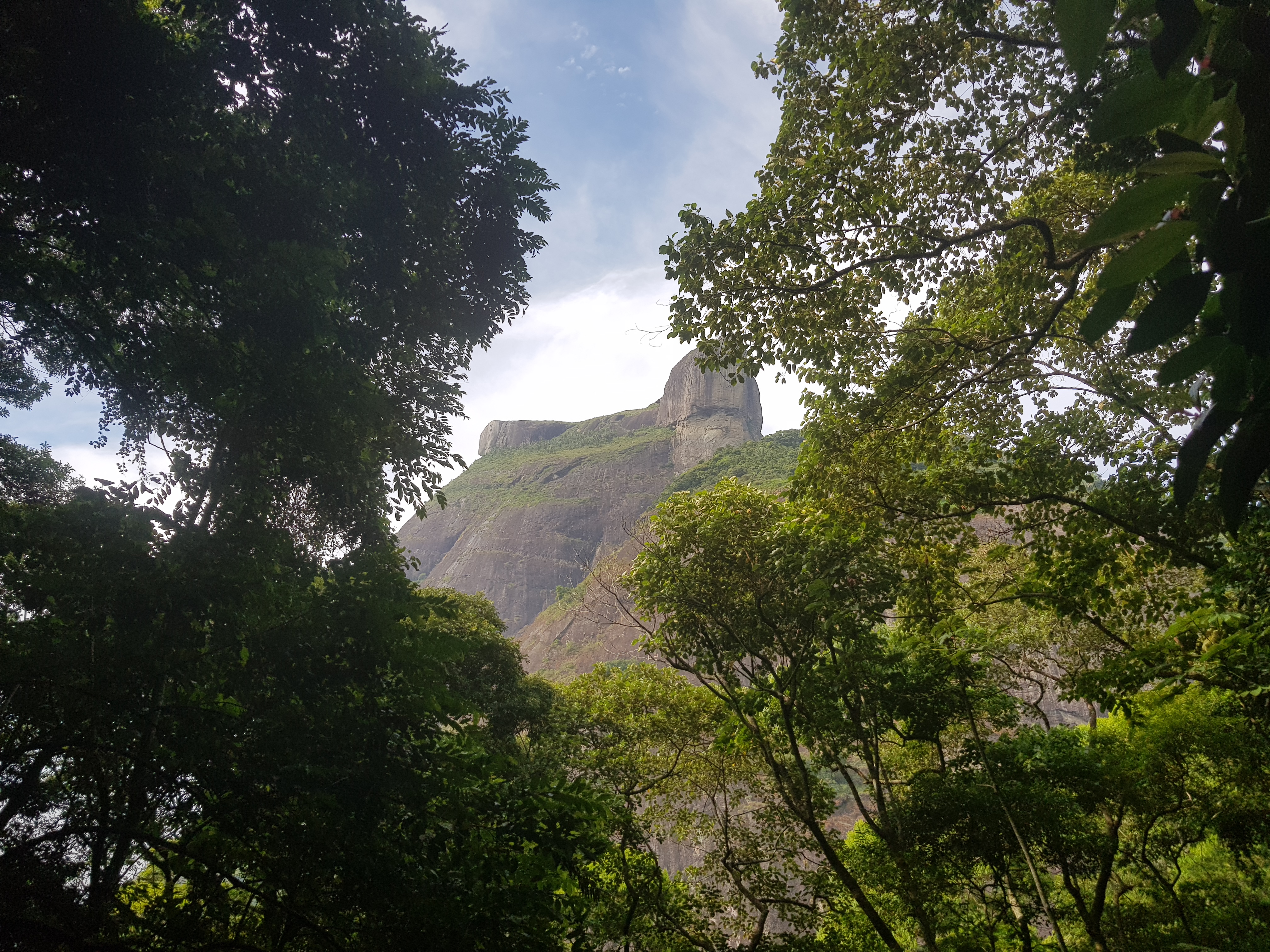 No selado que separa a Pedra da Gávea fizemos uma pausa longa para refrigerar depois de 60 minutos de caminhada e o bosque continua a direita até encostar na Pedra Bonita. Mais alguns “lancezinhos de trepa pedra e trepa mato”, ultrapassamos a proteção das árvores e o sol nos atinge em cheio na pinha. O que já era ruim ultrapassa a linha do suportável e o que estava no estômago começa a azedar. Pouco antes da base da via virei pro Natan e mandei guardar a corneta.