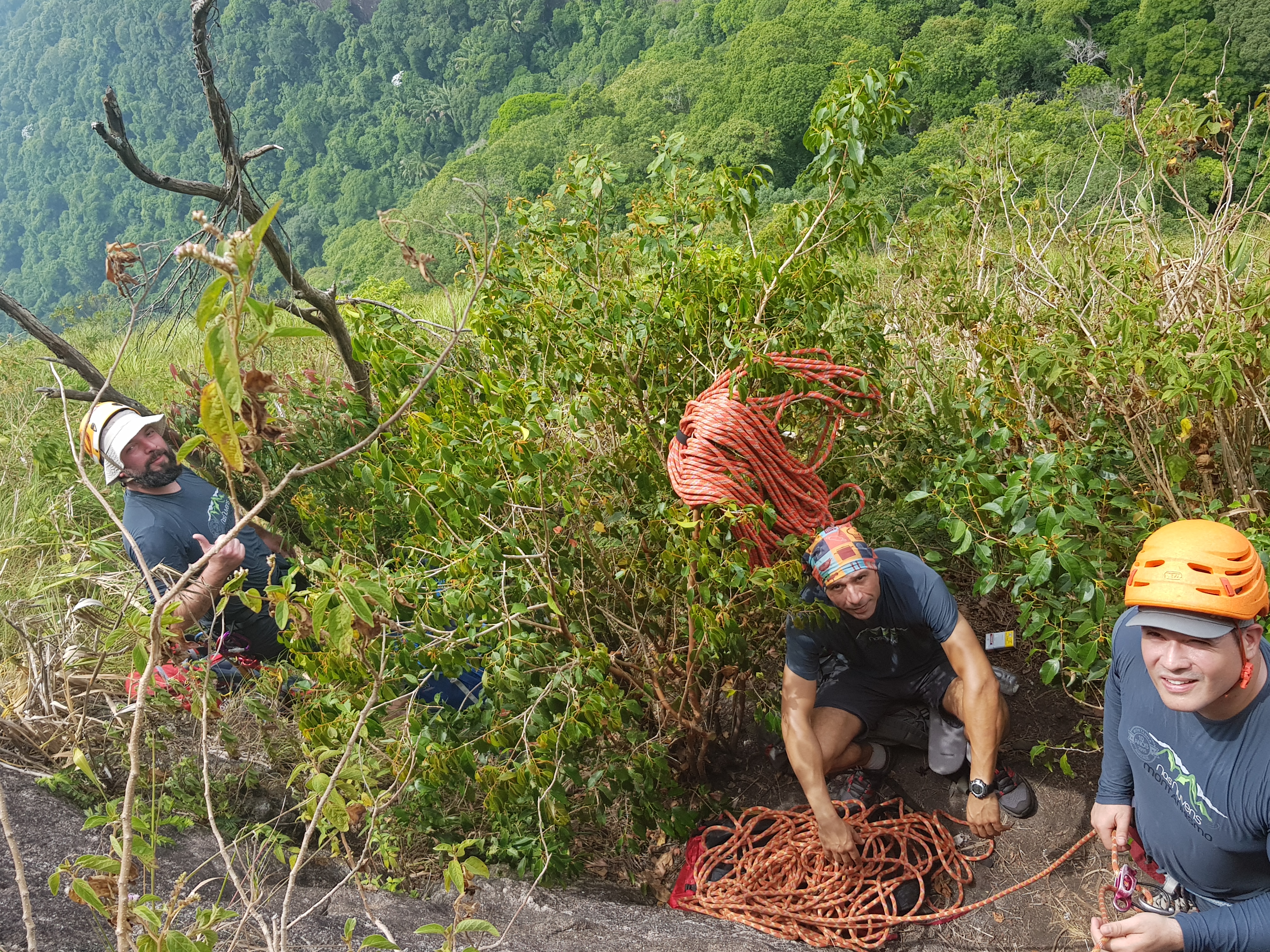 As 10h30, em reunião na P1 decidiram rapelar os 35 metros até a base numa só tacada, vencidos pelo calor e pela necessidade de fazer o checkout no hotel antes das 14h00. A temperatura e o cansaço não permitiriam velocidade suficiente para nos encontrar no cume em tempo de cumprir nossa agenda para o dia.